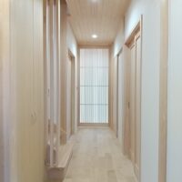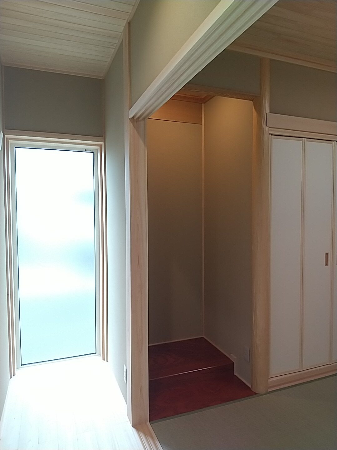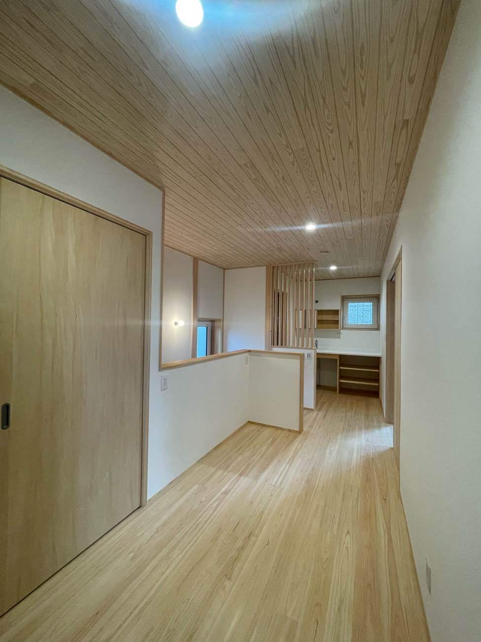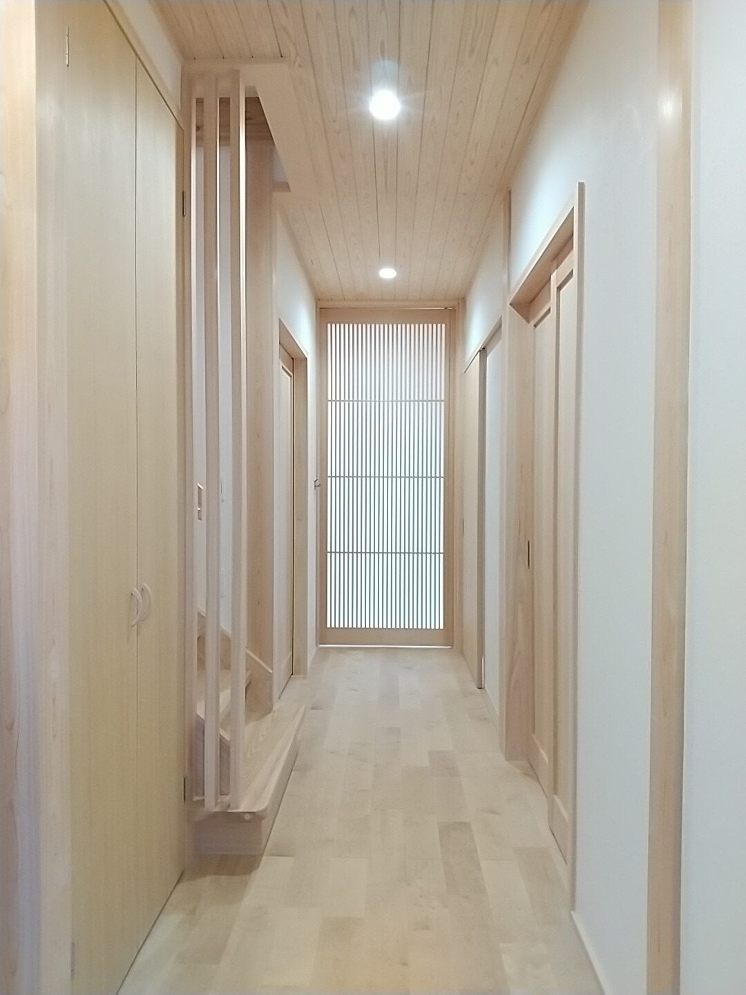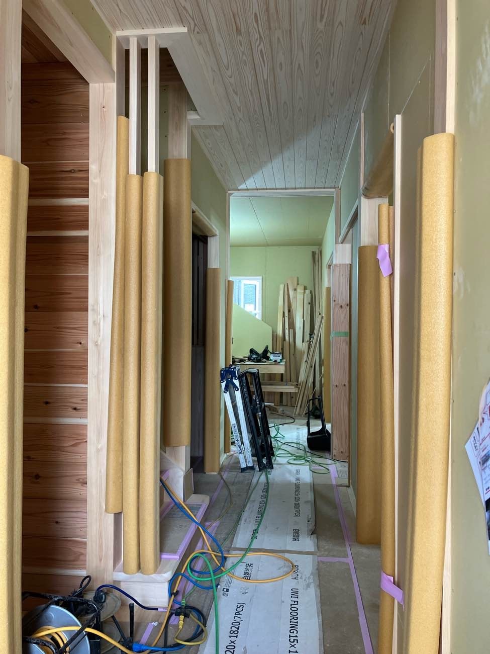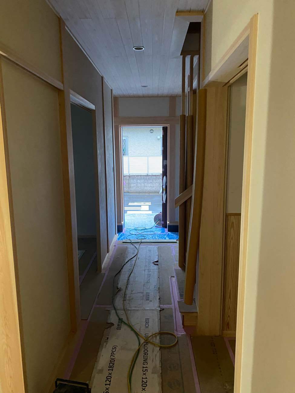 クリーニング工事も終えて、今回は見学会は開催せず、引き渡しまで個別に内覧をさせていただいています。玄関~廊下、2階への階段室までが真壁で、柱のスパンも通常より広めにしているため、通路がゆったりとしています👍階段の真壁は贅沢な仕様ですが、それなりの事はあって、とても雰囲気がいいんですよね~