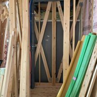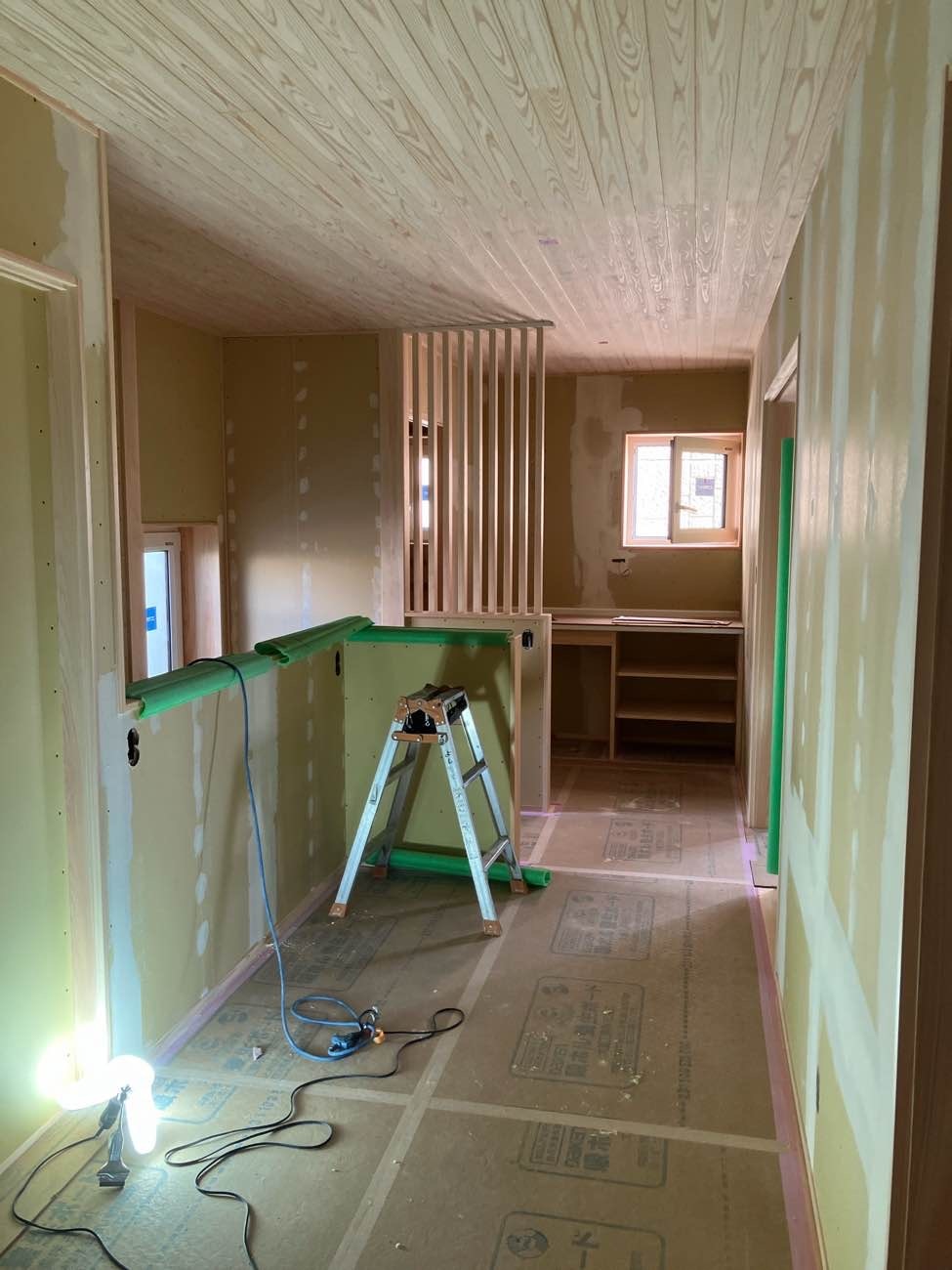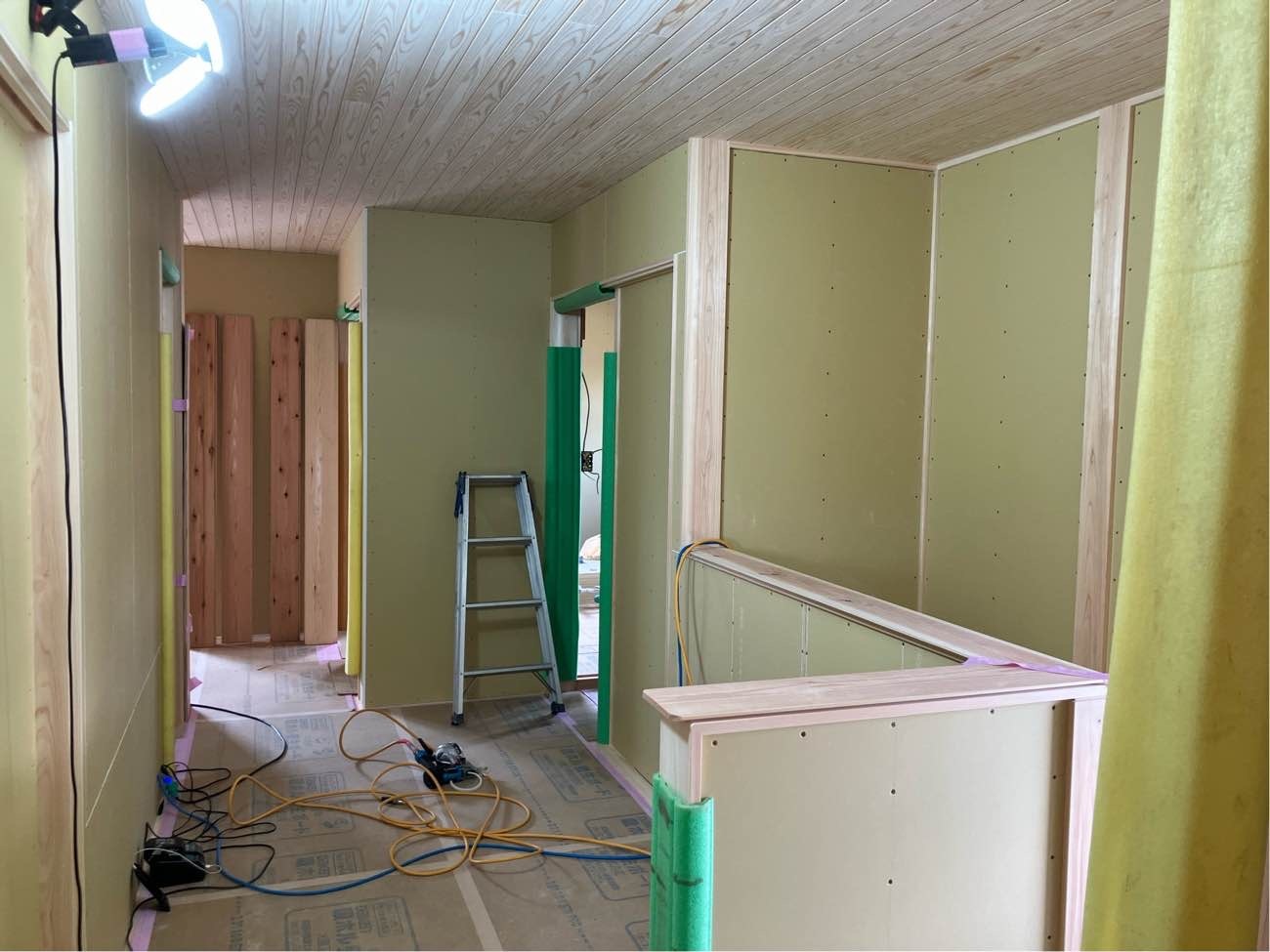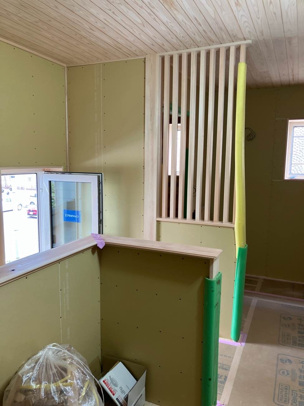 2階の階段周りの腰壁や木の格子、クロス下地のプラスターボードも張られました。
