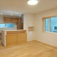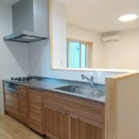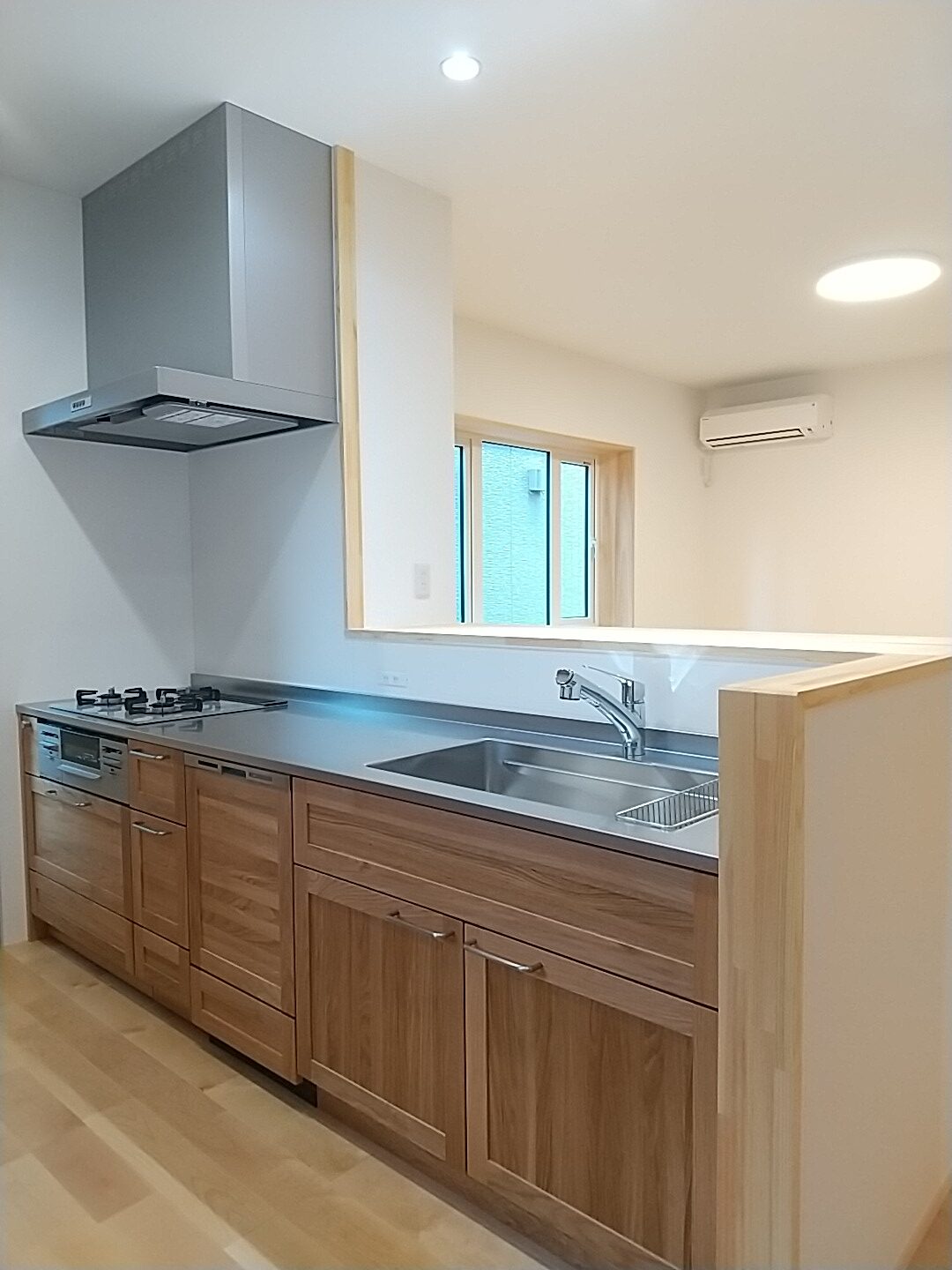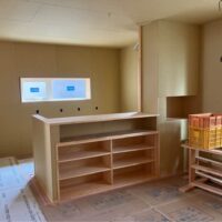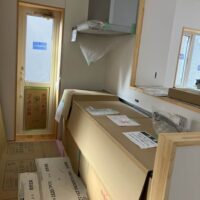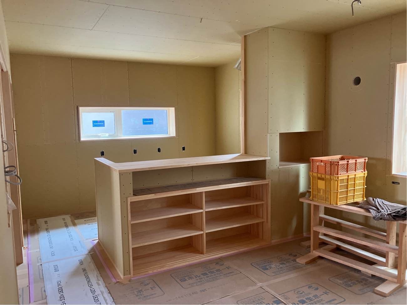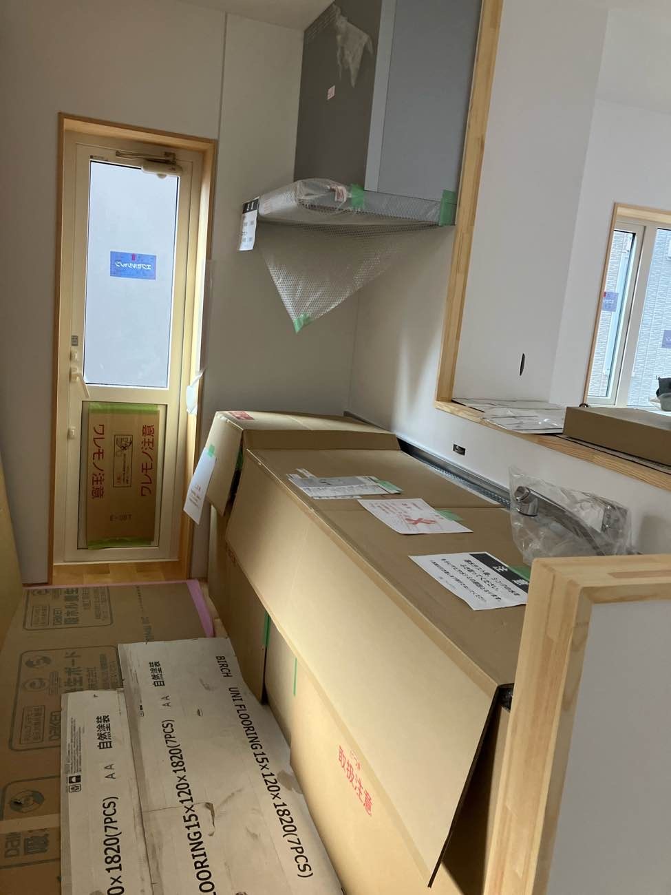 キッチンが取り付けられました。今回はカウンターの高さにこだわられてウッドワンの木製キッチンにされました。本物の無垢材を使用していますが、特殊な塗装が施されており、ソースやケチャップなど浸み込みません。嫌な塗装のテカリがほとんどなく、木の質感を楽しめる雰囲気の良いキッチンです。養生が取られる日が楽しみですね!