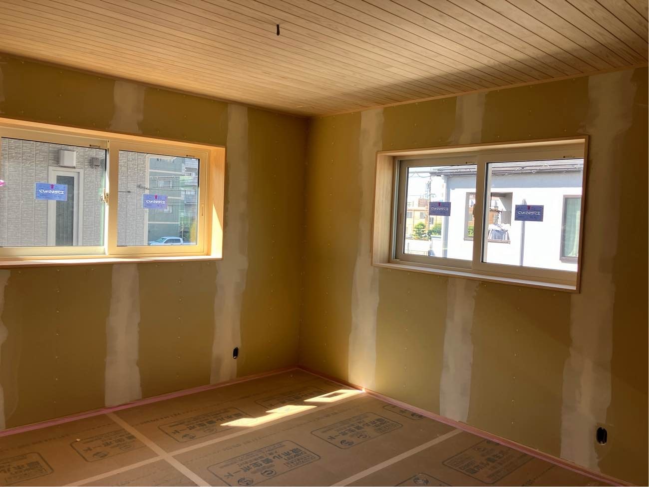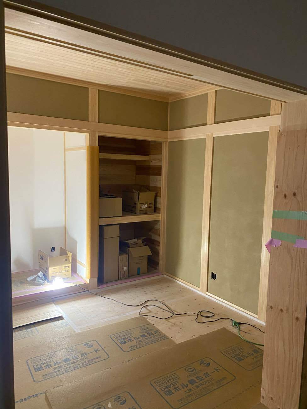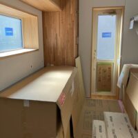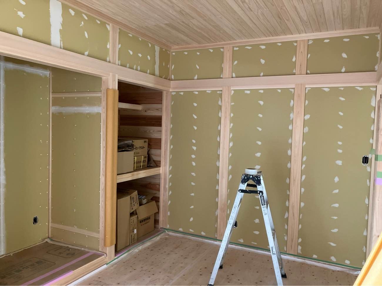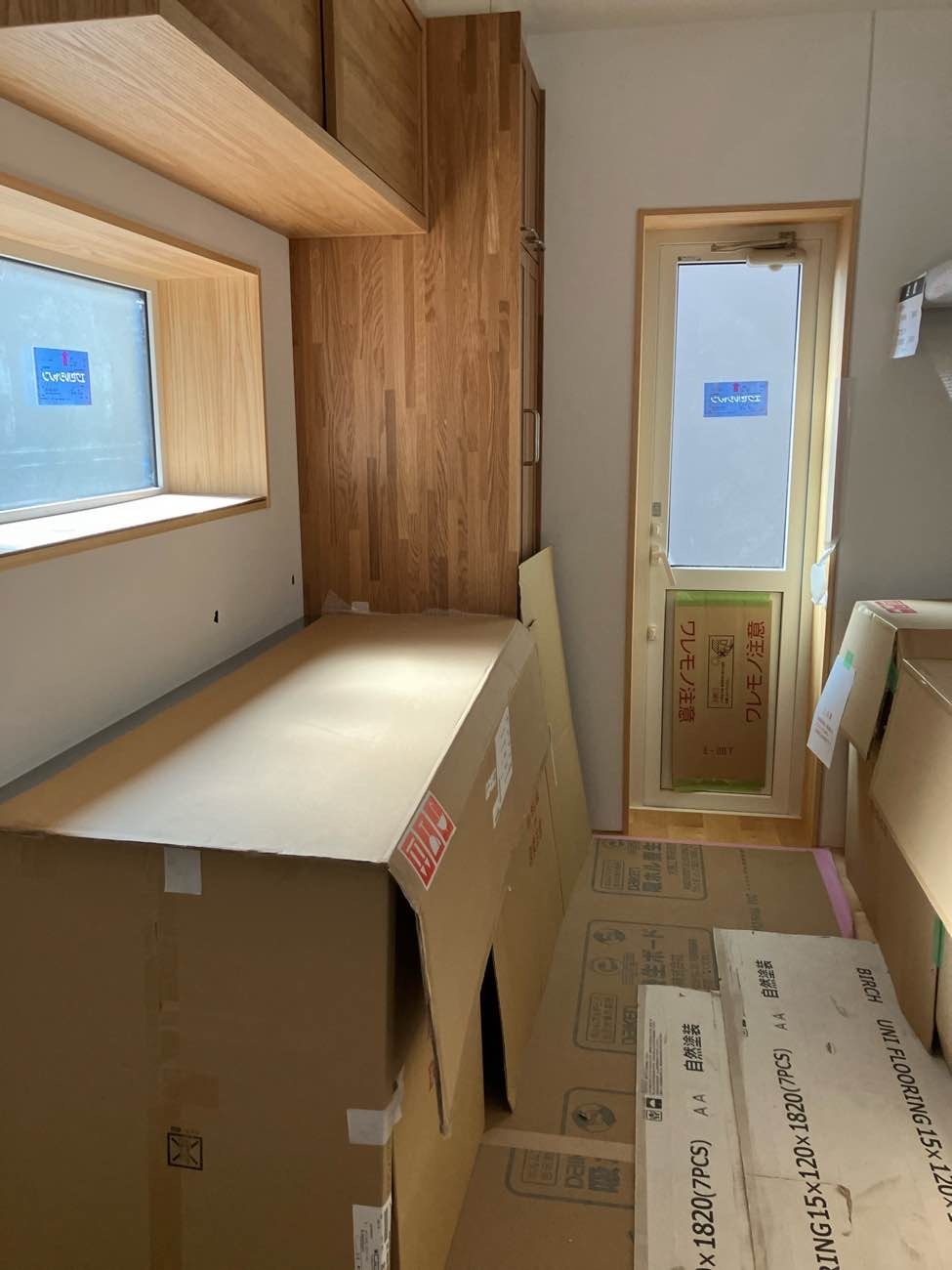 s美さんによるクロス貼り工事も進んでいます。あとちょっとで仕上げ工事が完了し、各種設備機器を取り付けていきます。