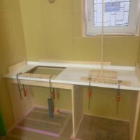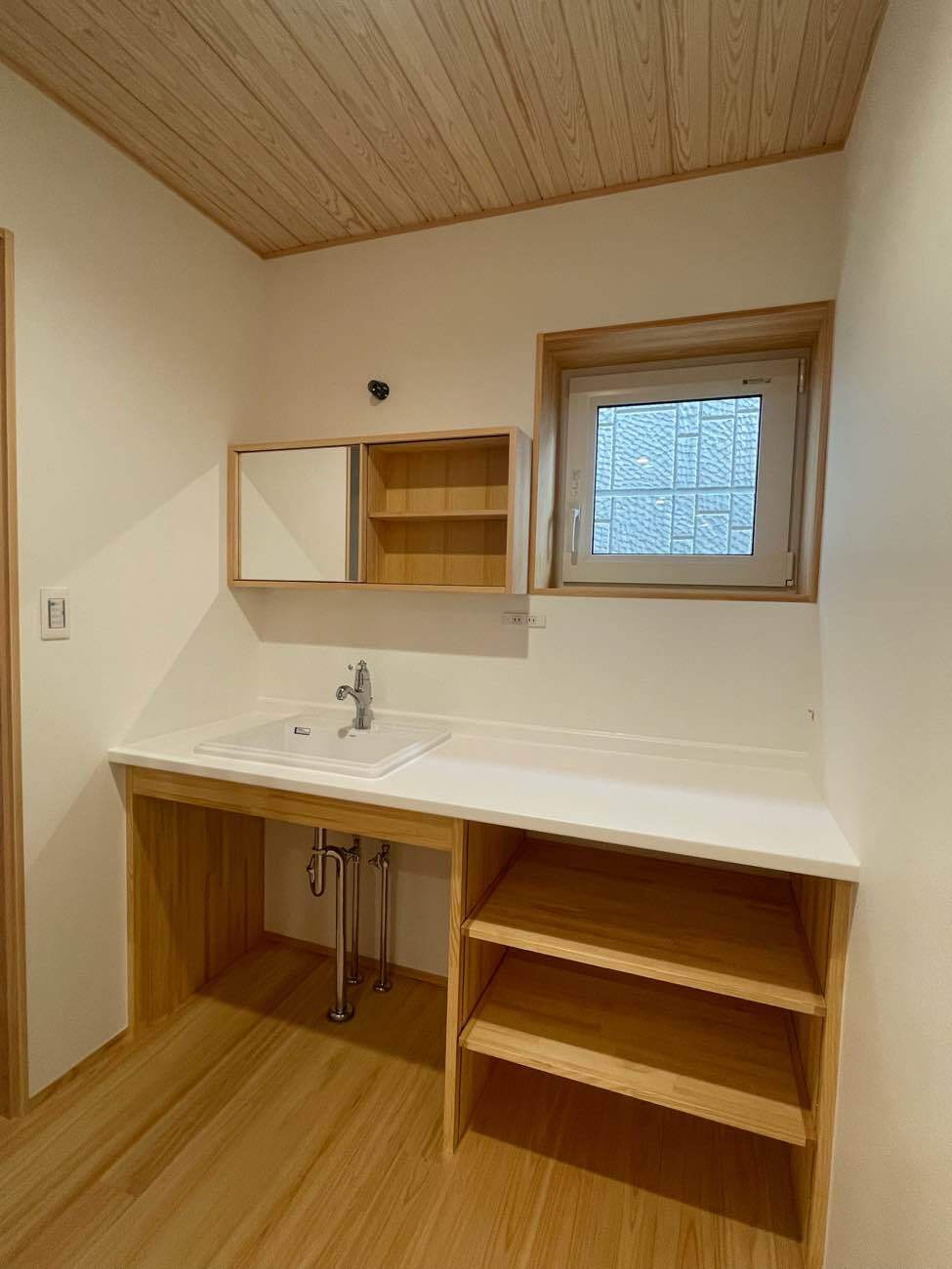 n様は、プチ二世帯。洗面でちょっとした食器を洗えるように、2階はアイカのカウンターに少し大き目の洗面ボールを入れてオリジナルの洗面化粧台にされました。出来上がりが楽しみですね。