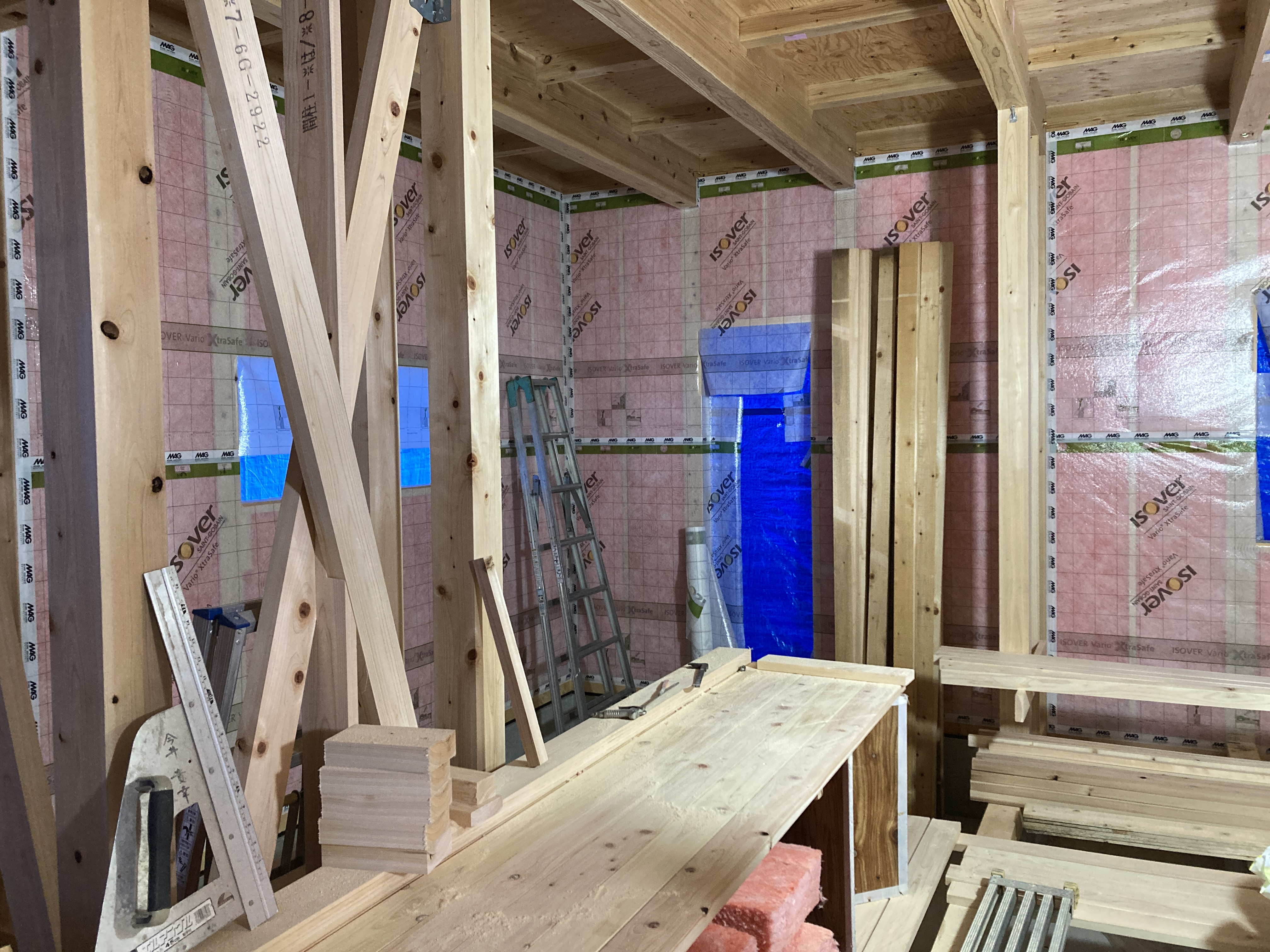 内部も、サッシ廻りの気密テープや、真壁部分の充填断熱、軒先の断熱補強など、仕上がってしまうと見えなくなってしまう大切な部分を施工しています。