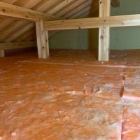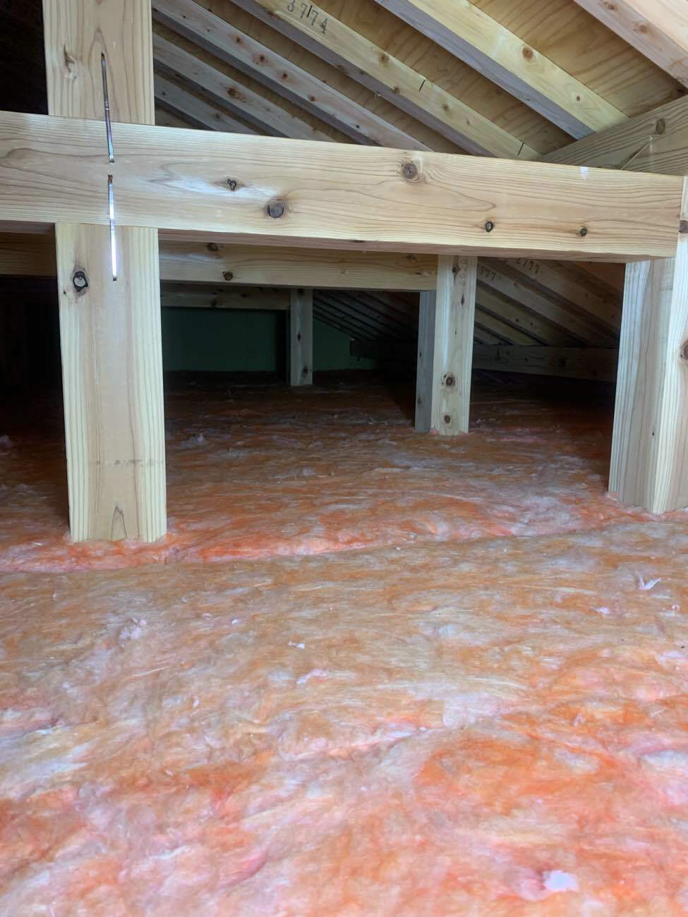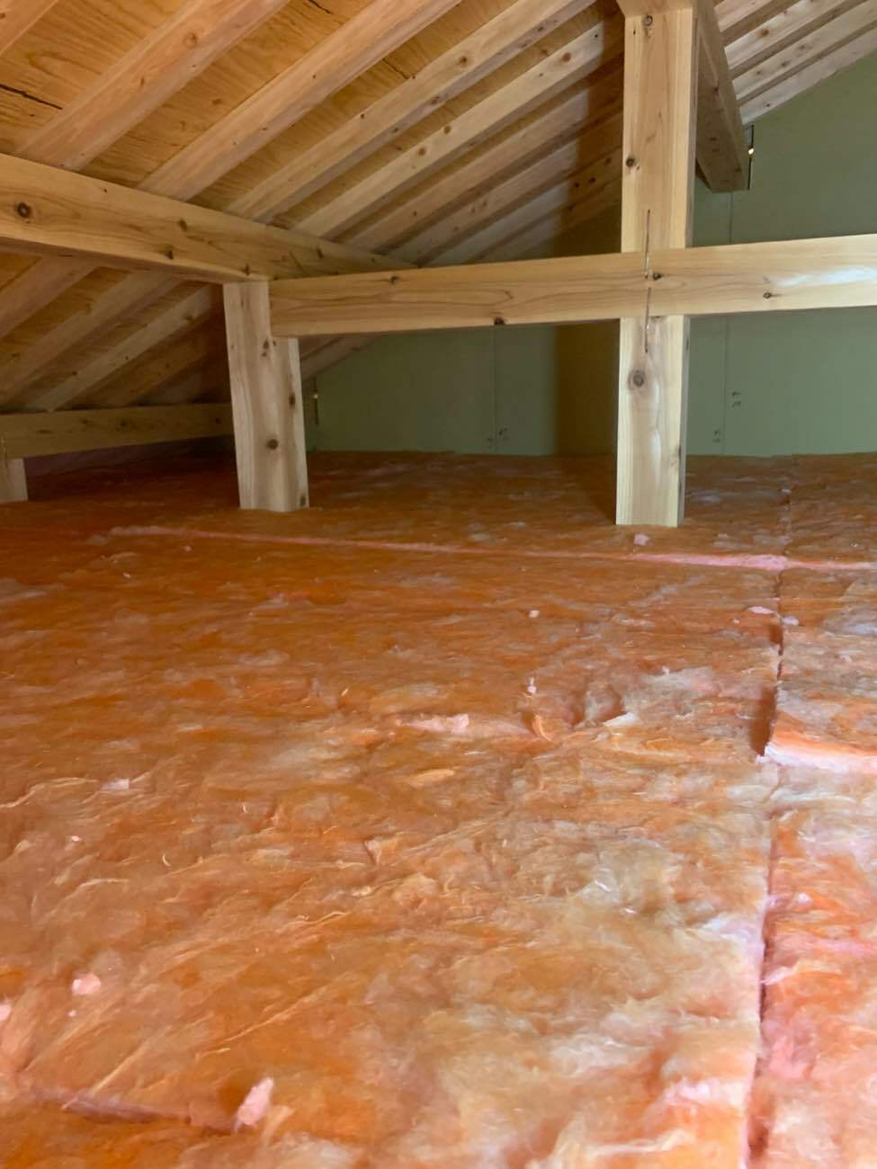 次に高性能グラスウールを敷き、大引きに直交させるように根太材を取り付けて、その間に押出法ポリスチレンフォームを嵌めています。この写真の方がn様に伝わり易い!棟梁ありがとうございました。