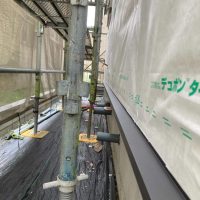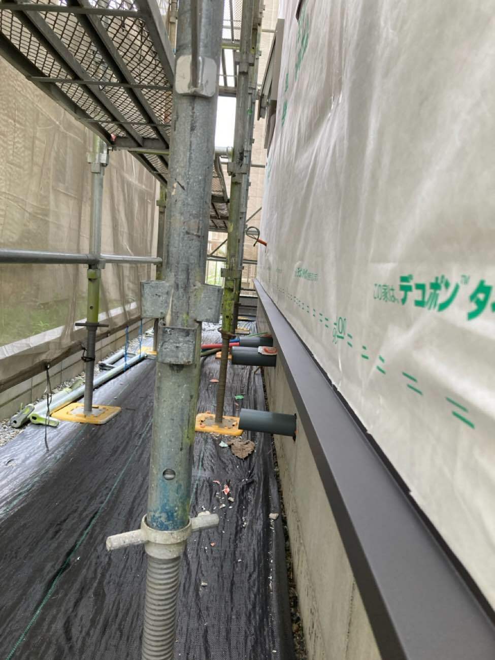 外部は、板金屋さんが土台水切りを取り付けました。外壁工事も梅雨の合間を縫いながら進めていきます。
