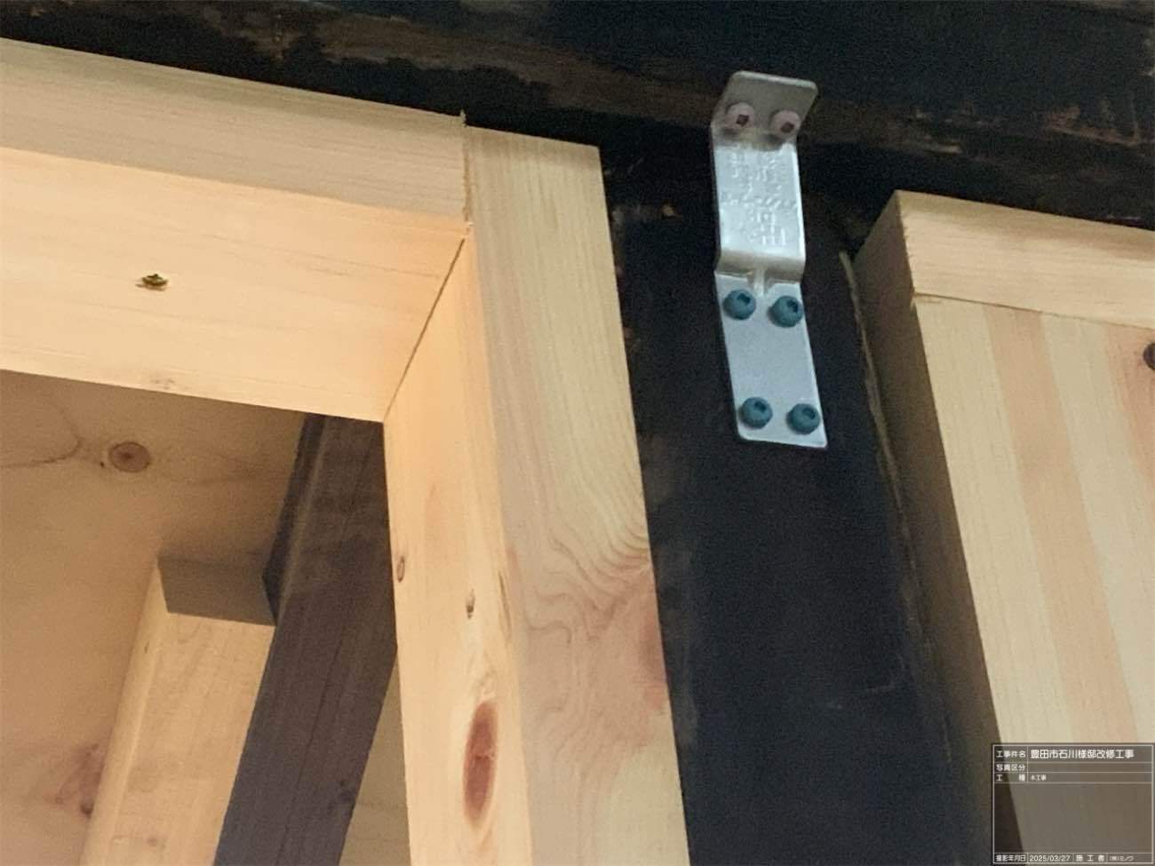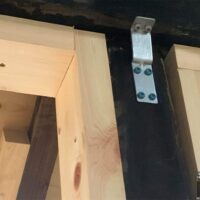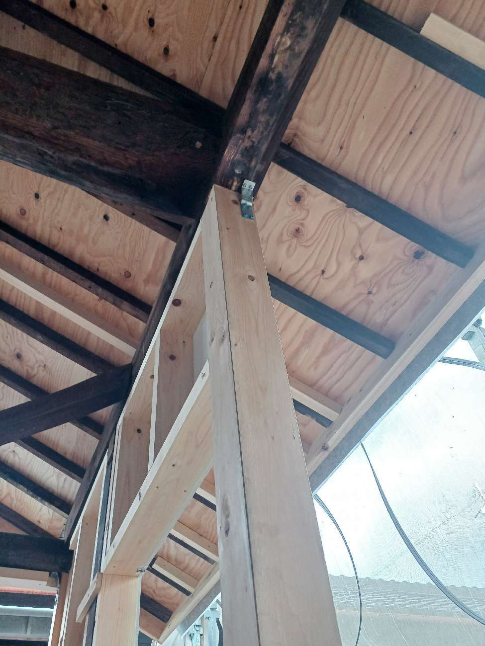 古屋の耐震強度を少しでも高めるために現代の計算で金物を敷設。接合金物とともに構造用体力面材も敷設します。