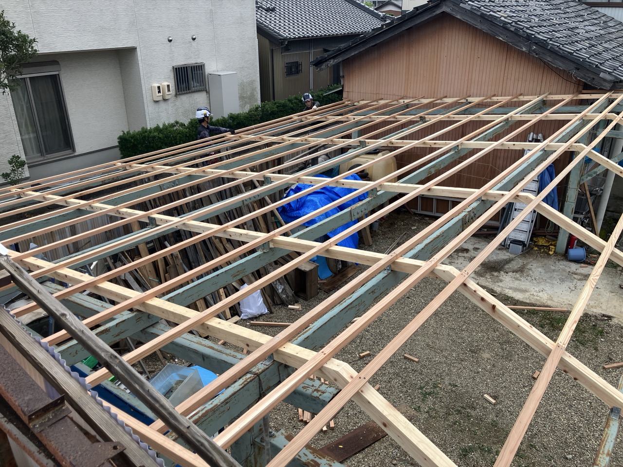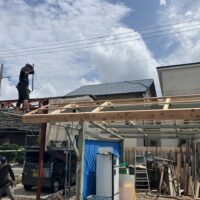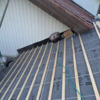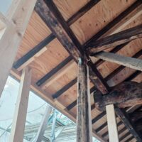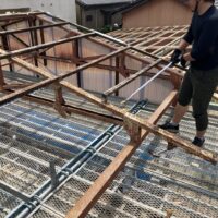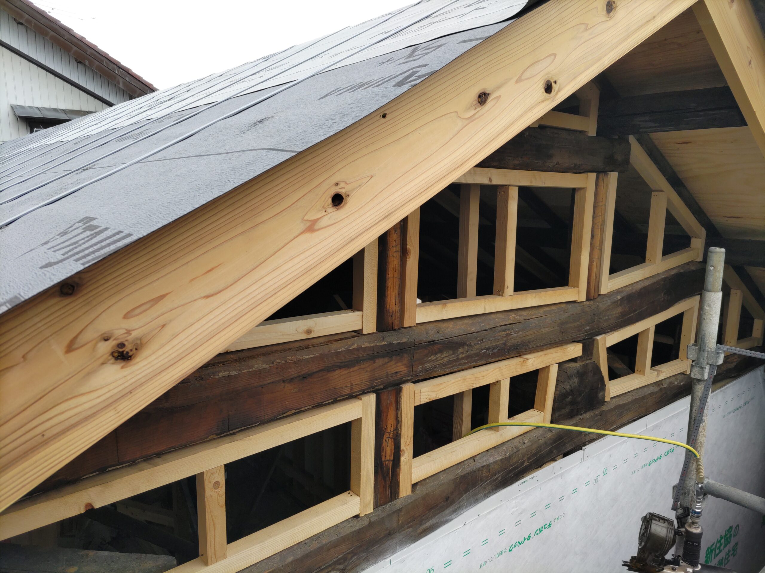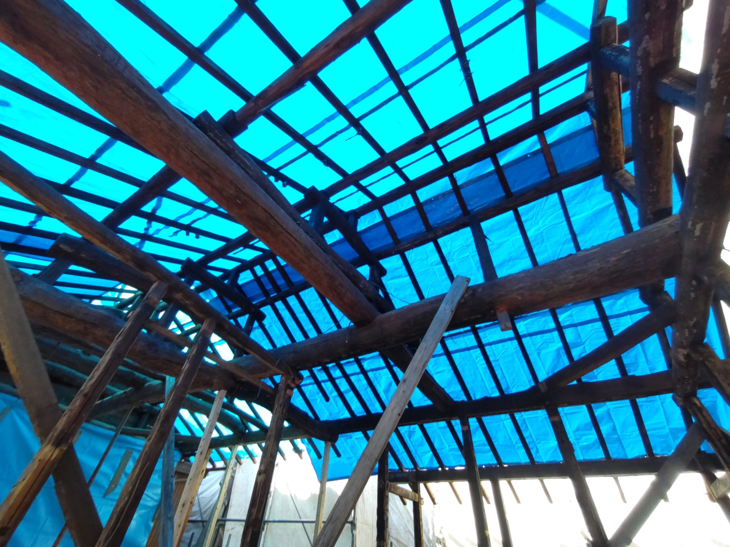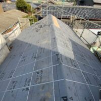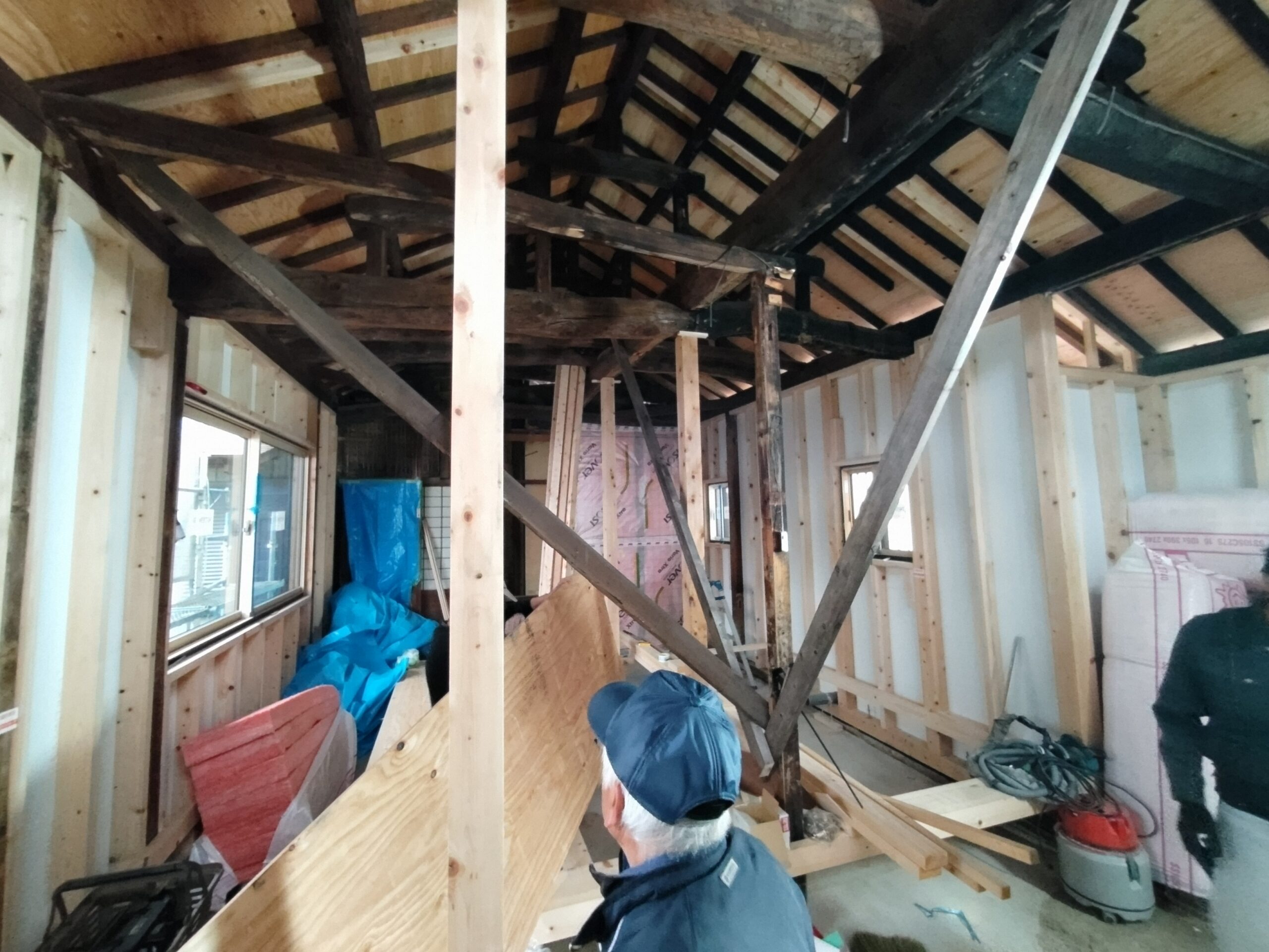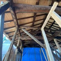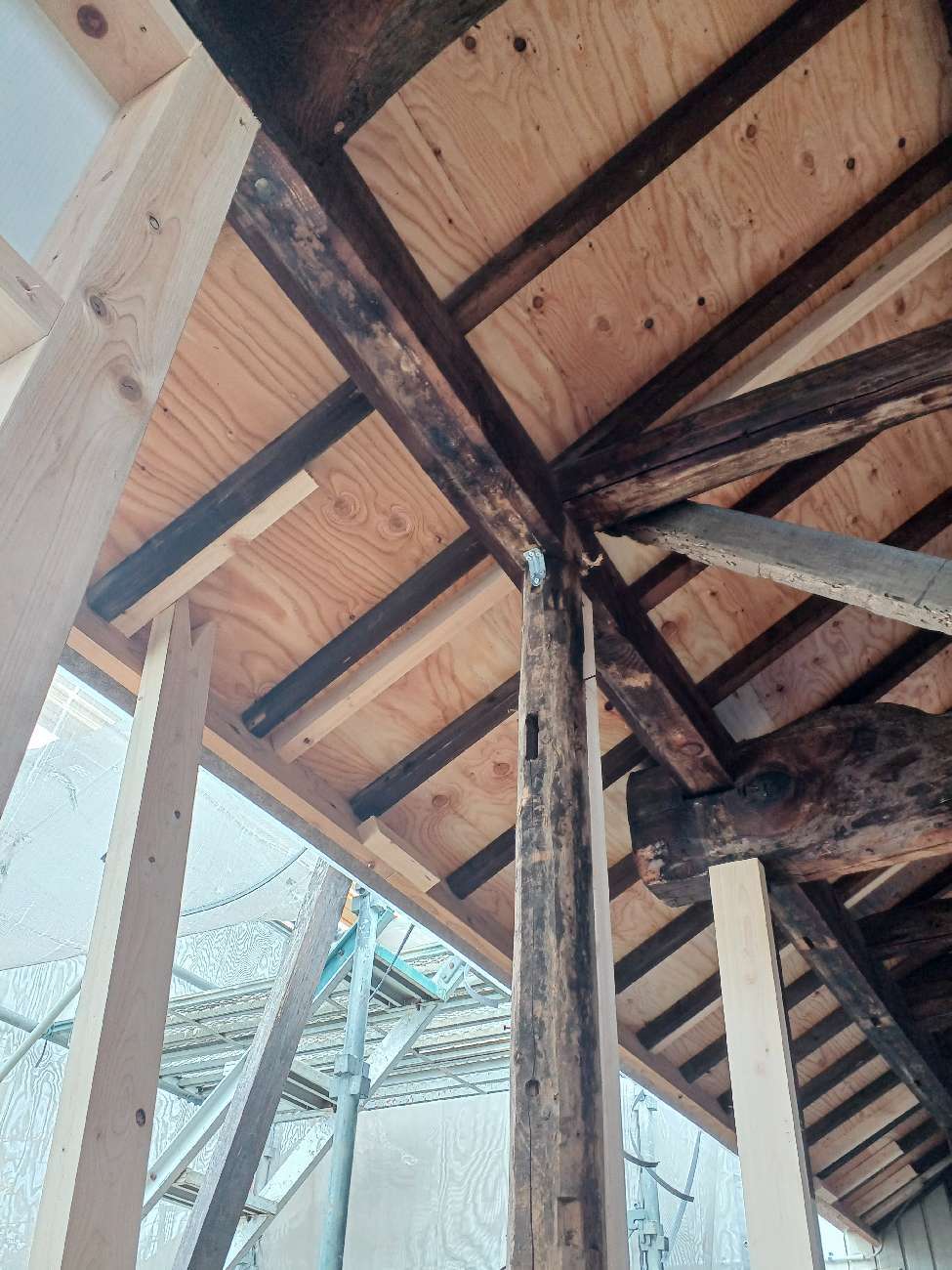 1階で構造補強をしている傍ら、h典大工さんに手伝いに来てもらって屋根下地とルーフィング敷設作業をしてもらいました。これで雨天になっても下で作業ができます。