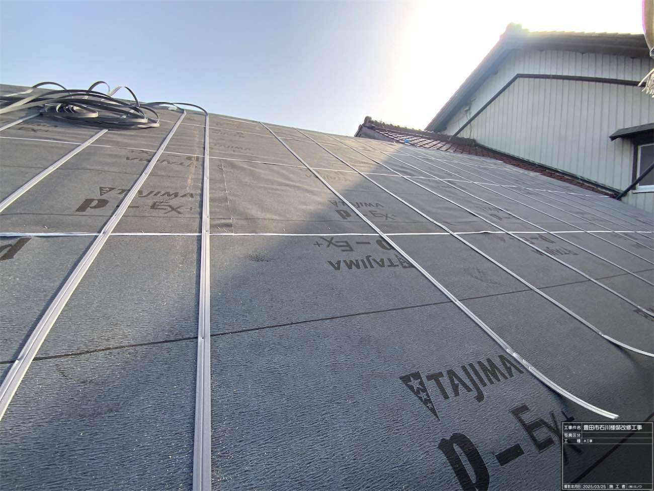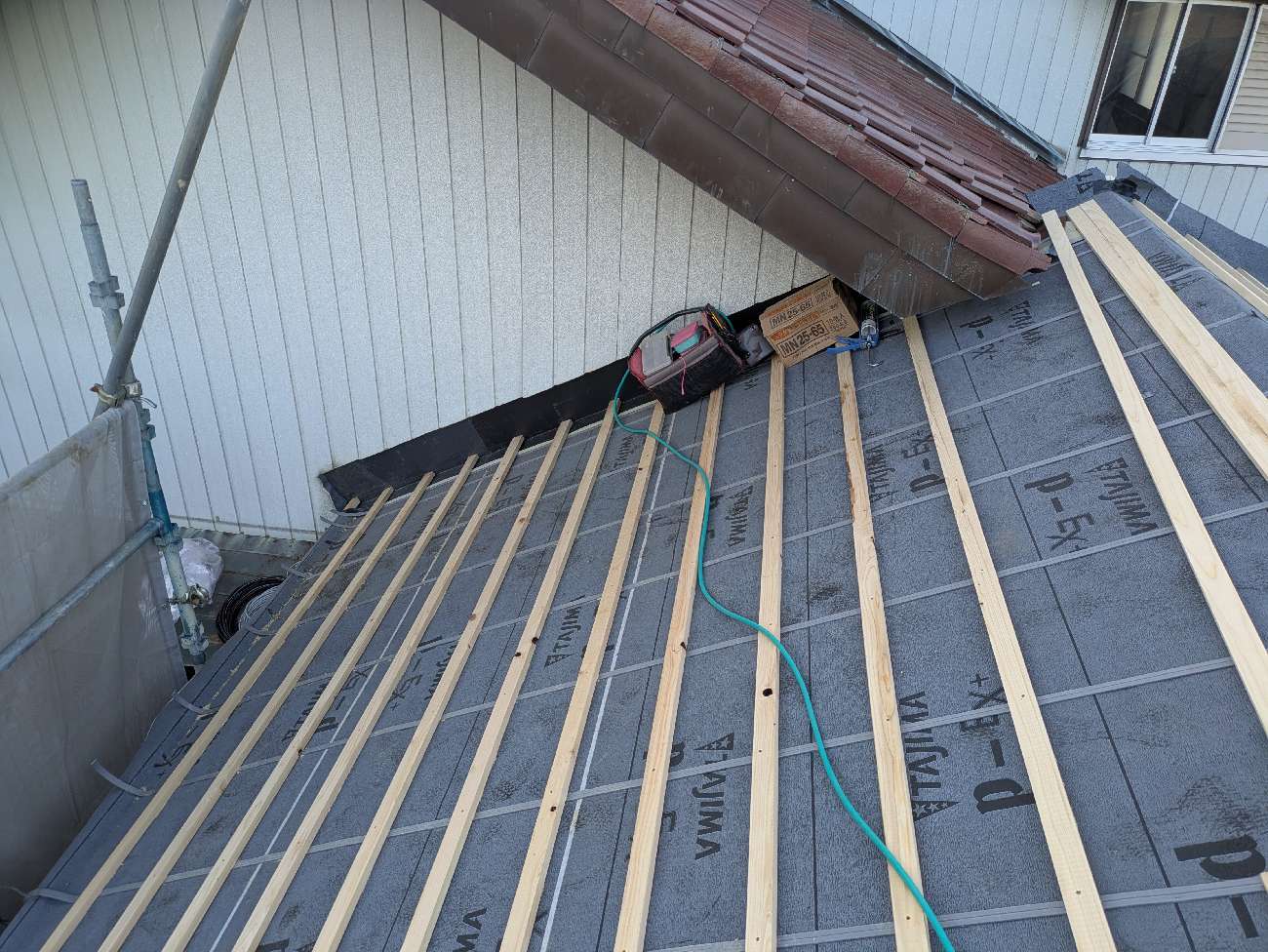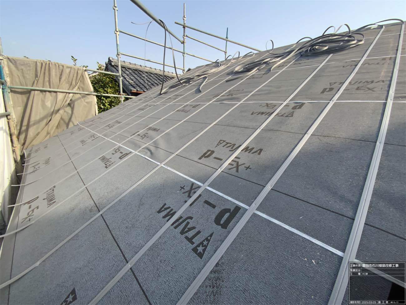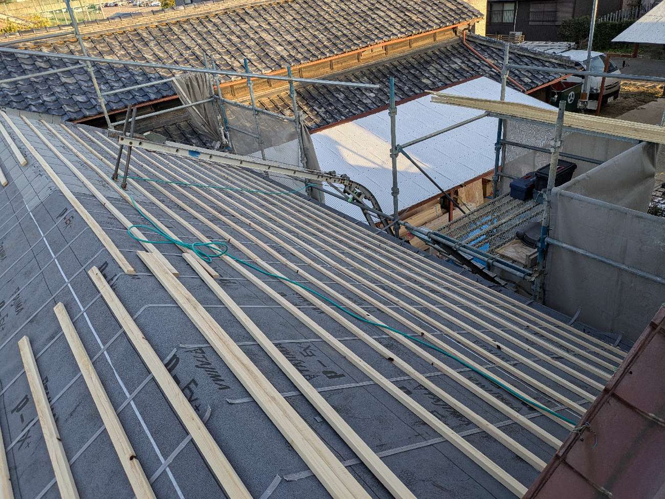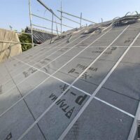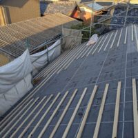 1階で構造補強をしている傍ら、h典大工さんに手伝いに来てもらって屋根下地とルーフィング敷設作業をしてもらいました。これで雨天になっても下で作業ができます。