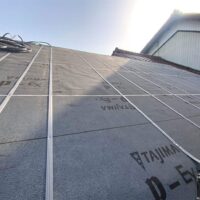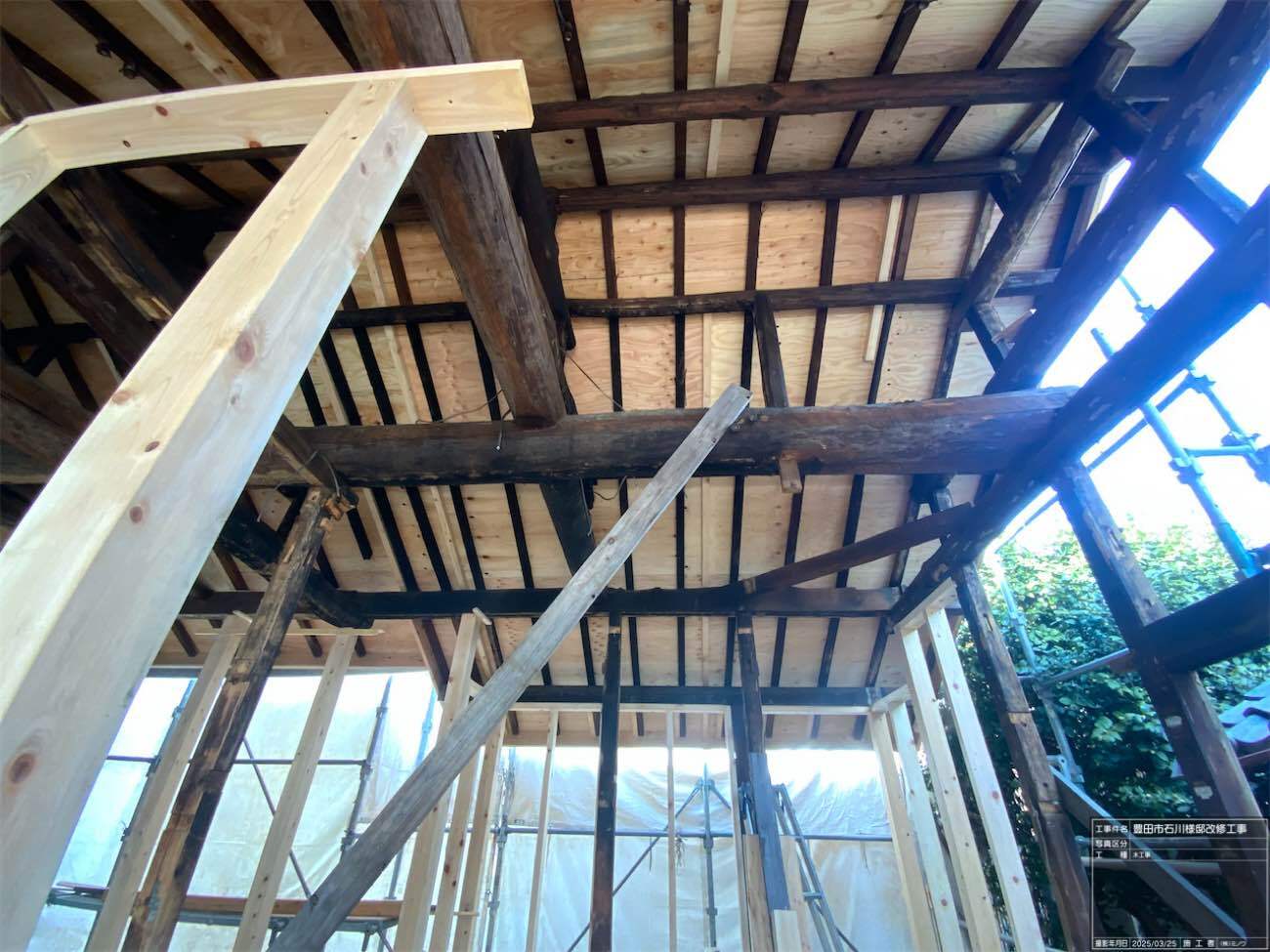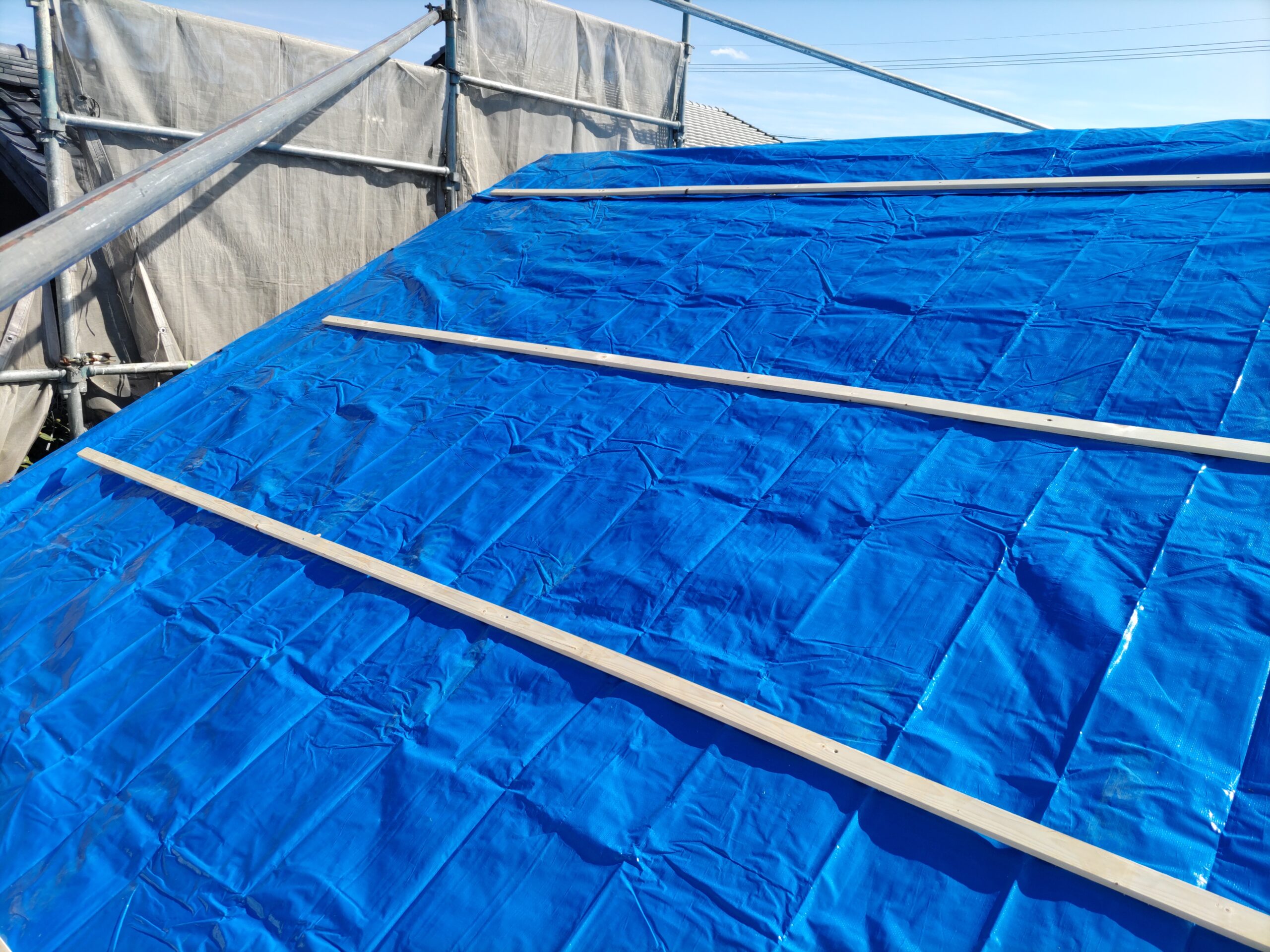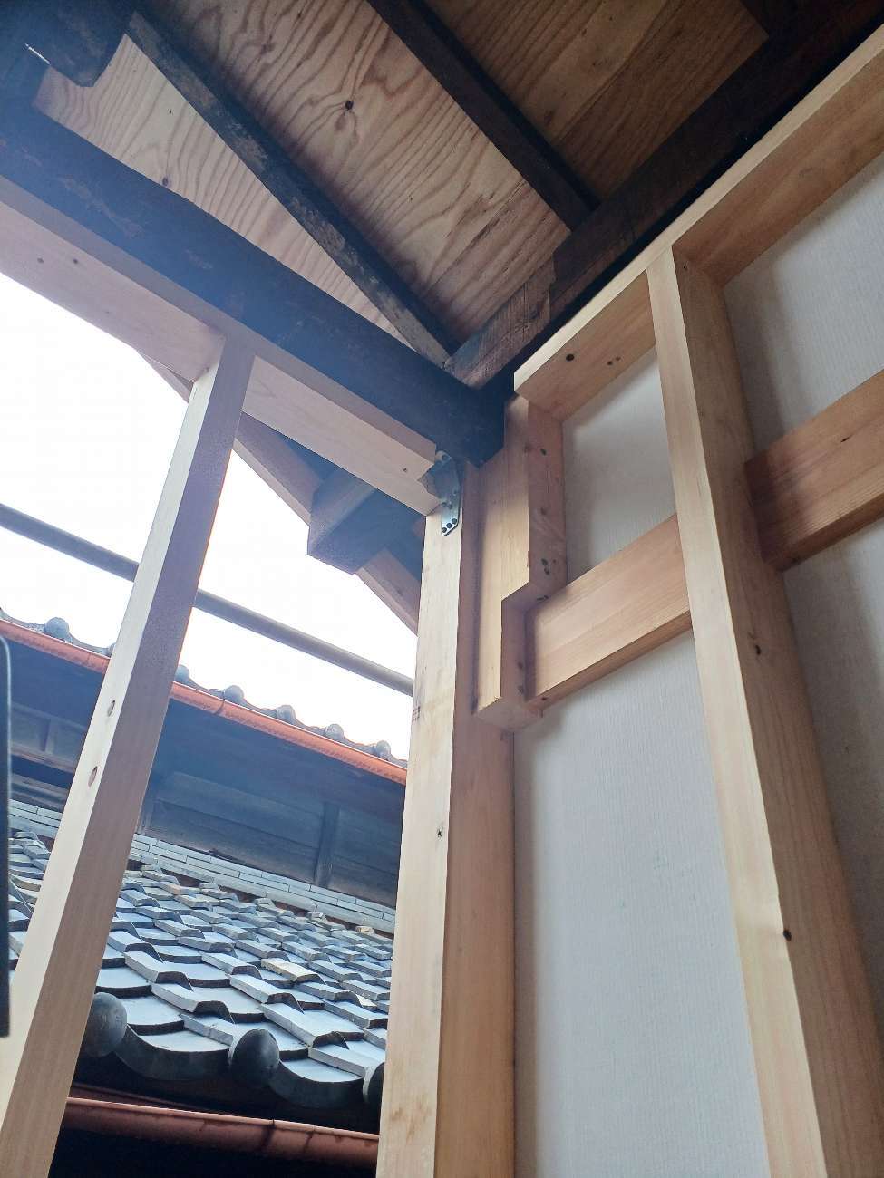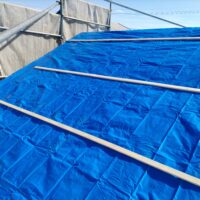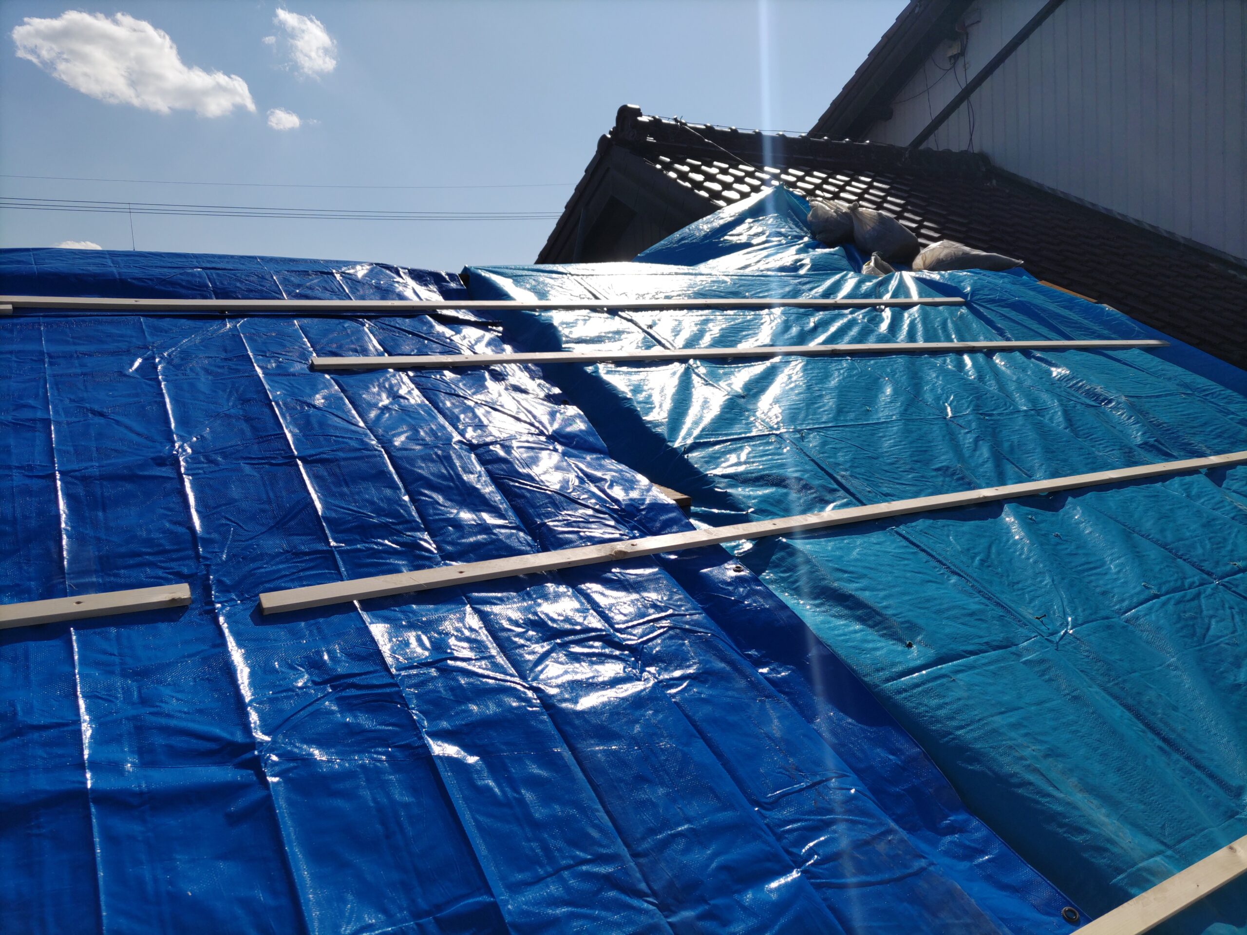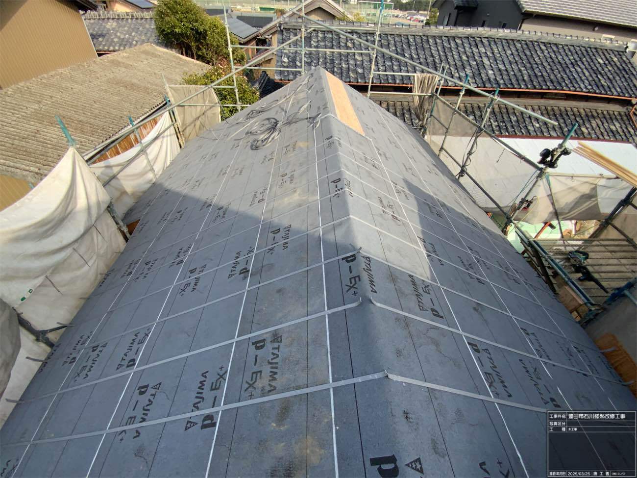 1階で構造補強をしている傍ら、h典大工さんに手伝いに来てもらって屋根下地とルーフィング敷設作業をしてもらいました。これで雨天になっても下で作業ができます。