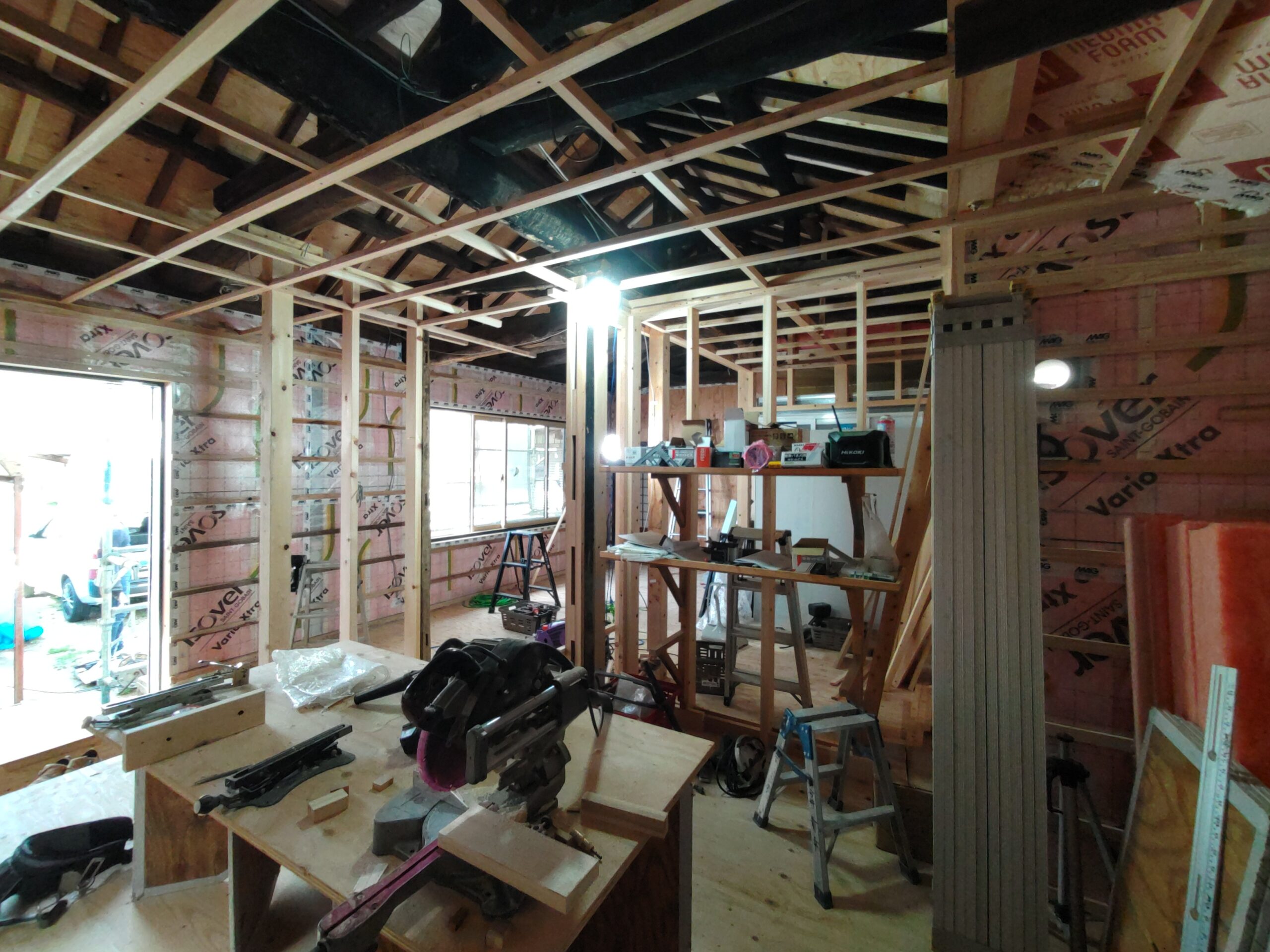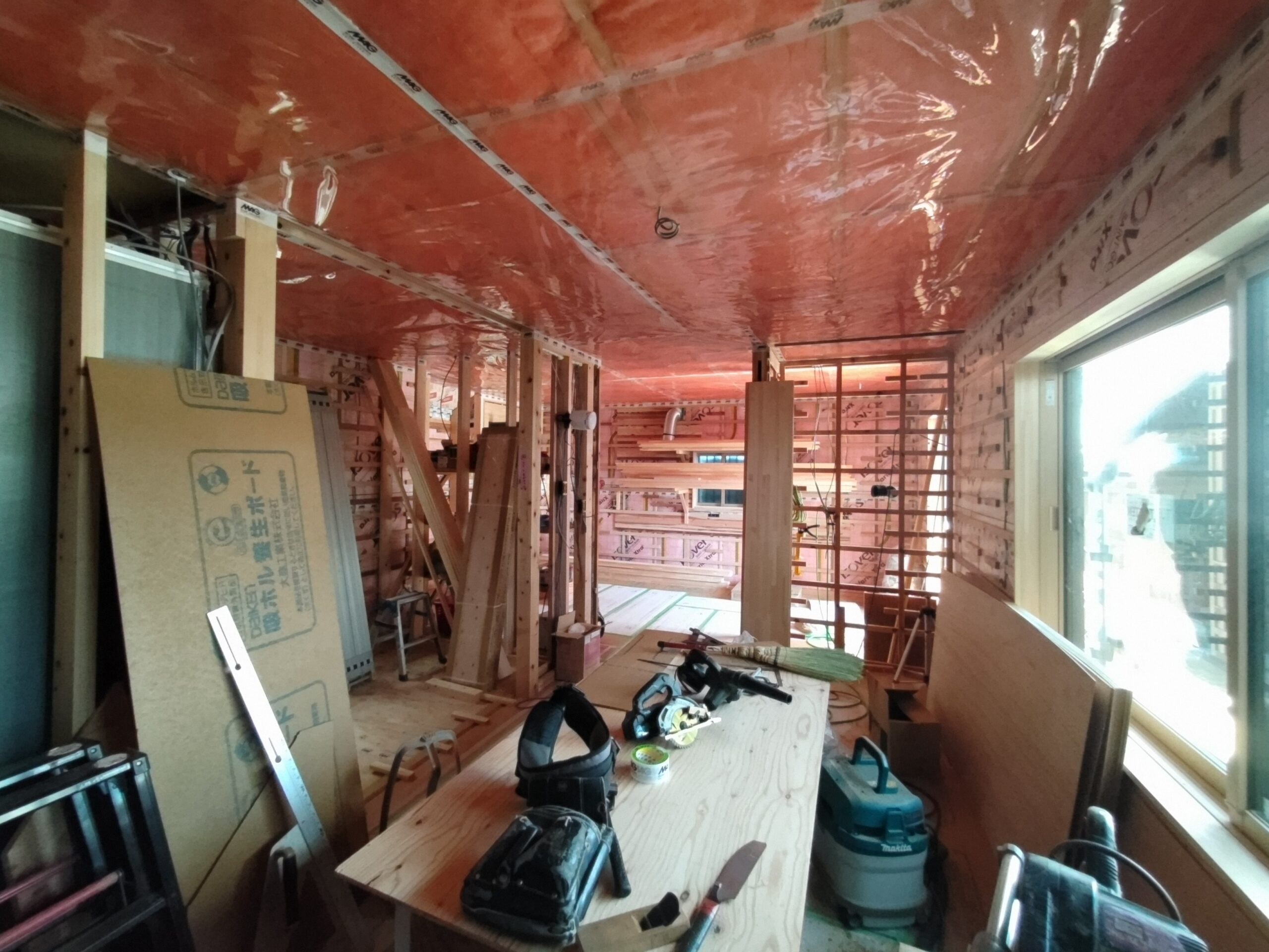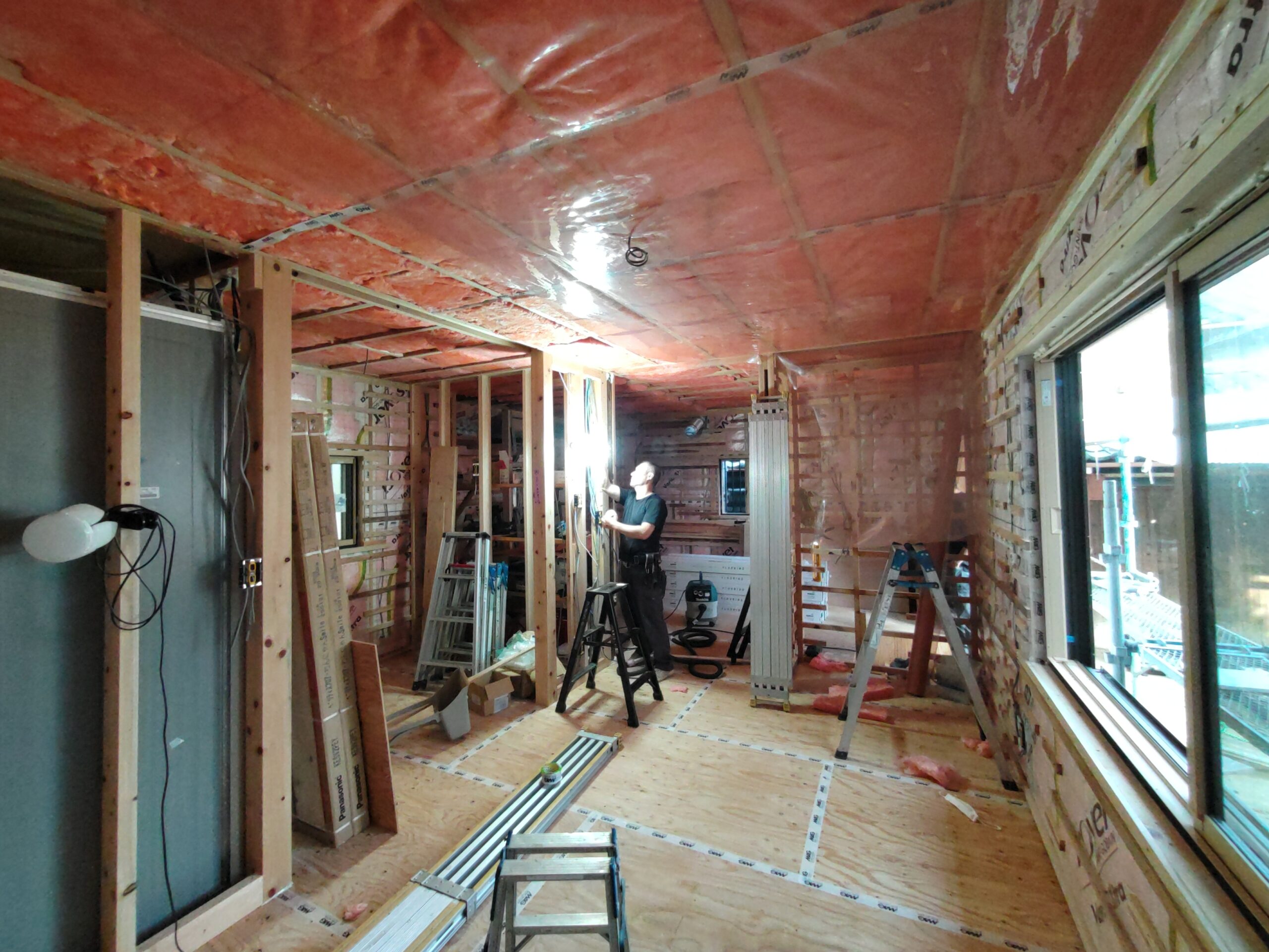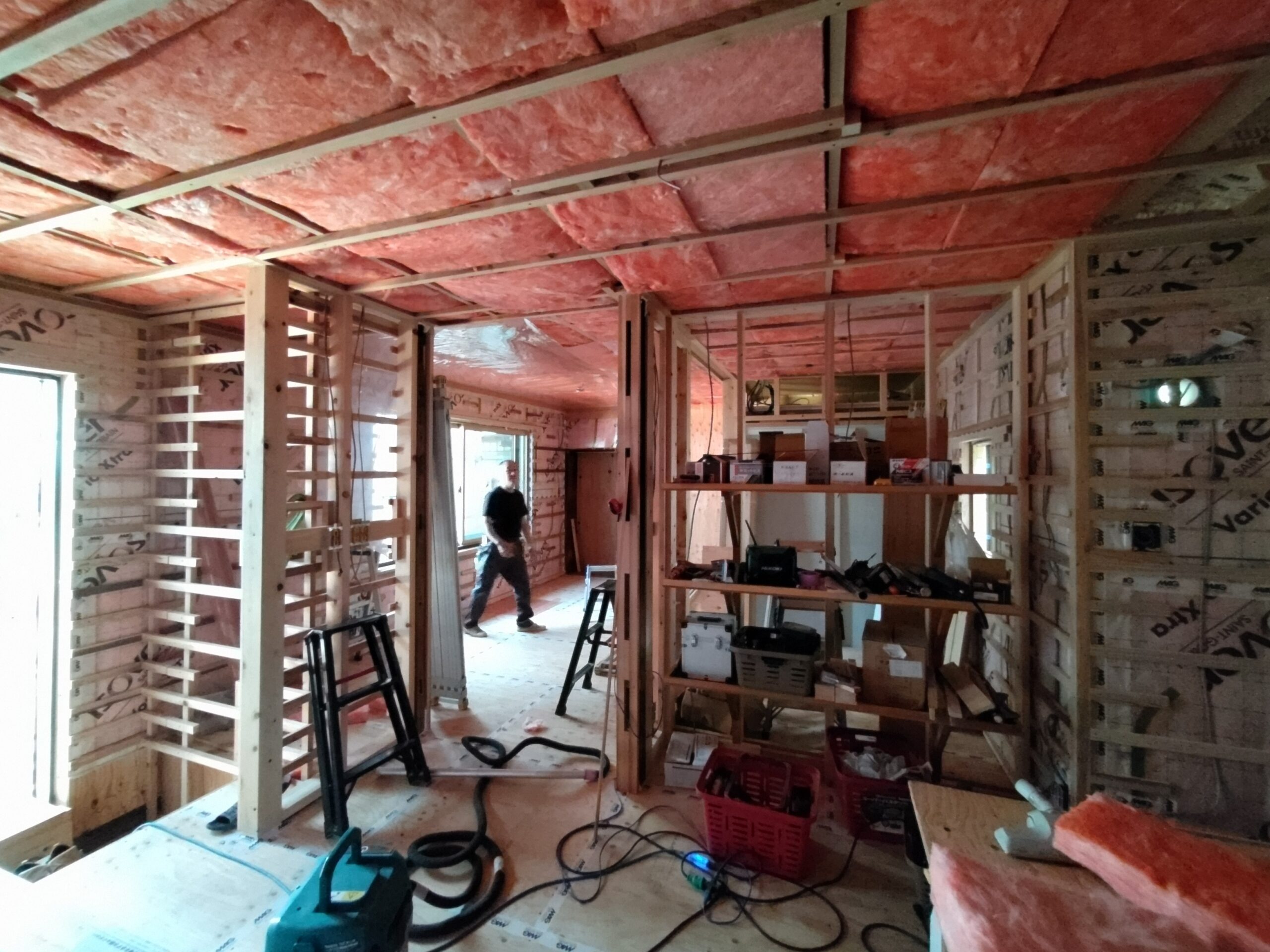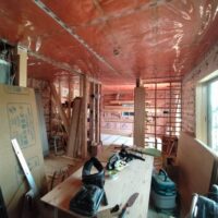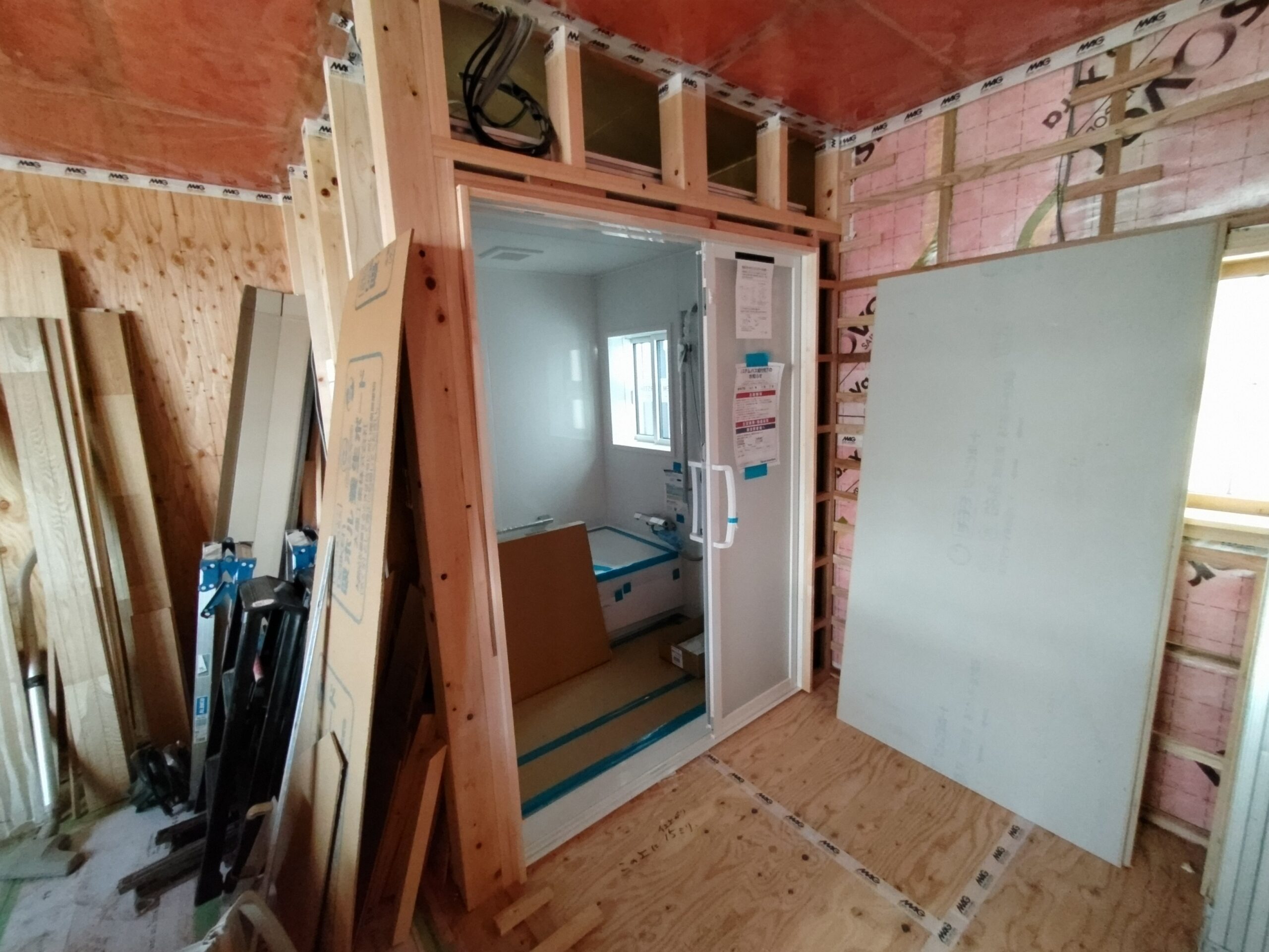 壁の断熱材敷設はあらかた終了し、明日はユニットバスが施工されるとの事。棟梁はこれから間仕切壁の下地を建てる作業に入ります。