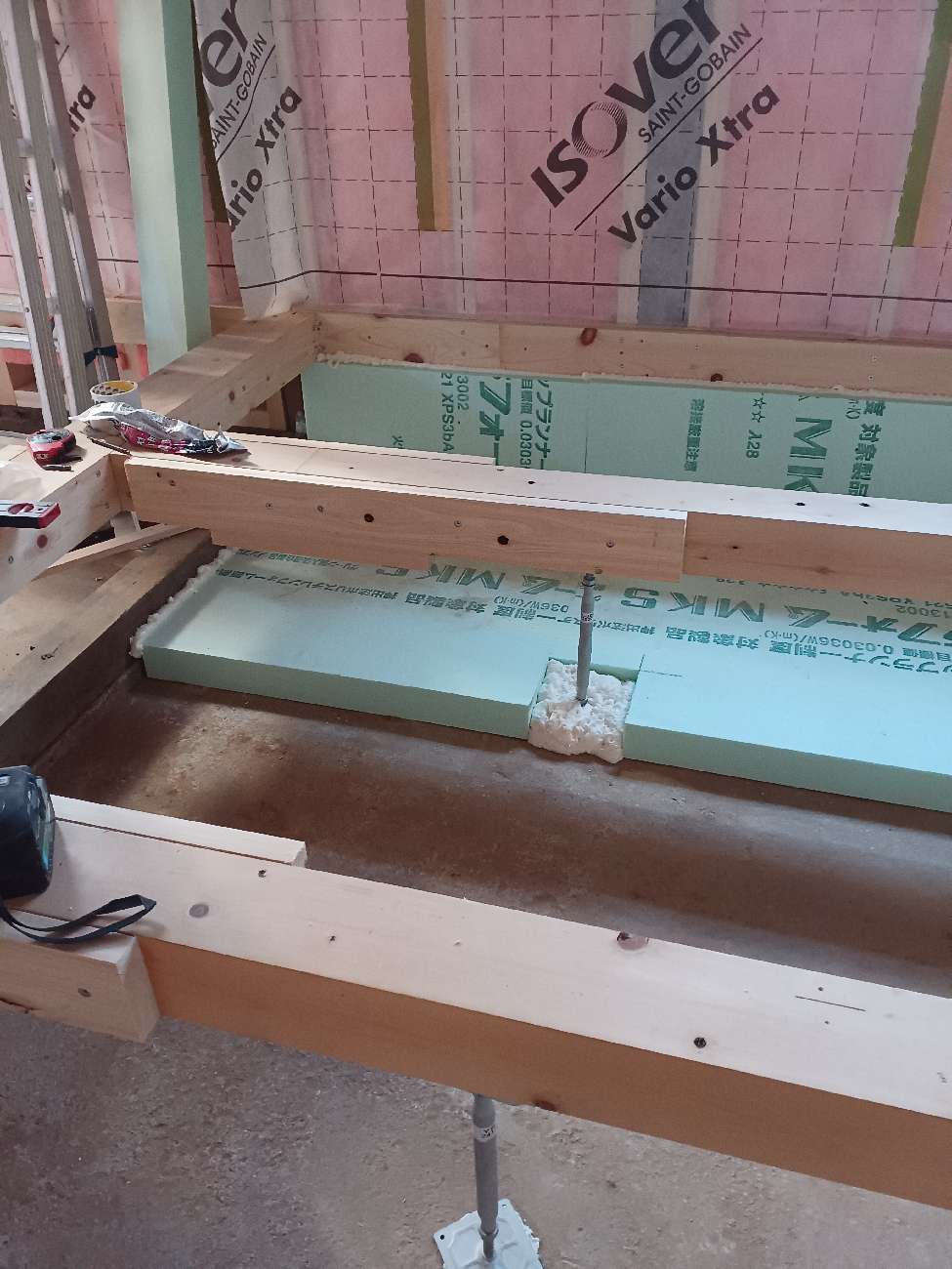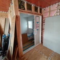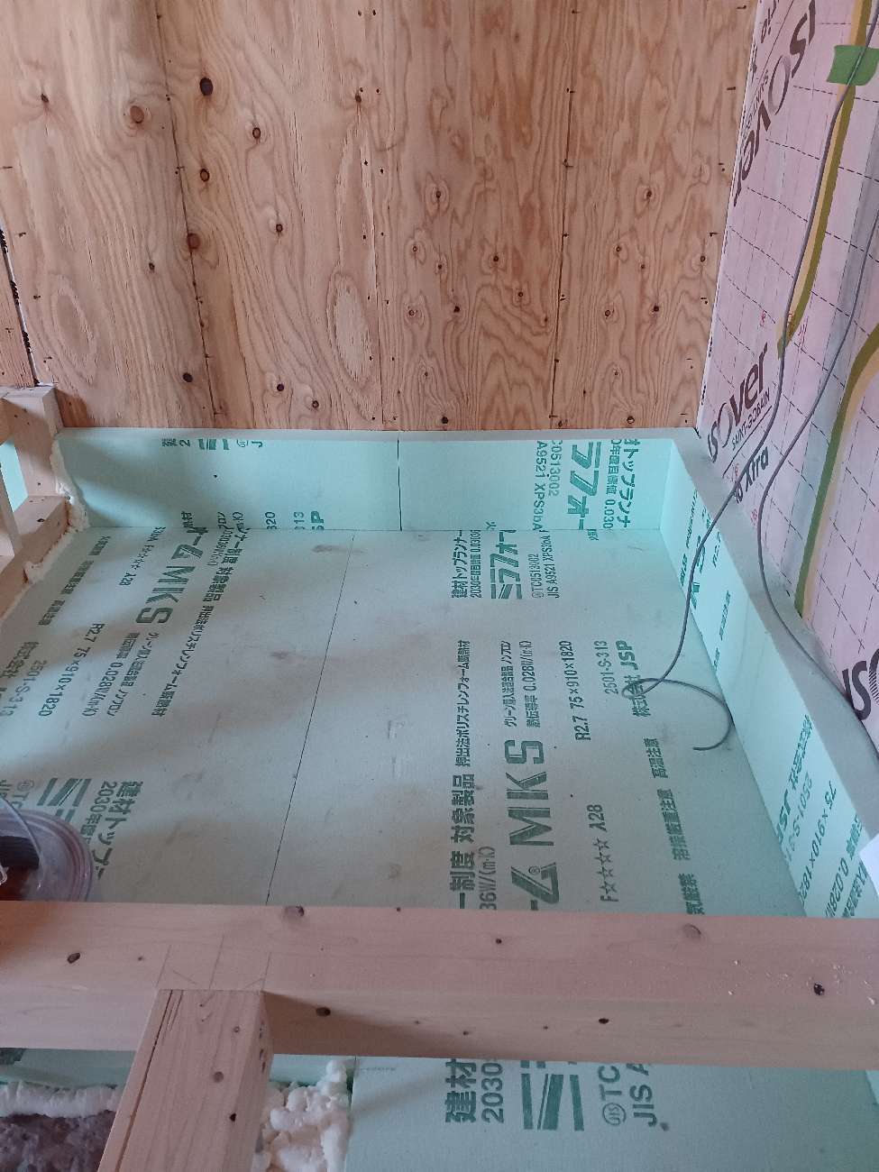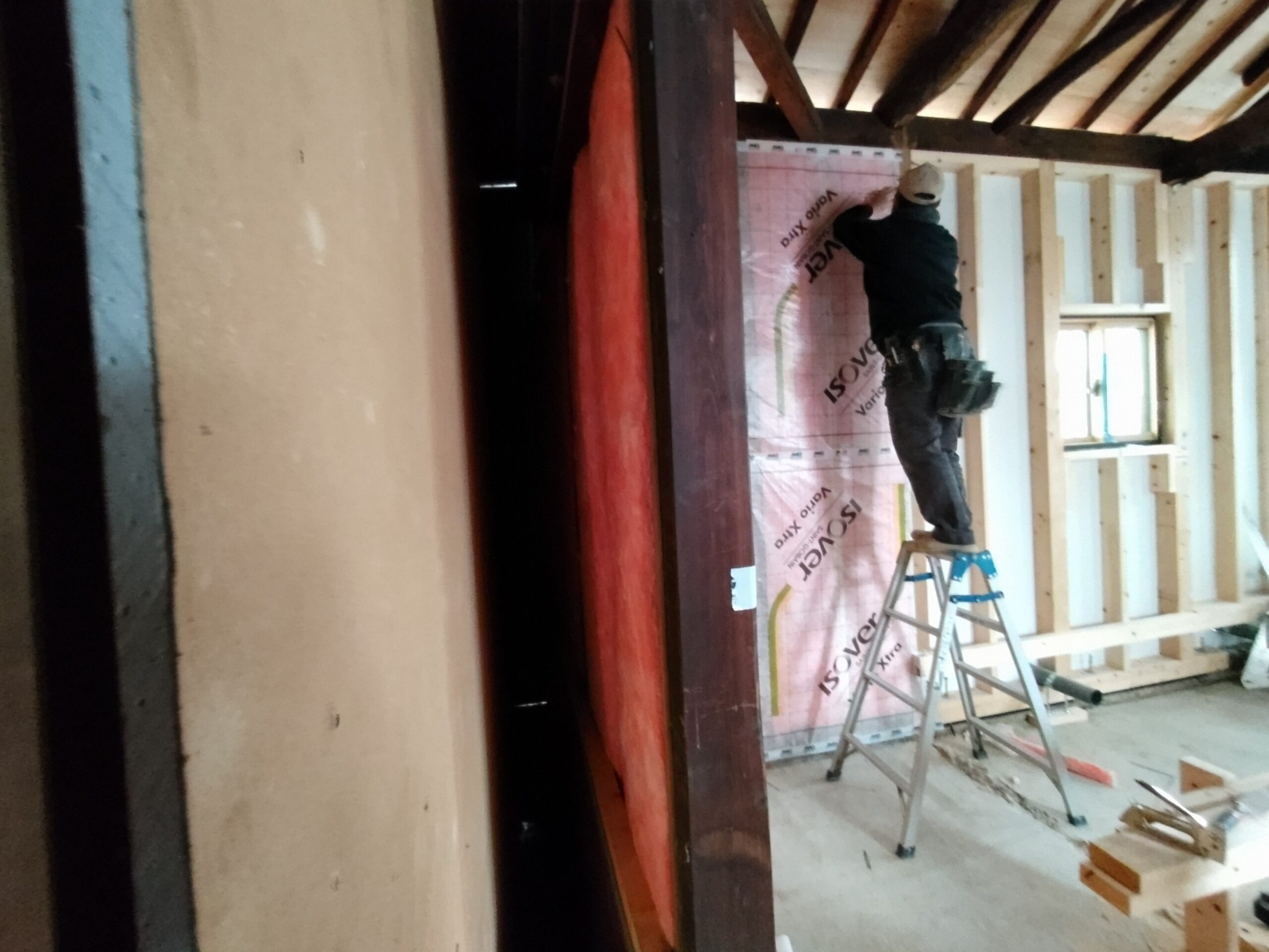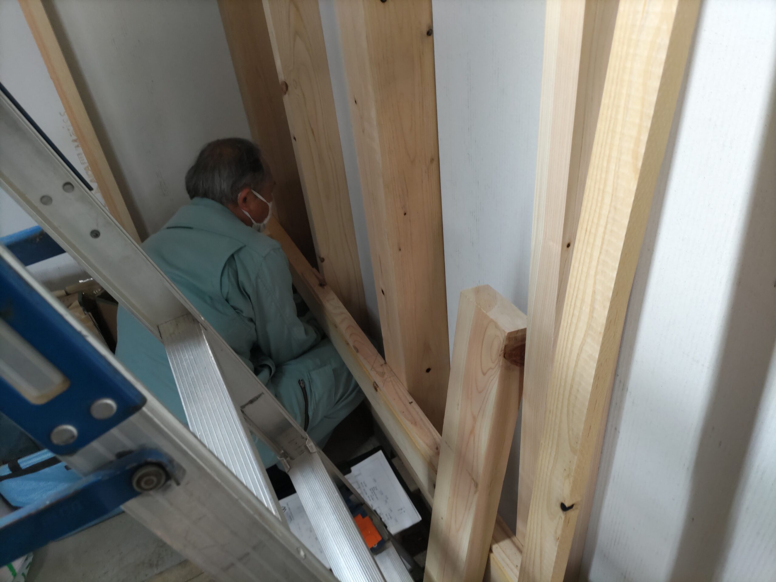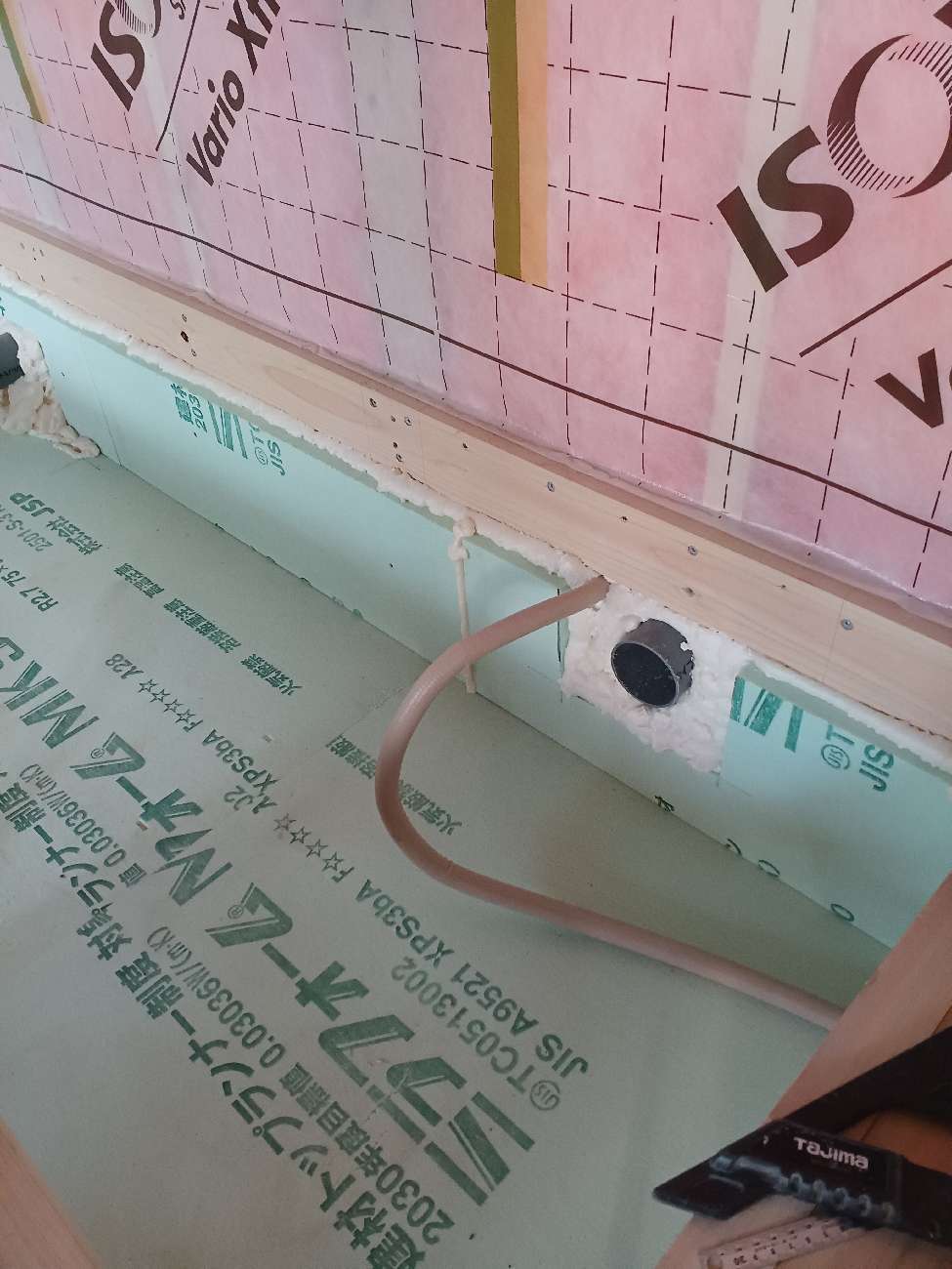 壁の断熱材敷設はあらかた終了し、明日はユニットバスが施工されるとの事。棟梁はこれから間仕切壁の下地を建てる作業に入ります。