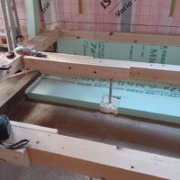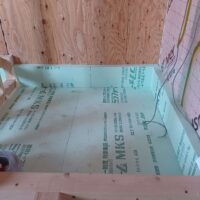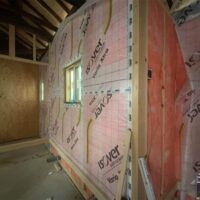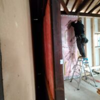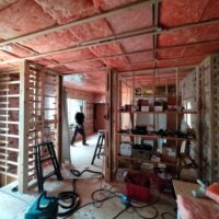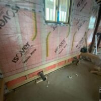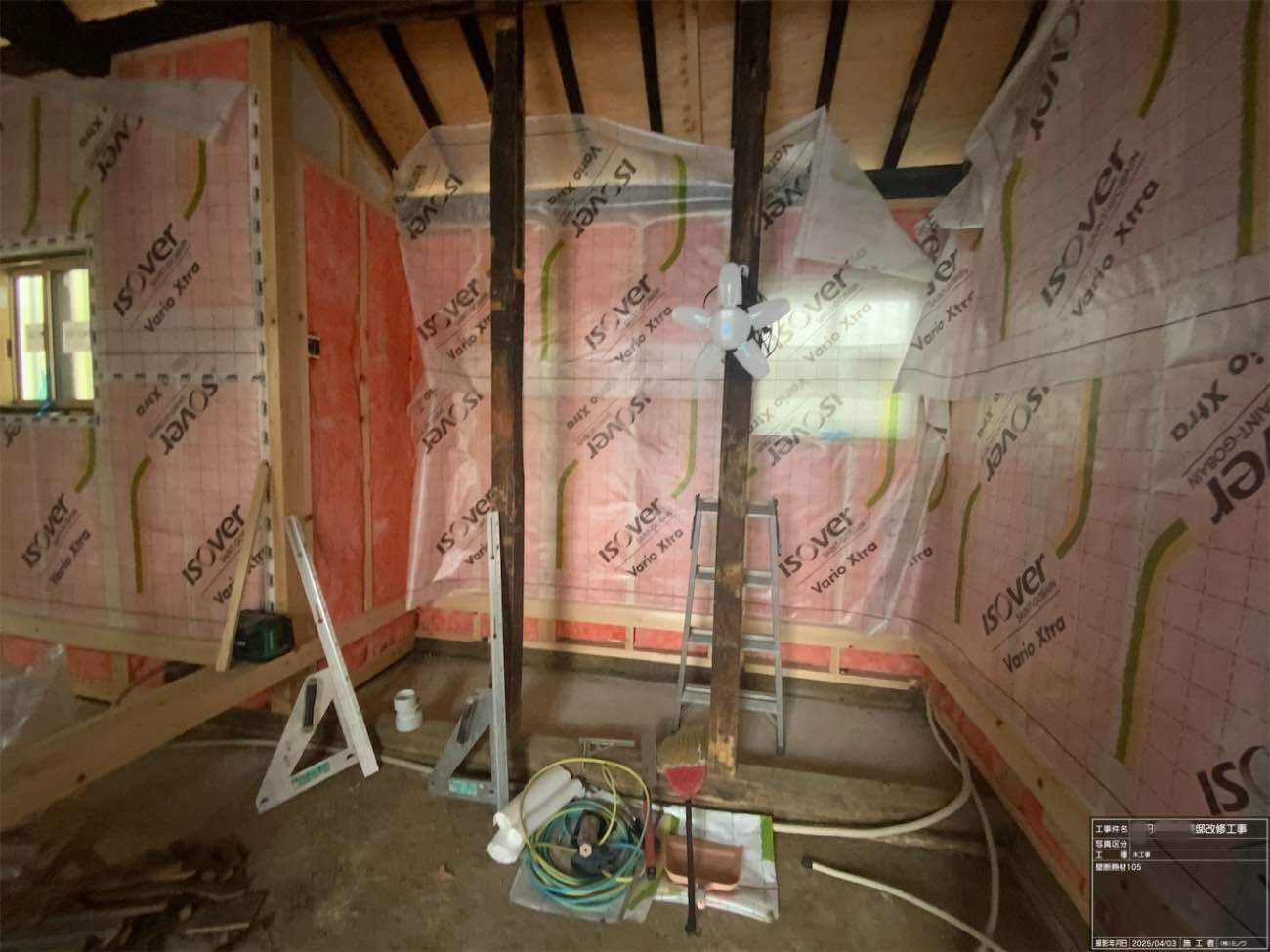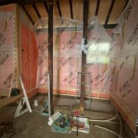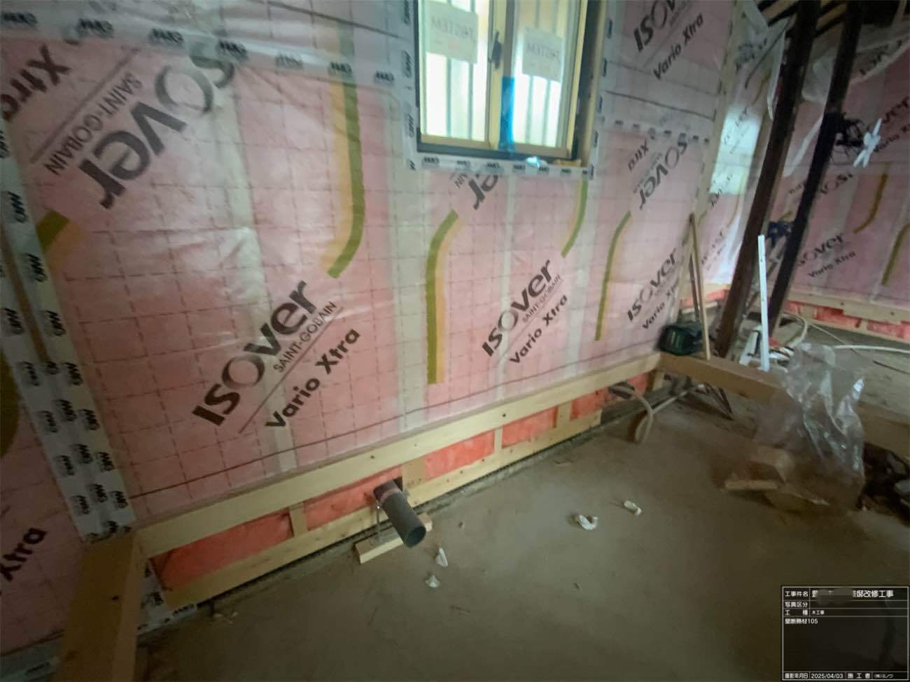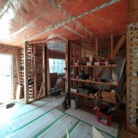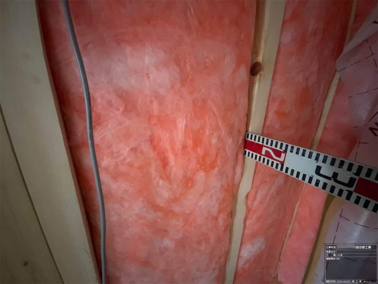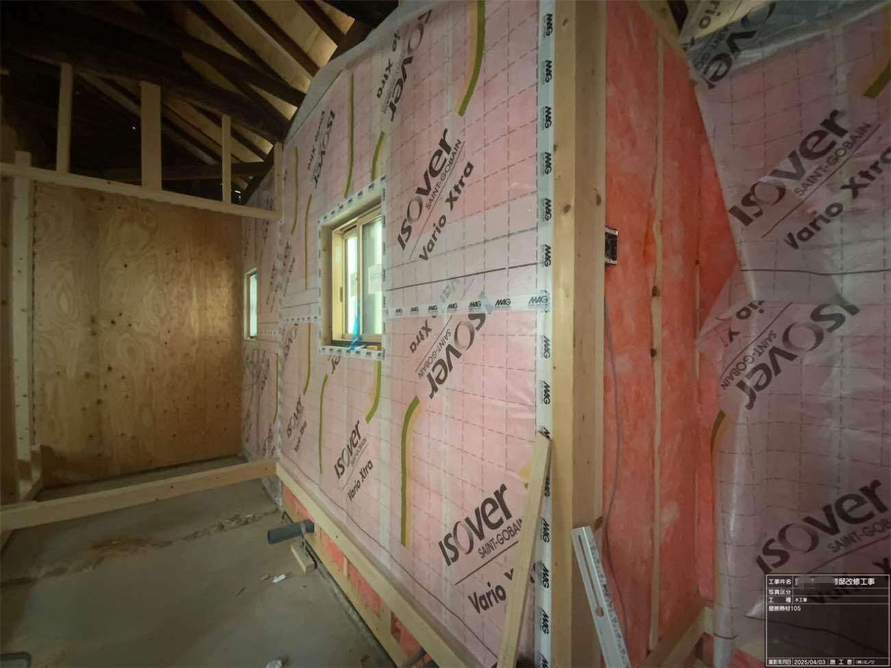 壁の断熱材敷設はあらかた終了し、明日はユニットバスが施工されるとの事。棟梁はこれから間仕切壁の下地を建てる作業に入ります。