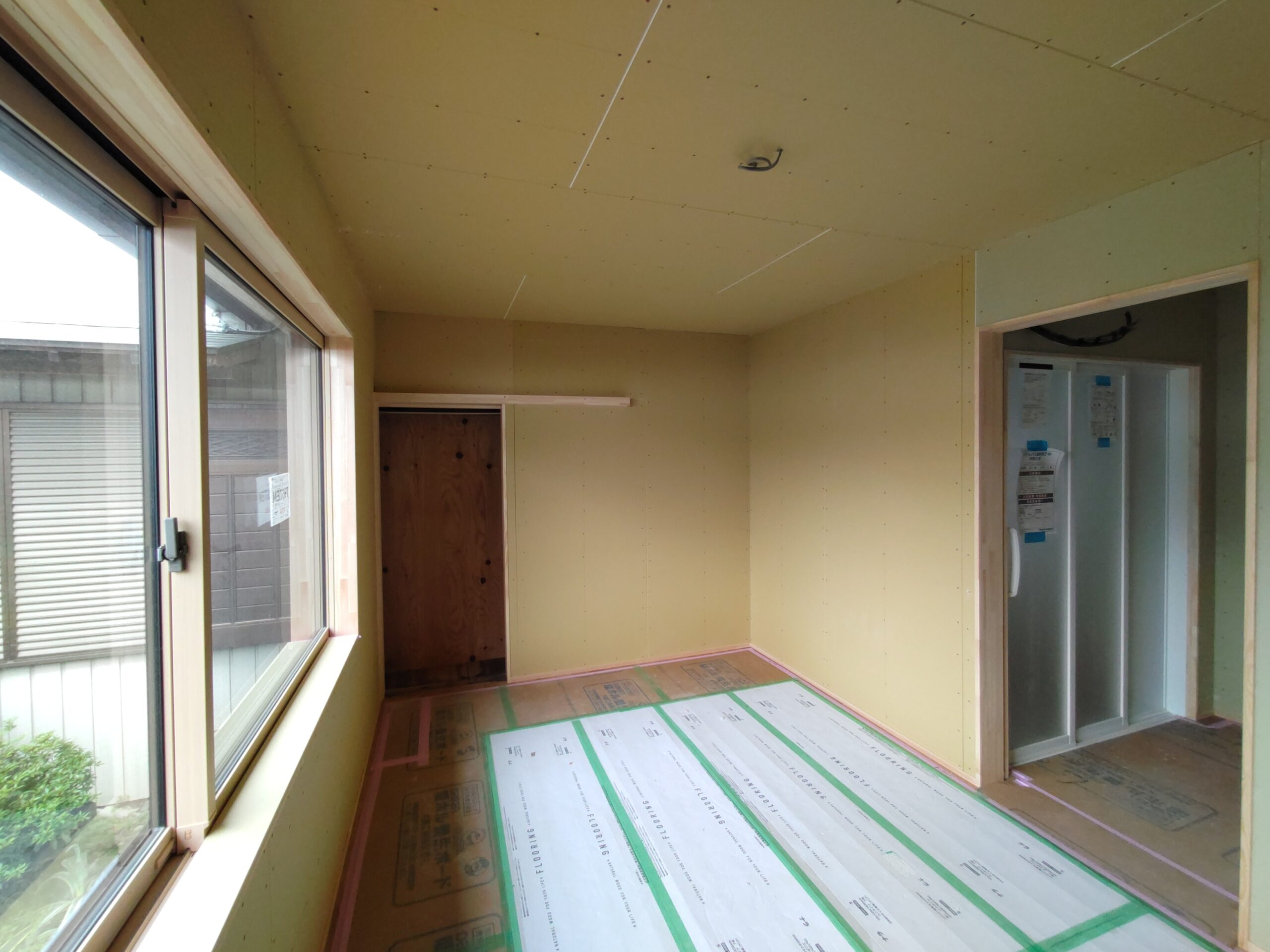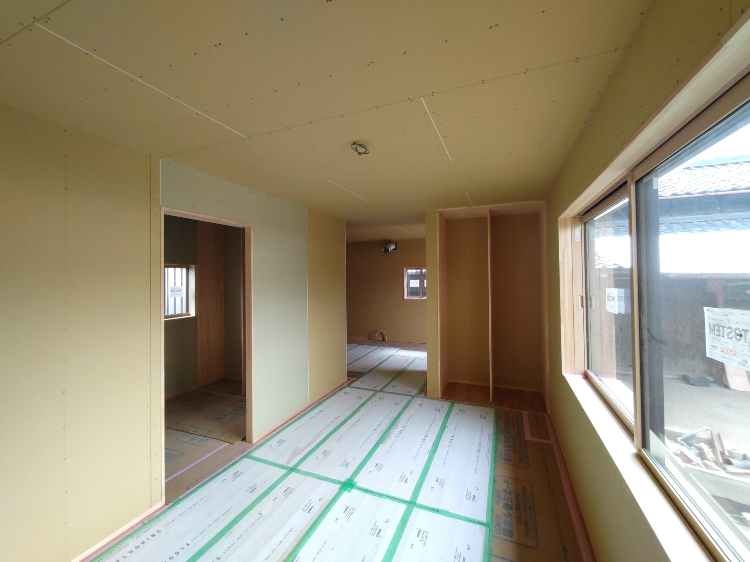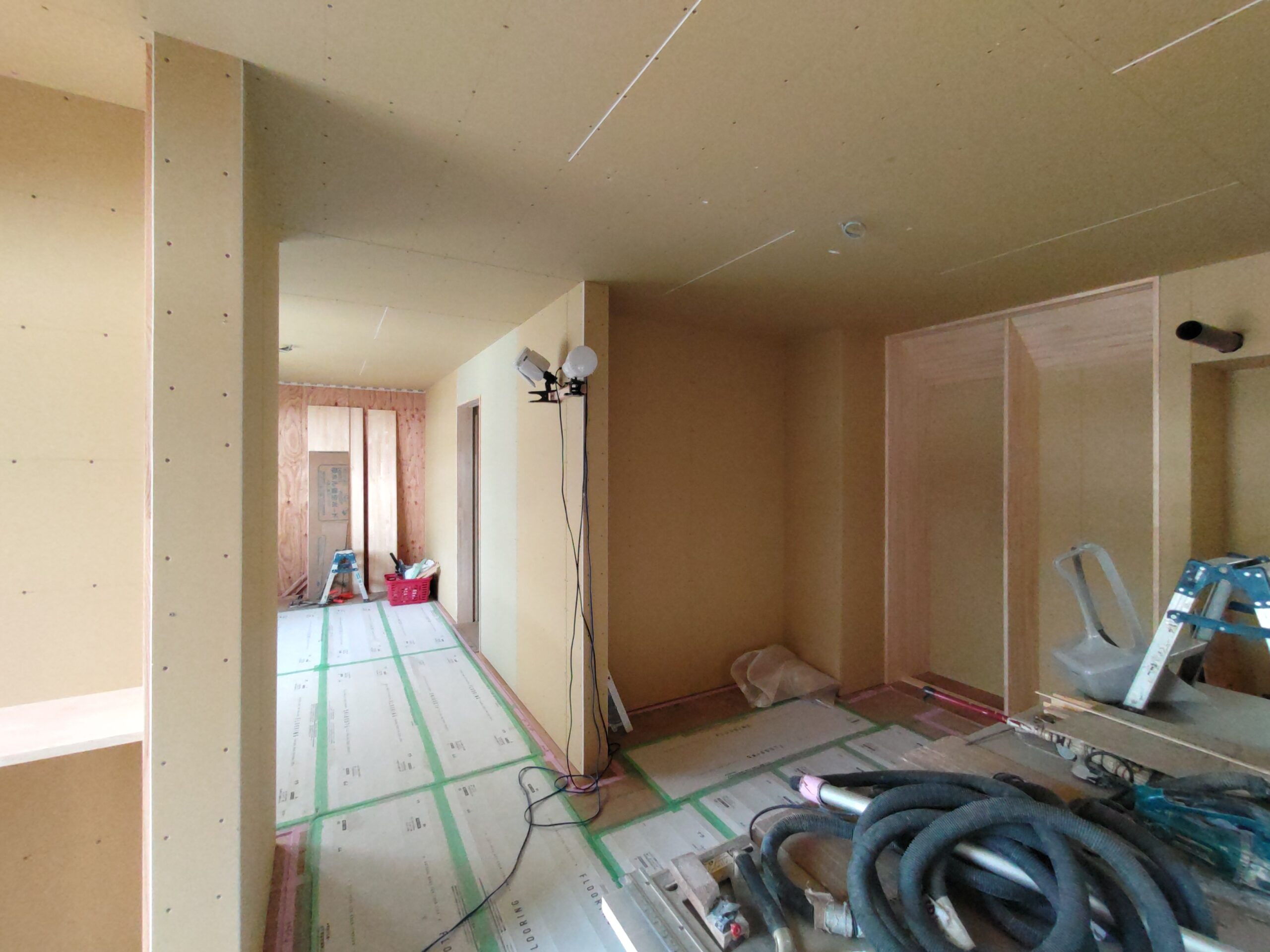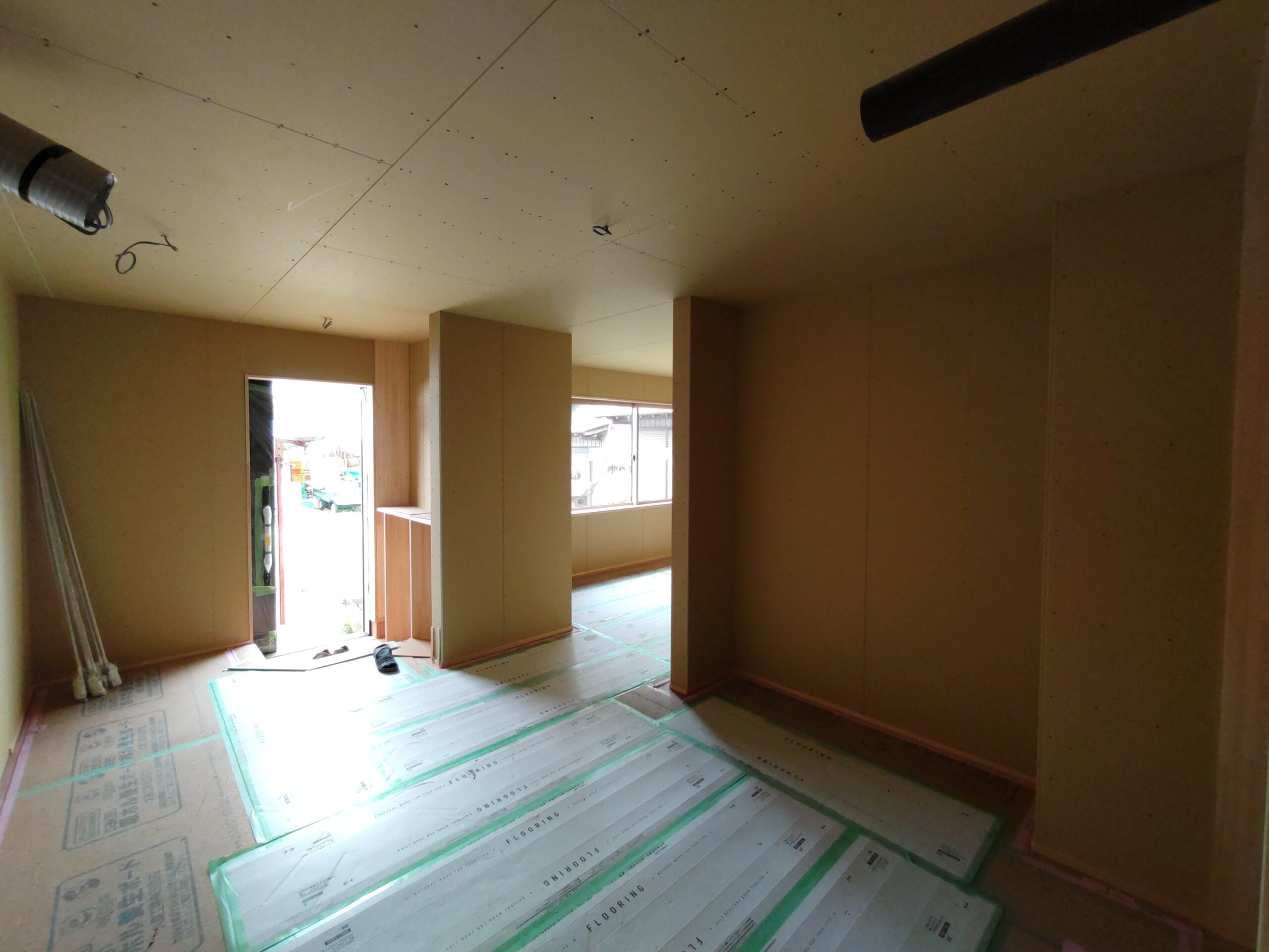 内部ではフローリング敷設が終わって床養生がされています。