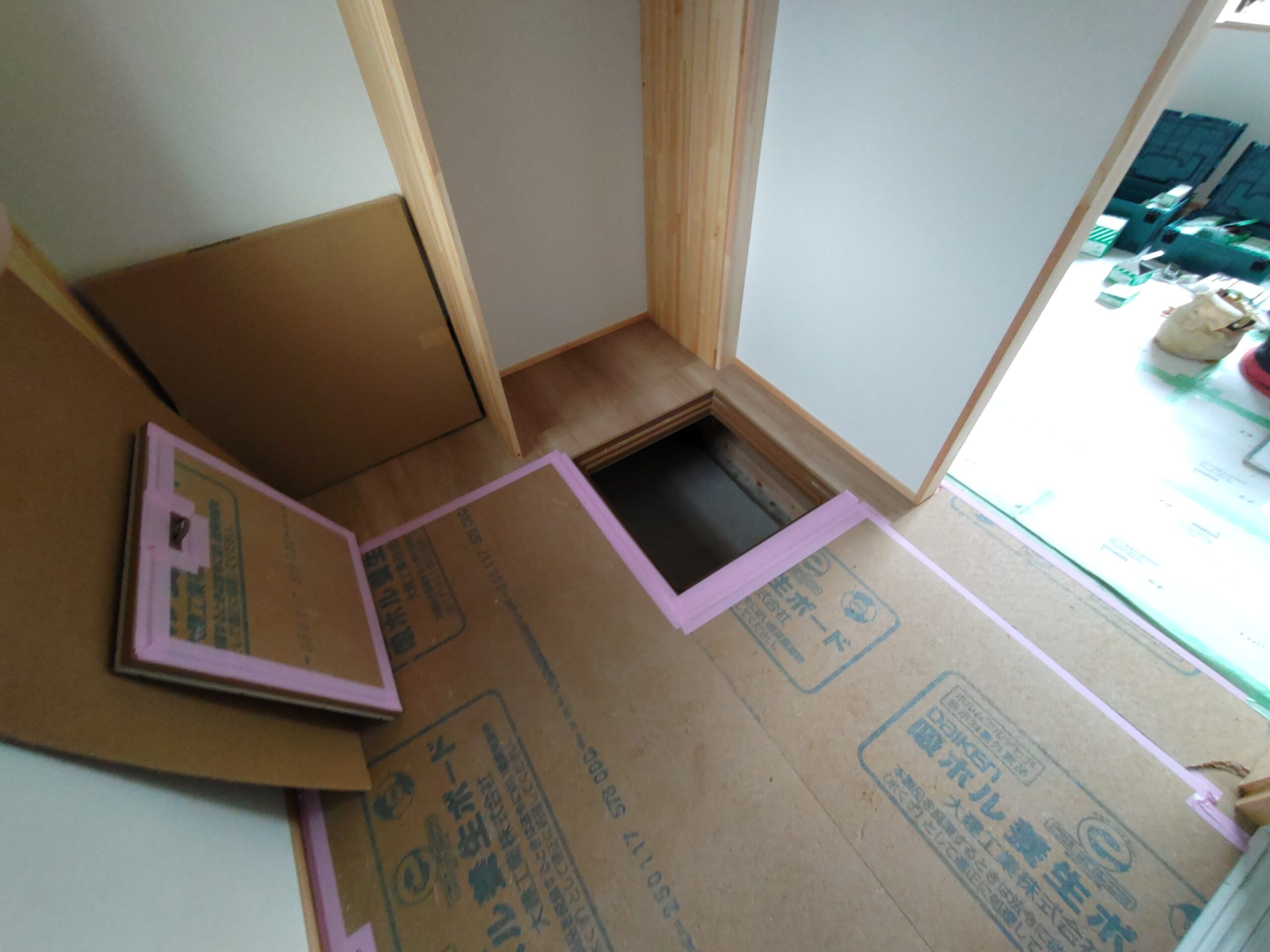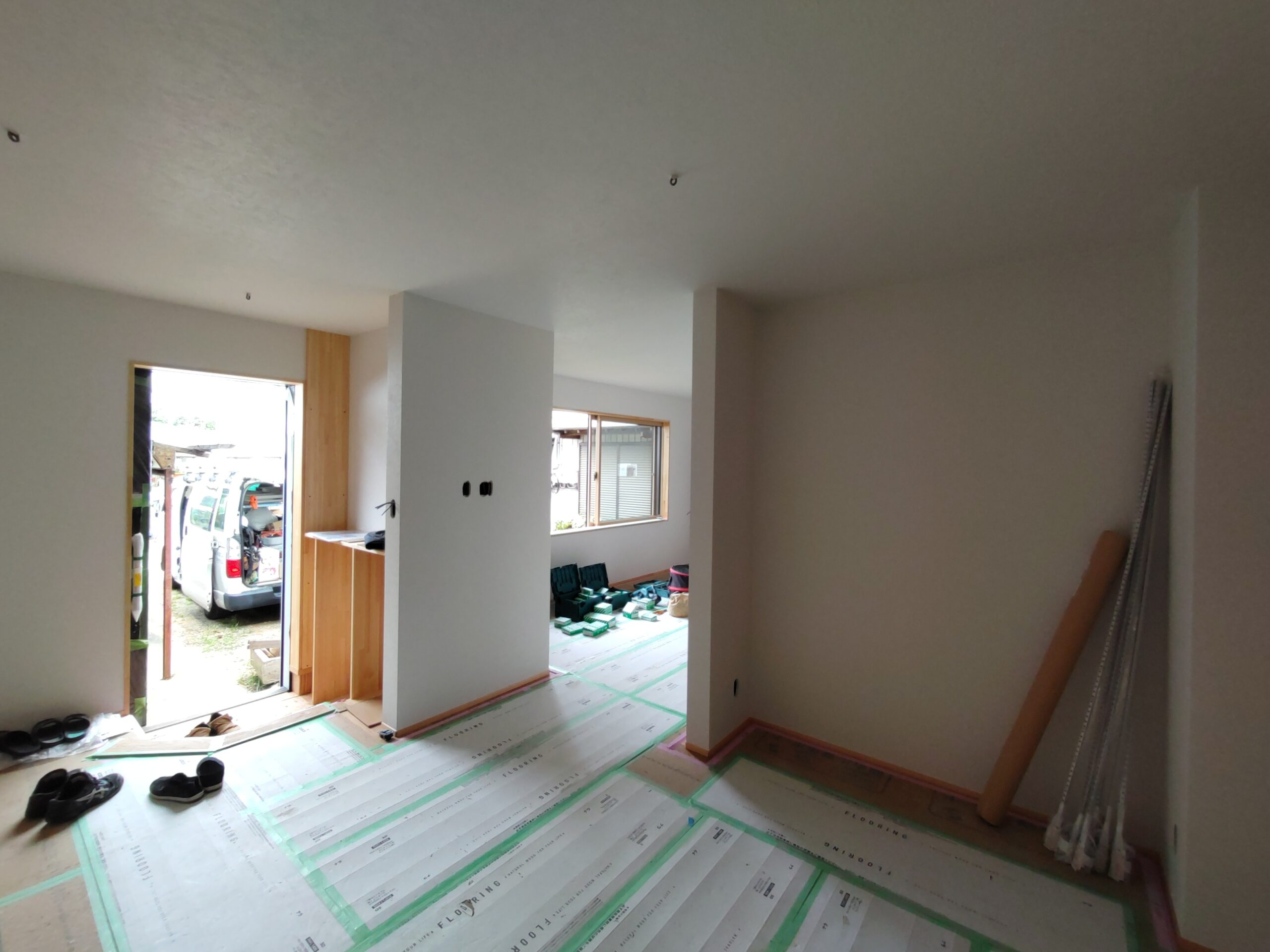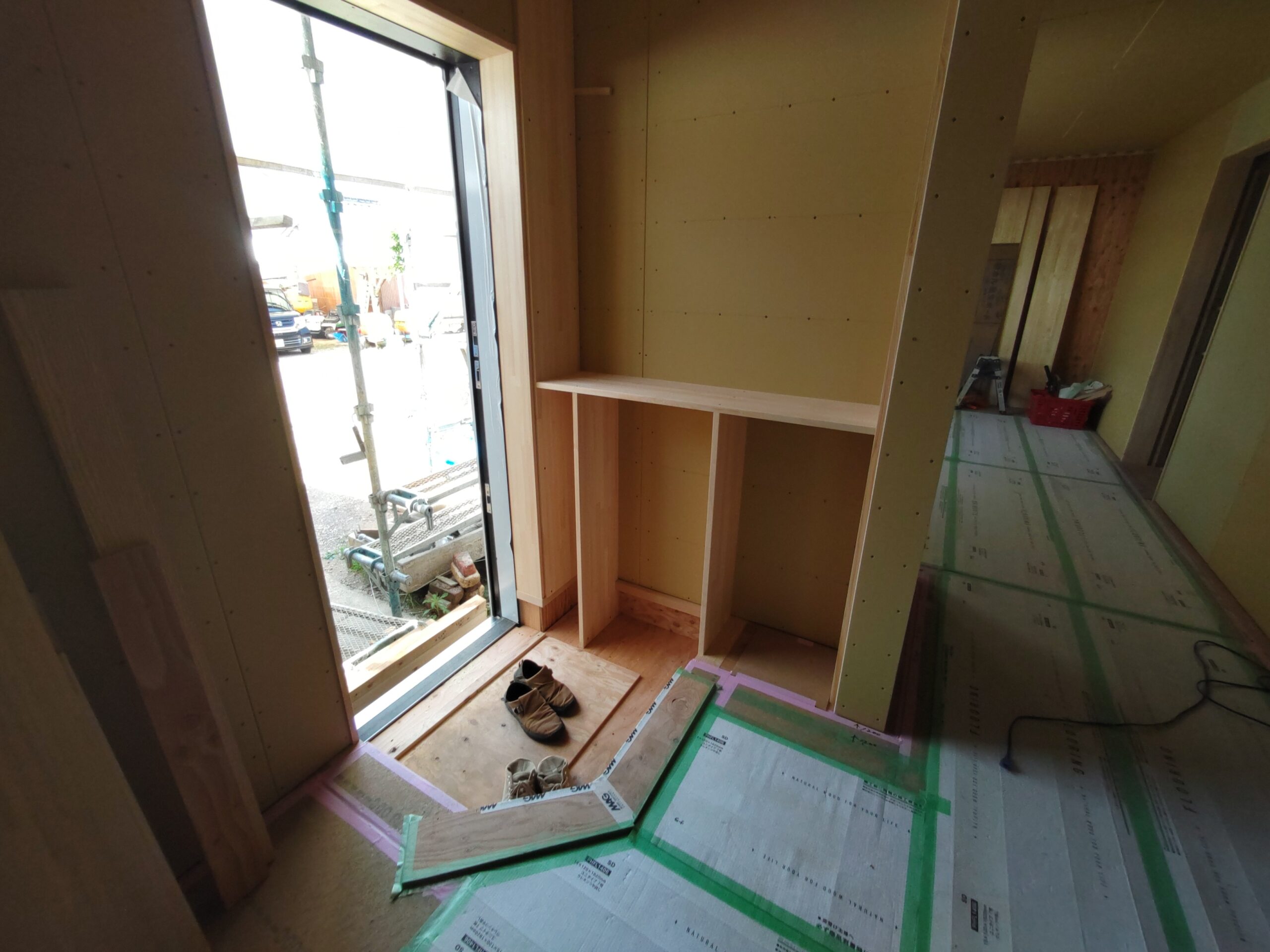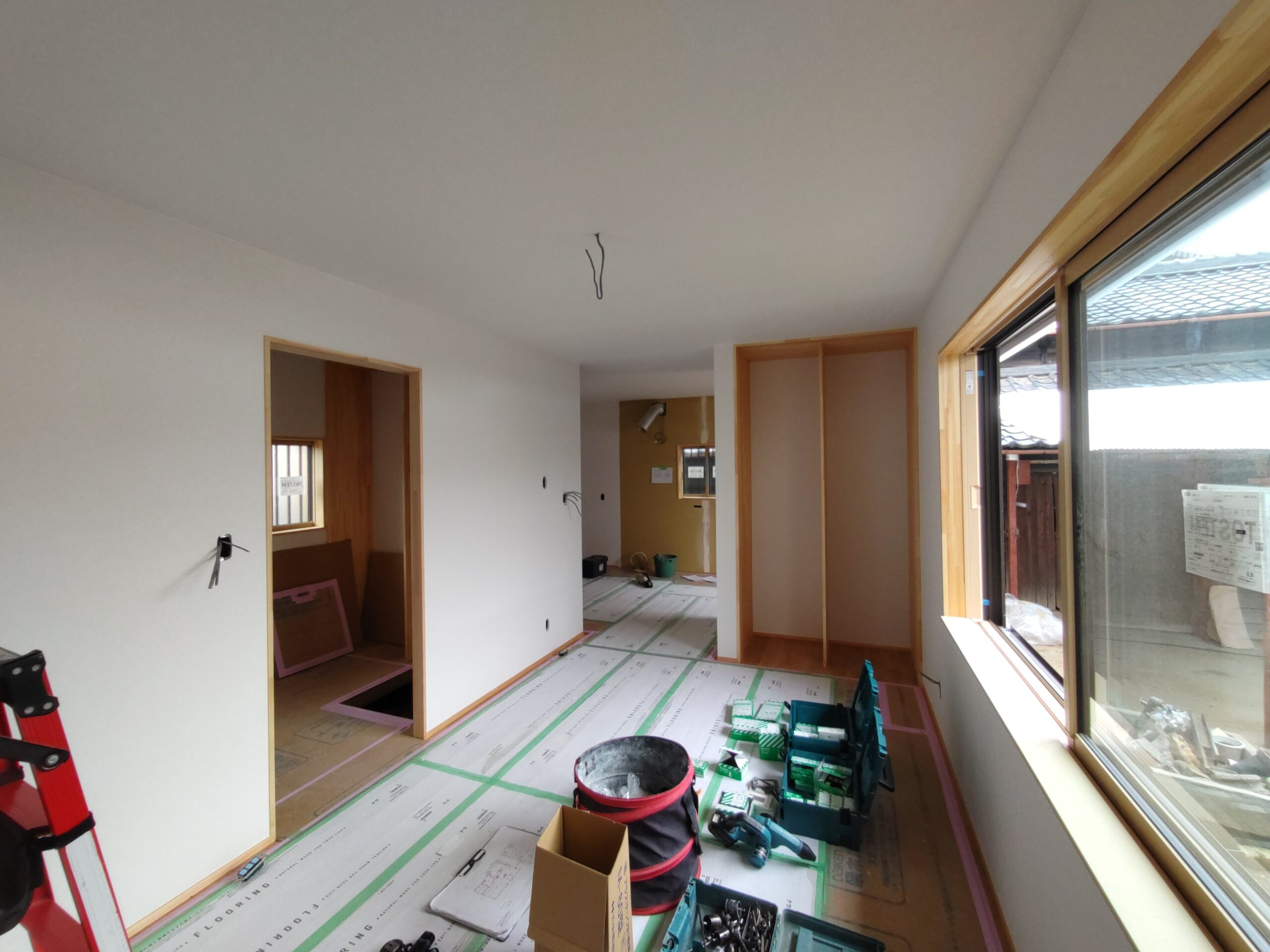内部ではフローリング敷設が終わって床養生がされています。