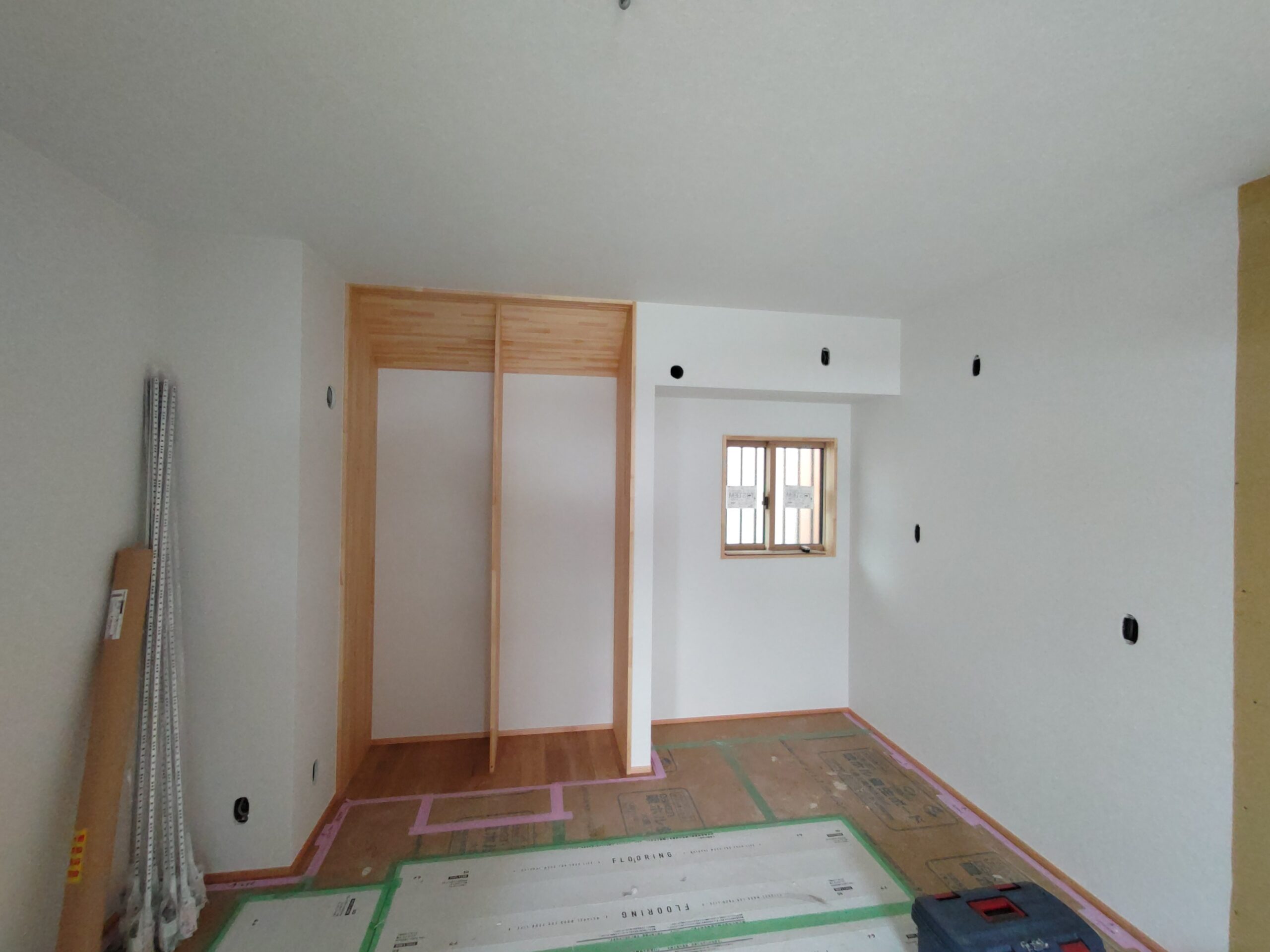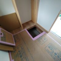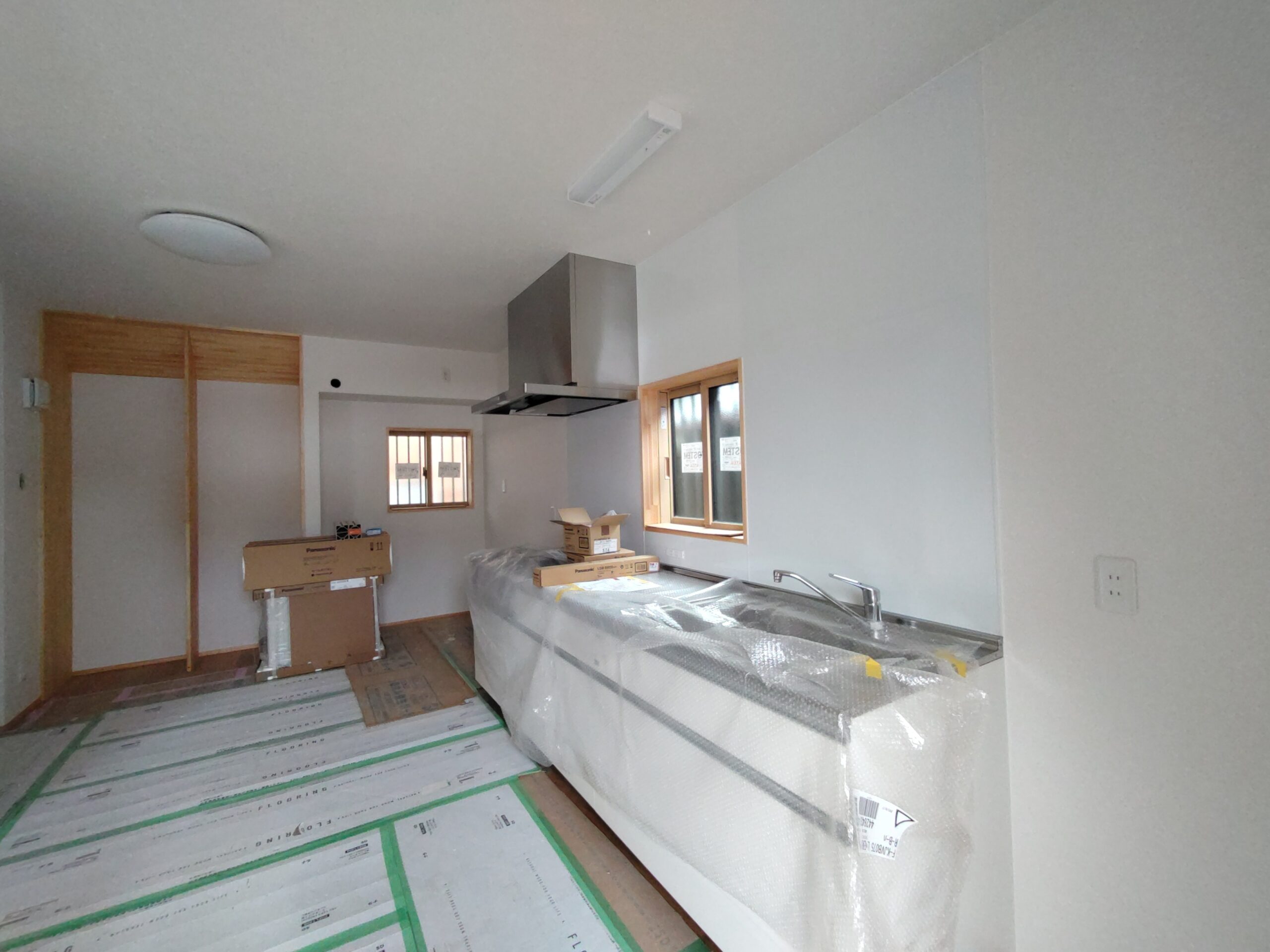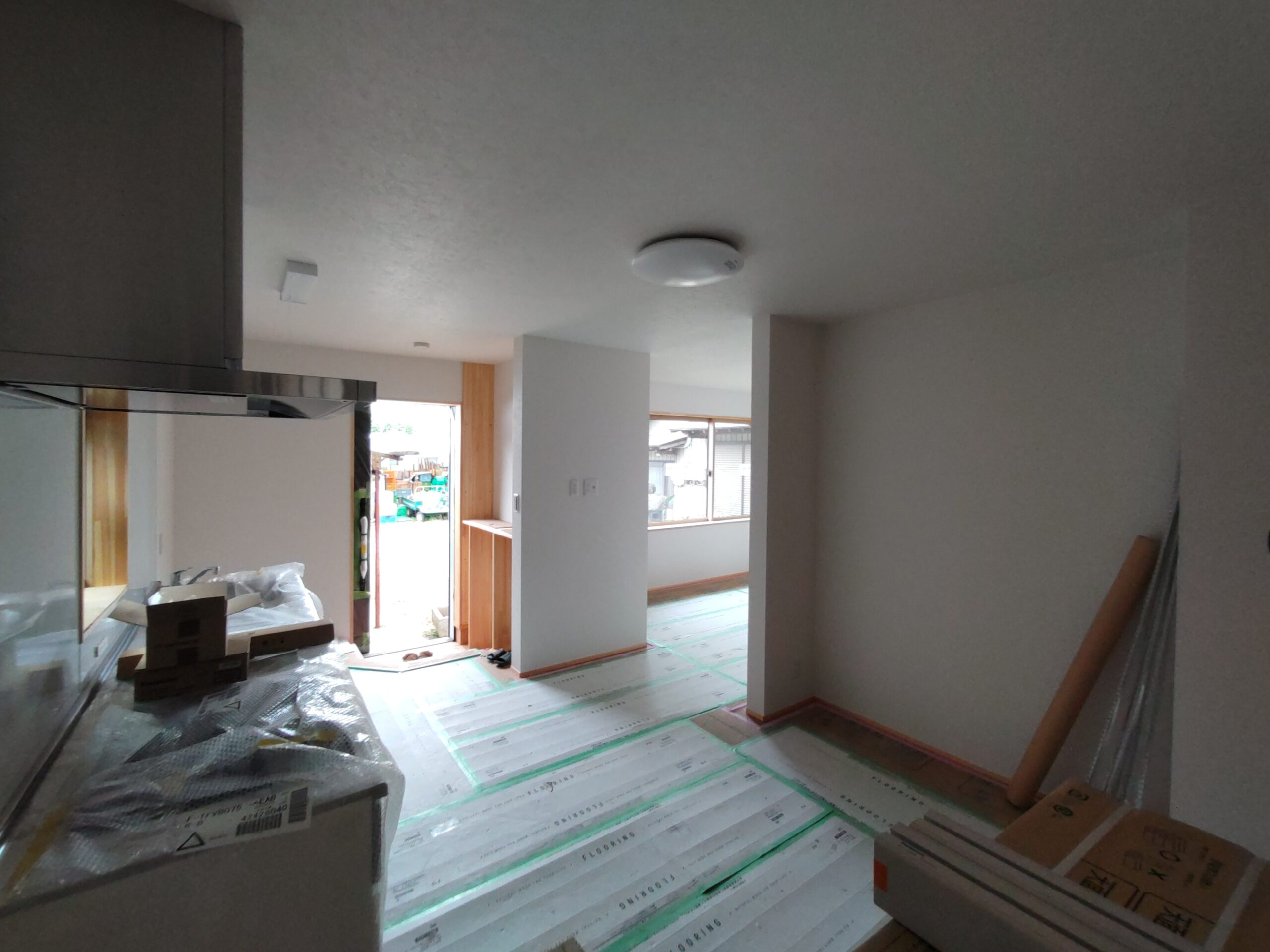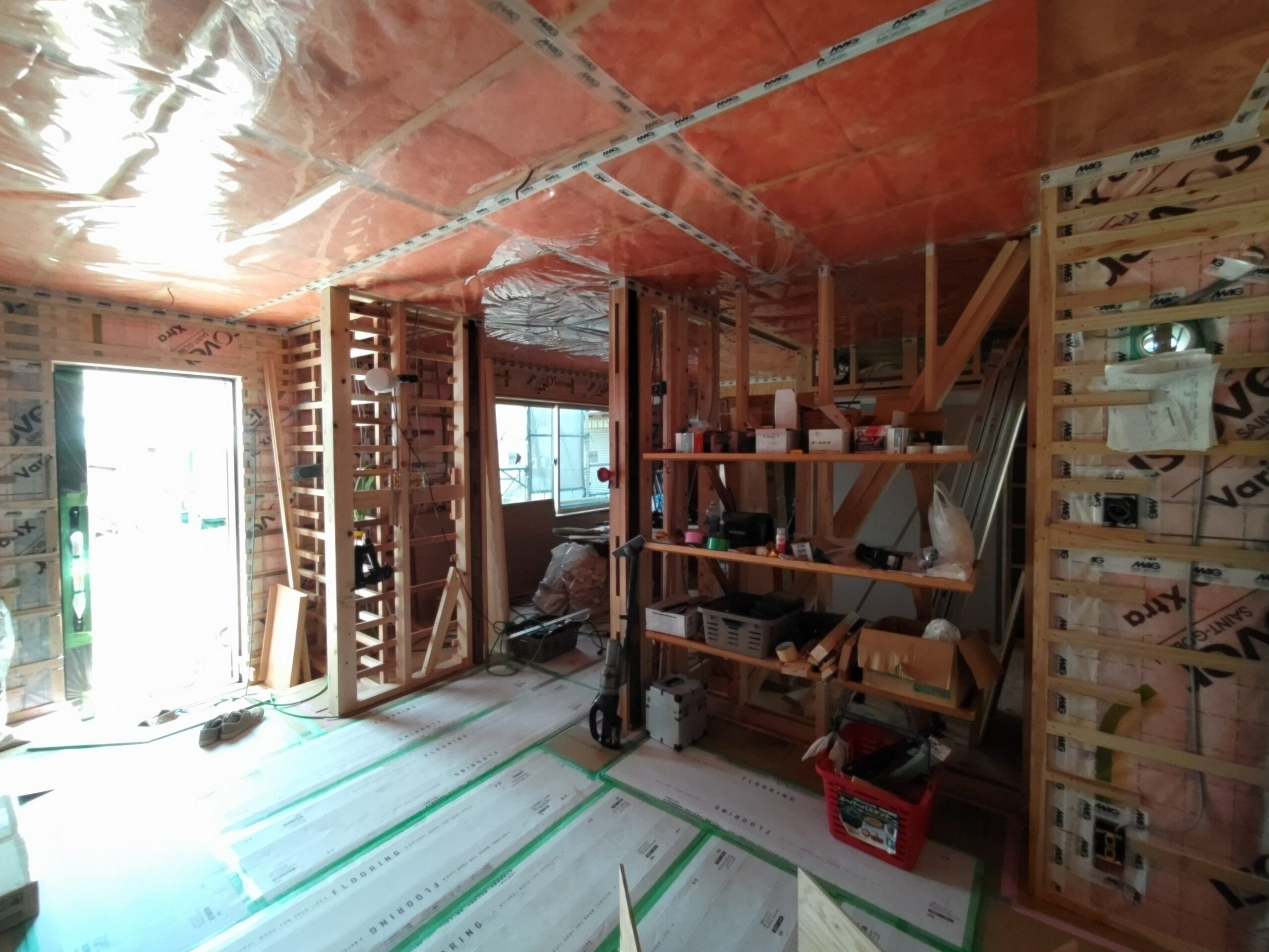 内部ではフローリング敷設が終わって床養生がされています。