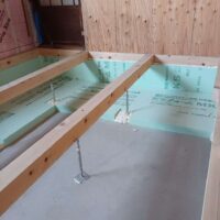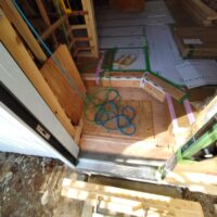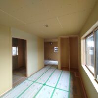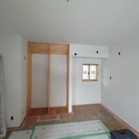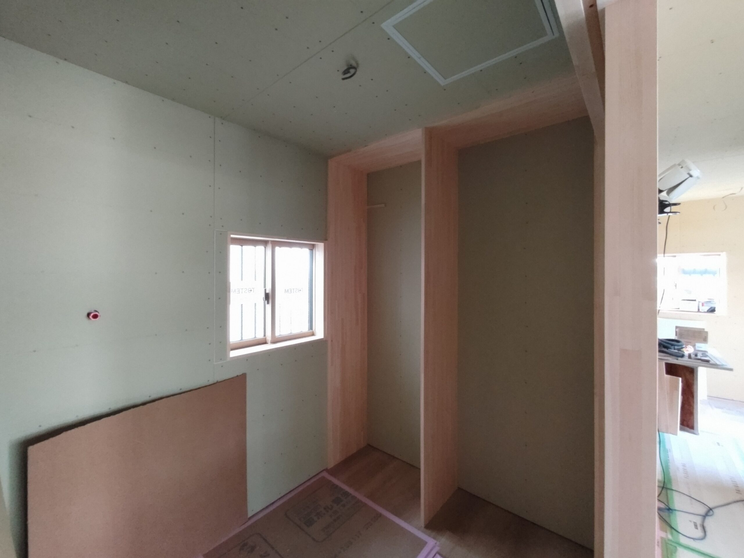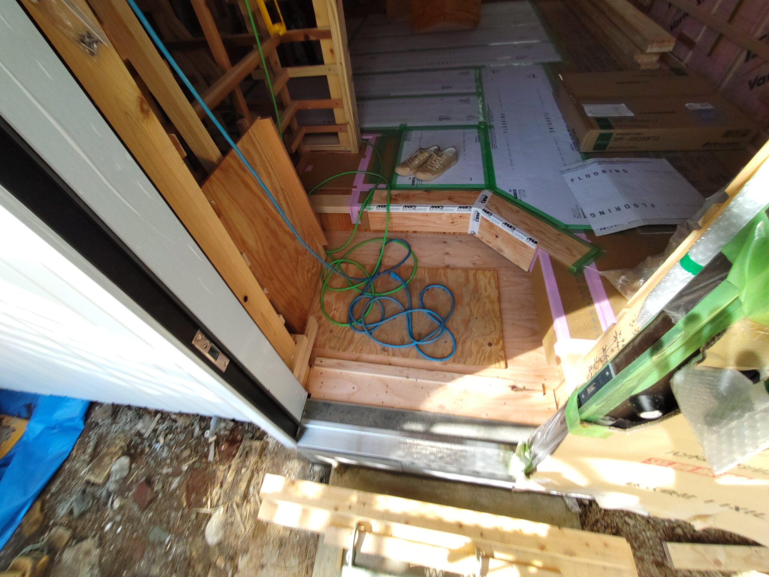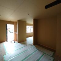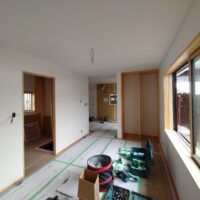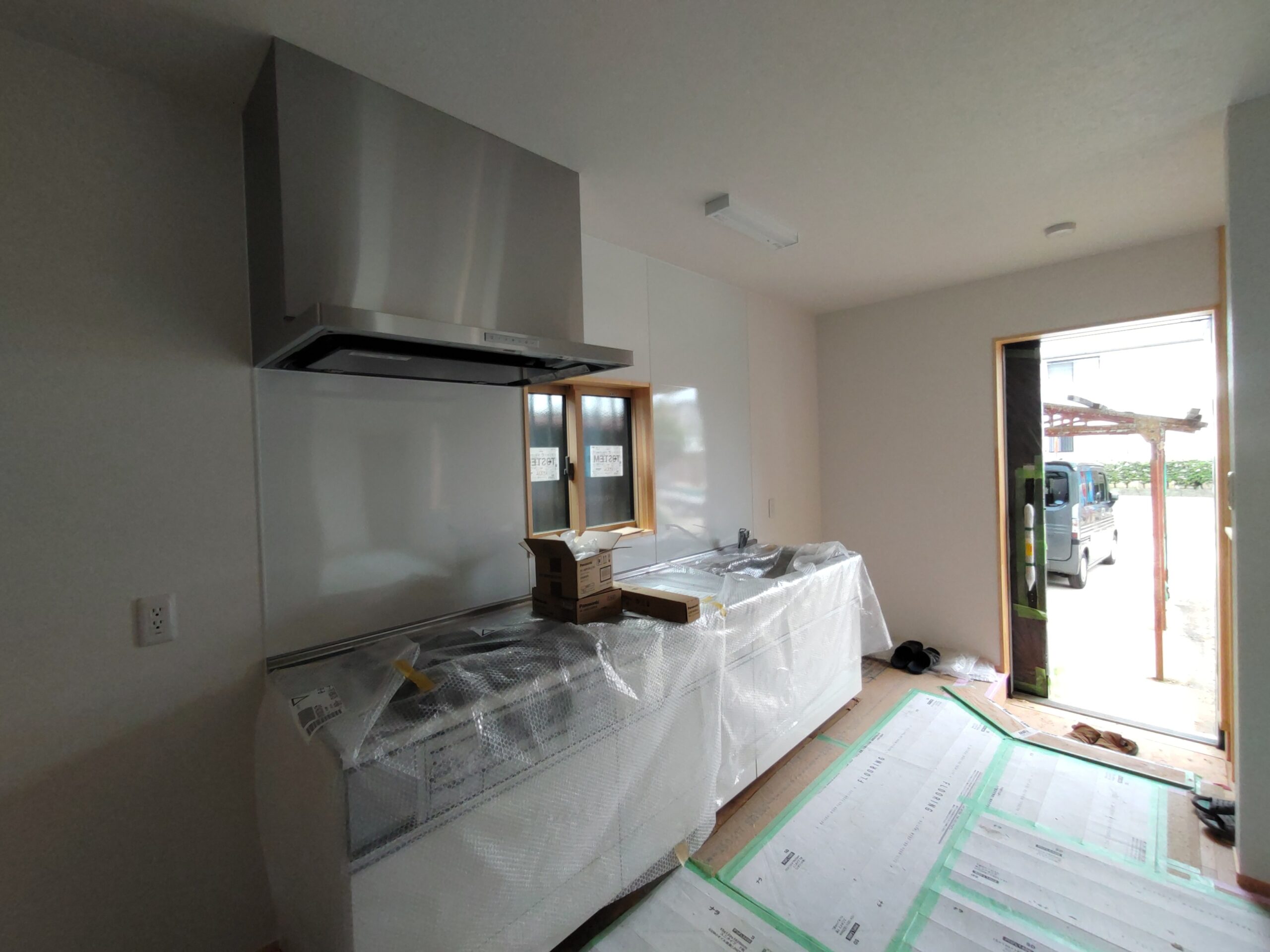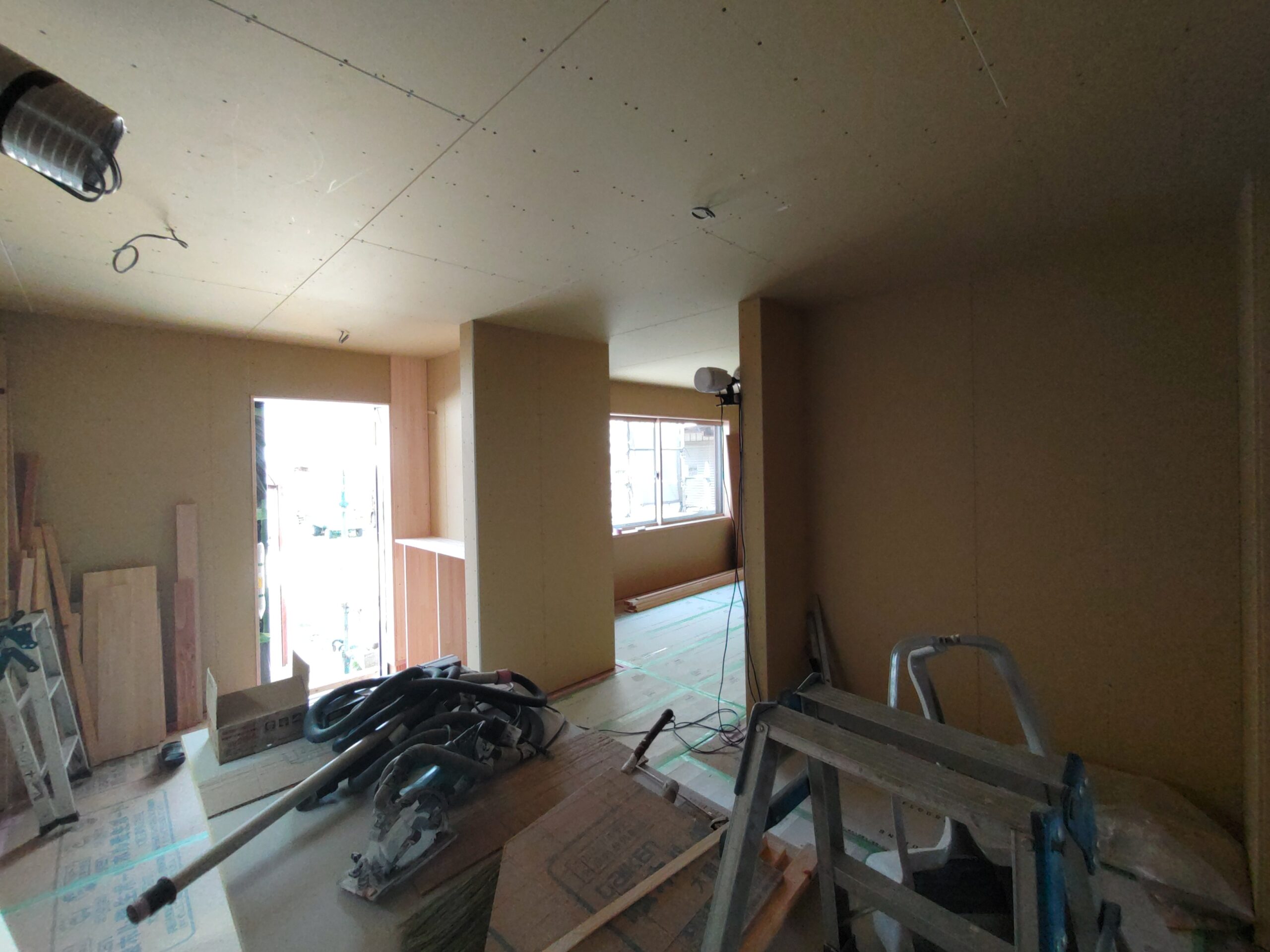 内部ではフローリング敷設が終わって床養生がされています。