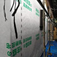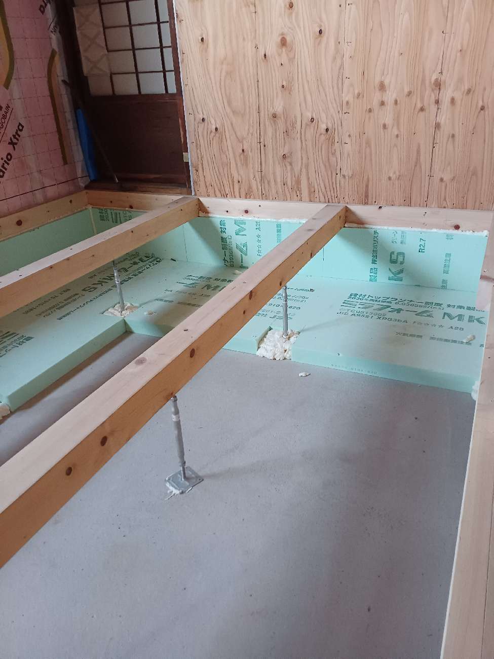 壁のグラスウール断熱材、基礎のスタイロフォーム断熱材の敷設。今までは旧い建て方でしたので土壁以外に断熱材が入っておらず、冬はさぞかし底冷えがしたことだと思います。こうしてばっちりと断熱材の敷設をし、夏涼しく冬暖かい住宅に生まれ変わっていきます。