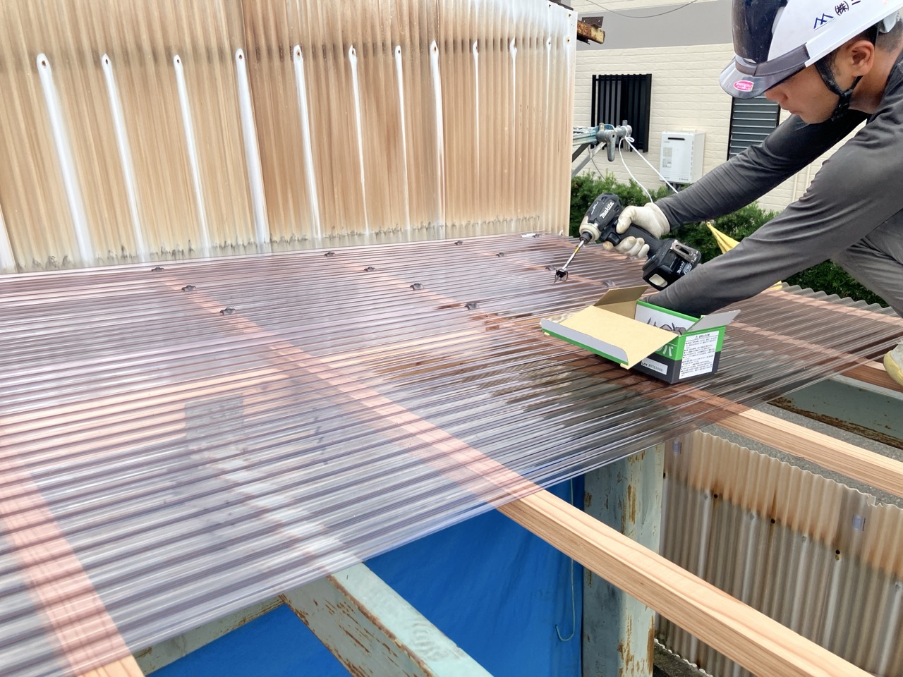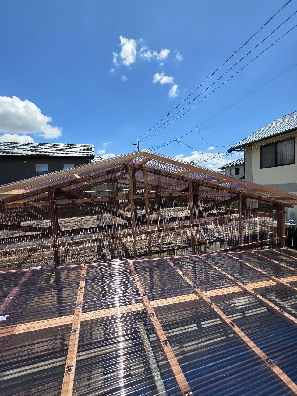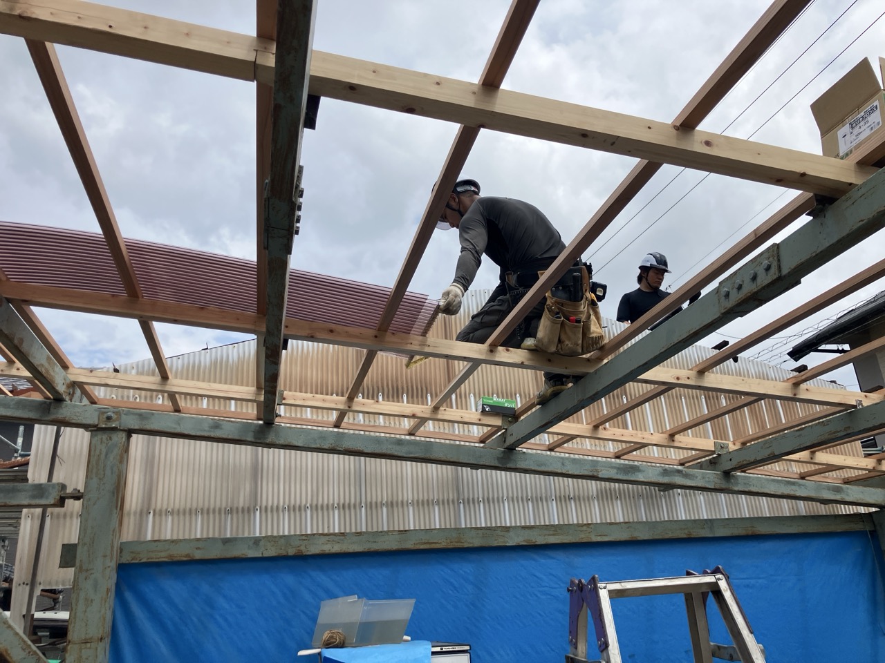 組み終わった下地にさっそくポリカ波板張り。k保木、h谷川の両大工に加え、O本君も留め付け作業に加わり『通常の三倍のスピードで』張り進められていきます。