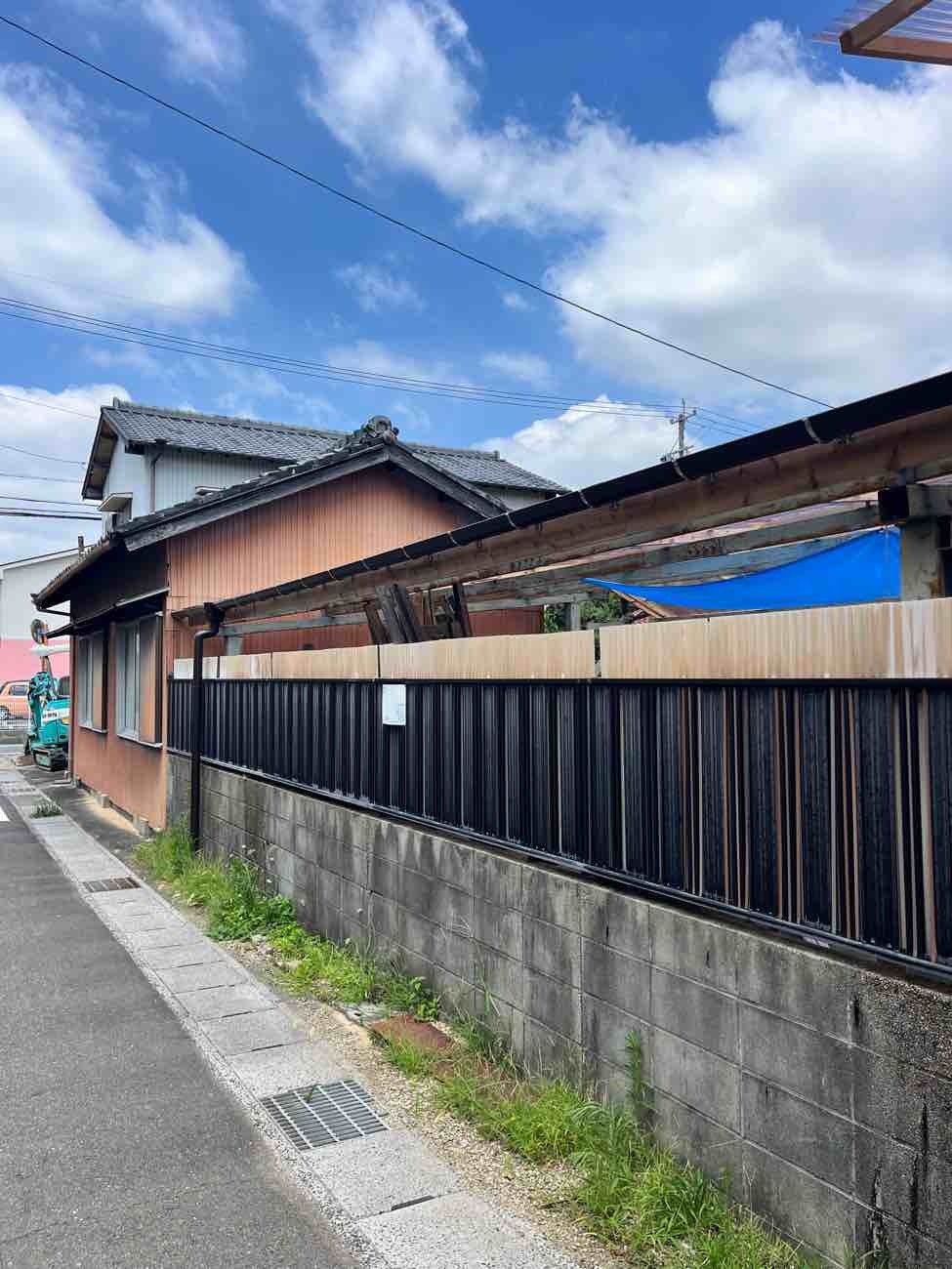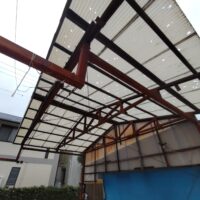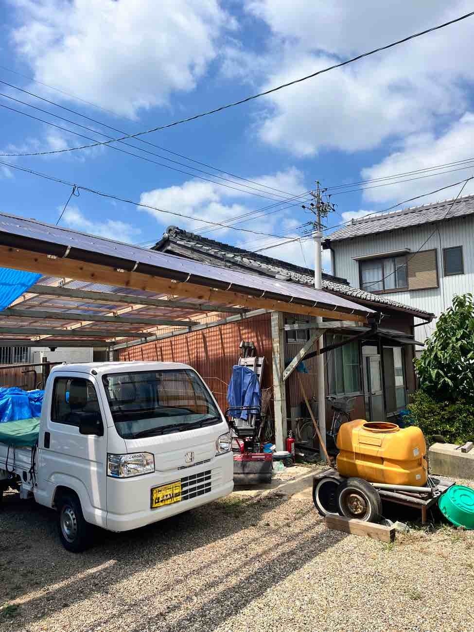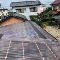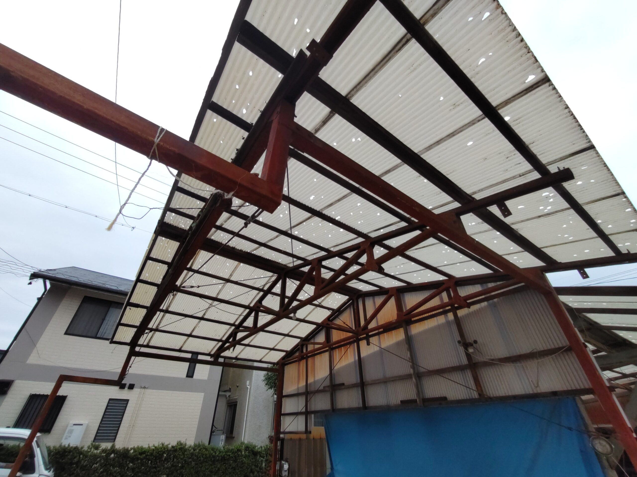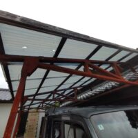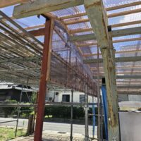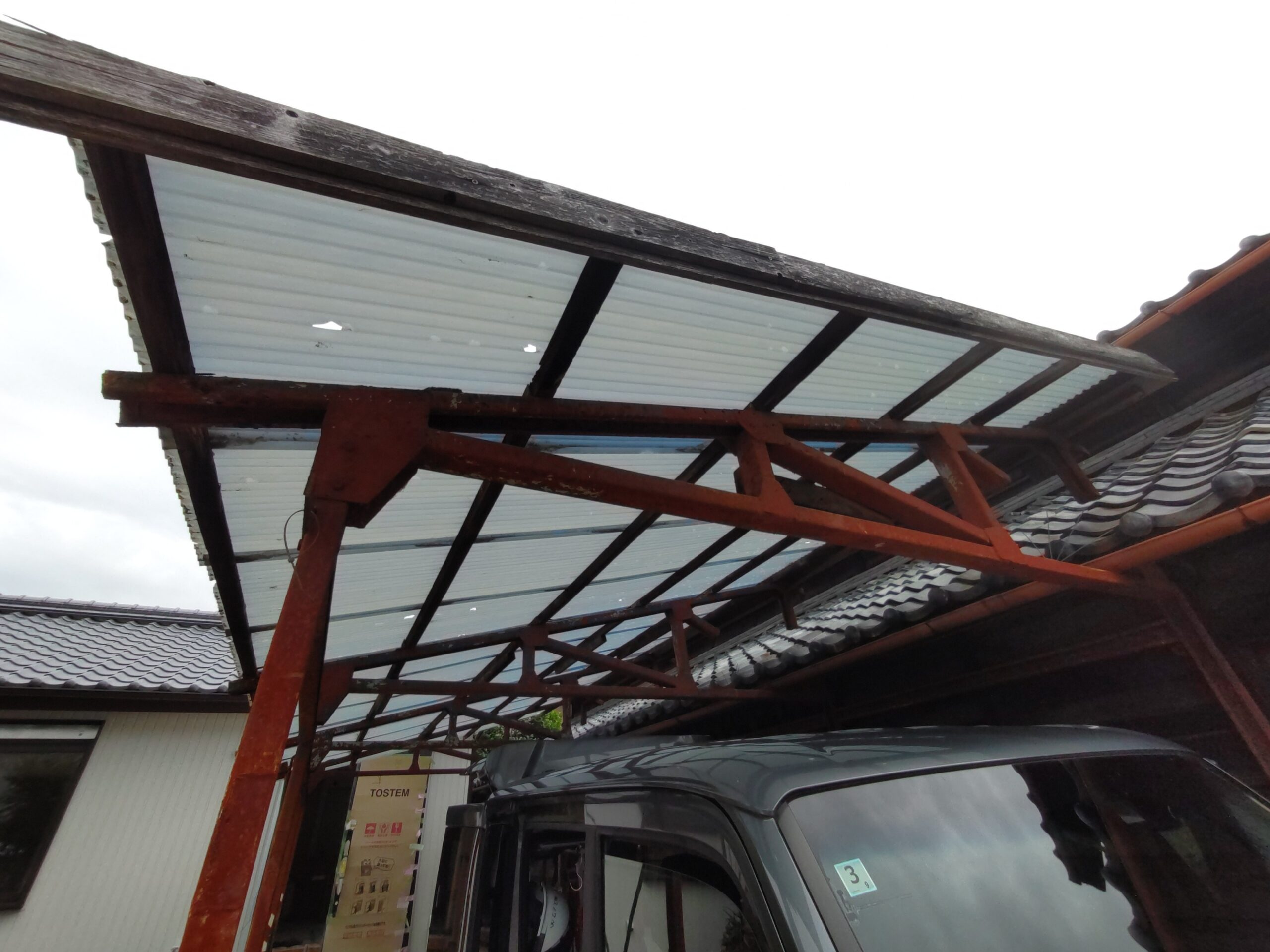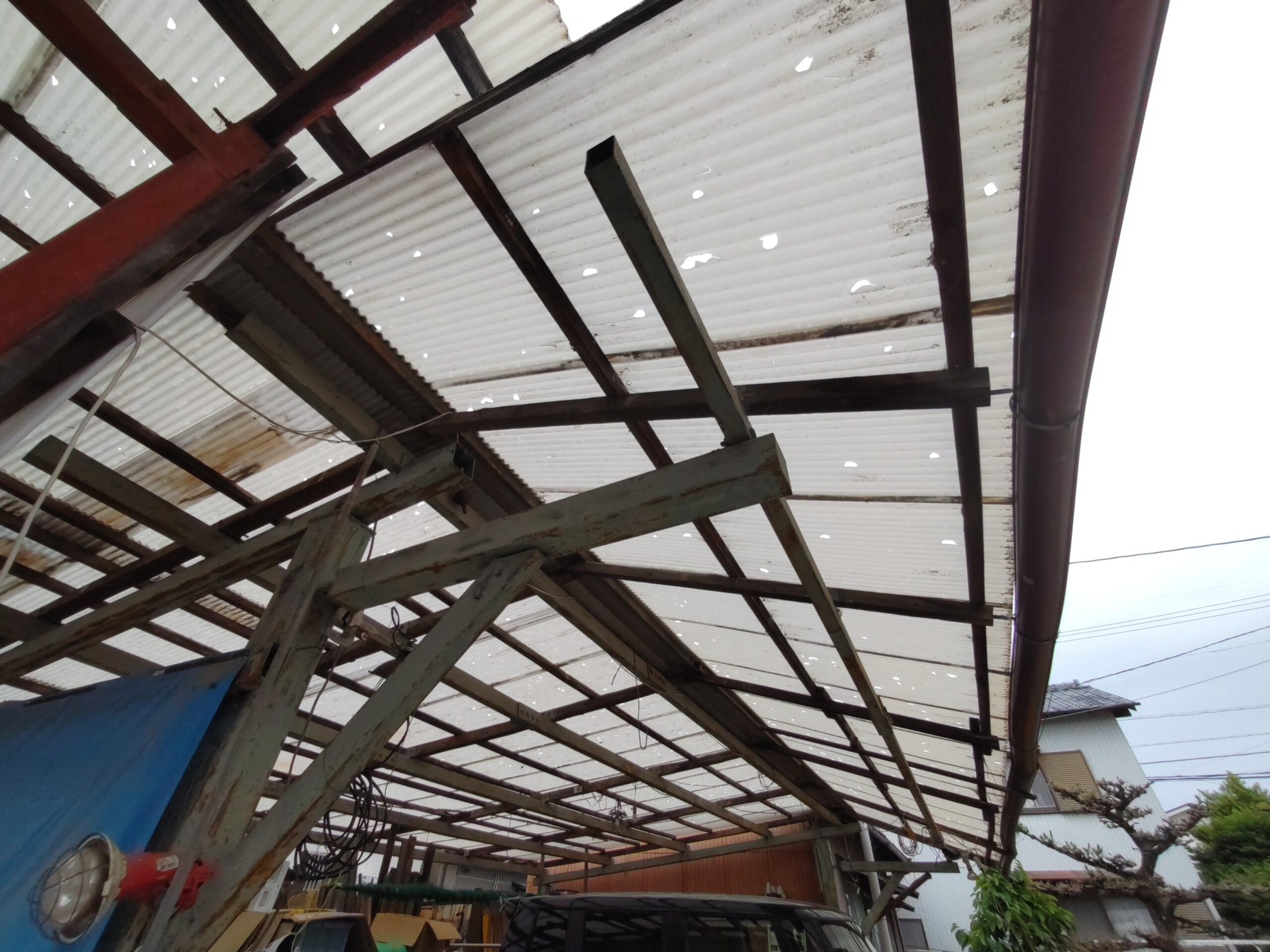 もう一つ仕事をご用命いただきました。春先に豊田市の気候が急激に冷えた日があり、その日は大粒の雹が降ってきたとの事。車庫などの波板をやすやすと貫通して屋根が穴だらけになってしまいました。晴れた日はその影が地面に投影されてまあキレイ、などと不謹慎な事を言っている場合ではない。長年の風雨にさらされた下地木材ごと交換する計画を立てています。