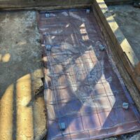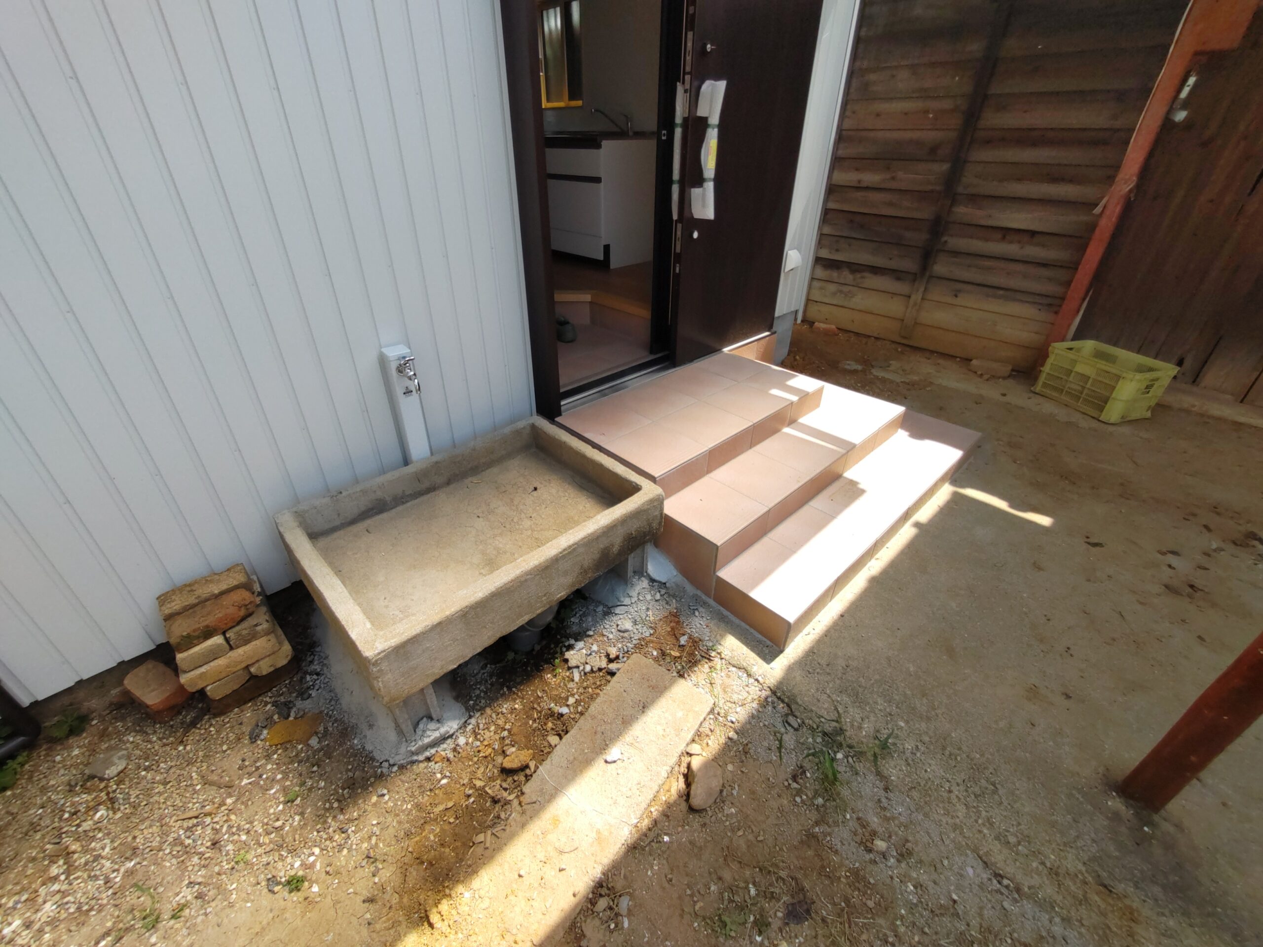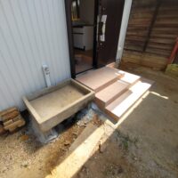 元々の玄関前にも据えられていたコンクリート製の洗い場桶、外壁工事、水道工事を終え元の位置に設置されました。大の大人3人がかかりで持ち上がる重さ。ⅰ様が数十年前に一人で据えられたそうです。