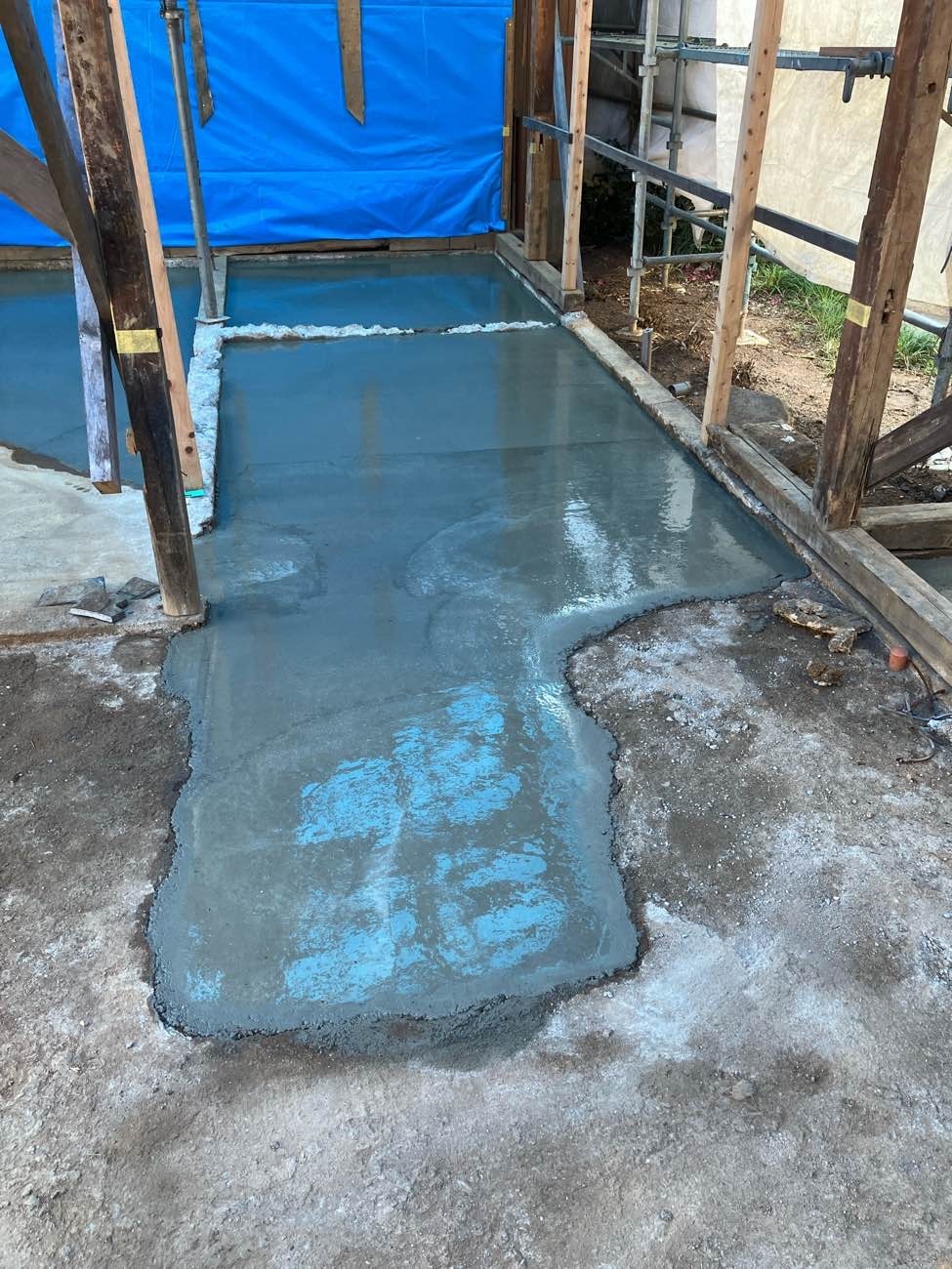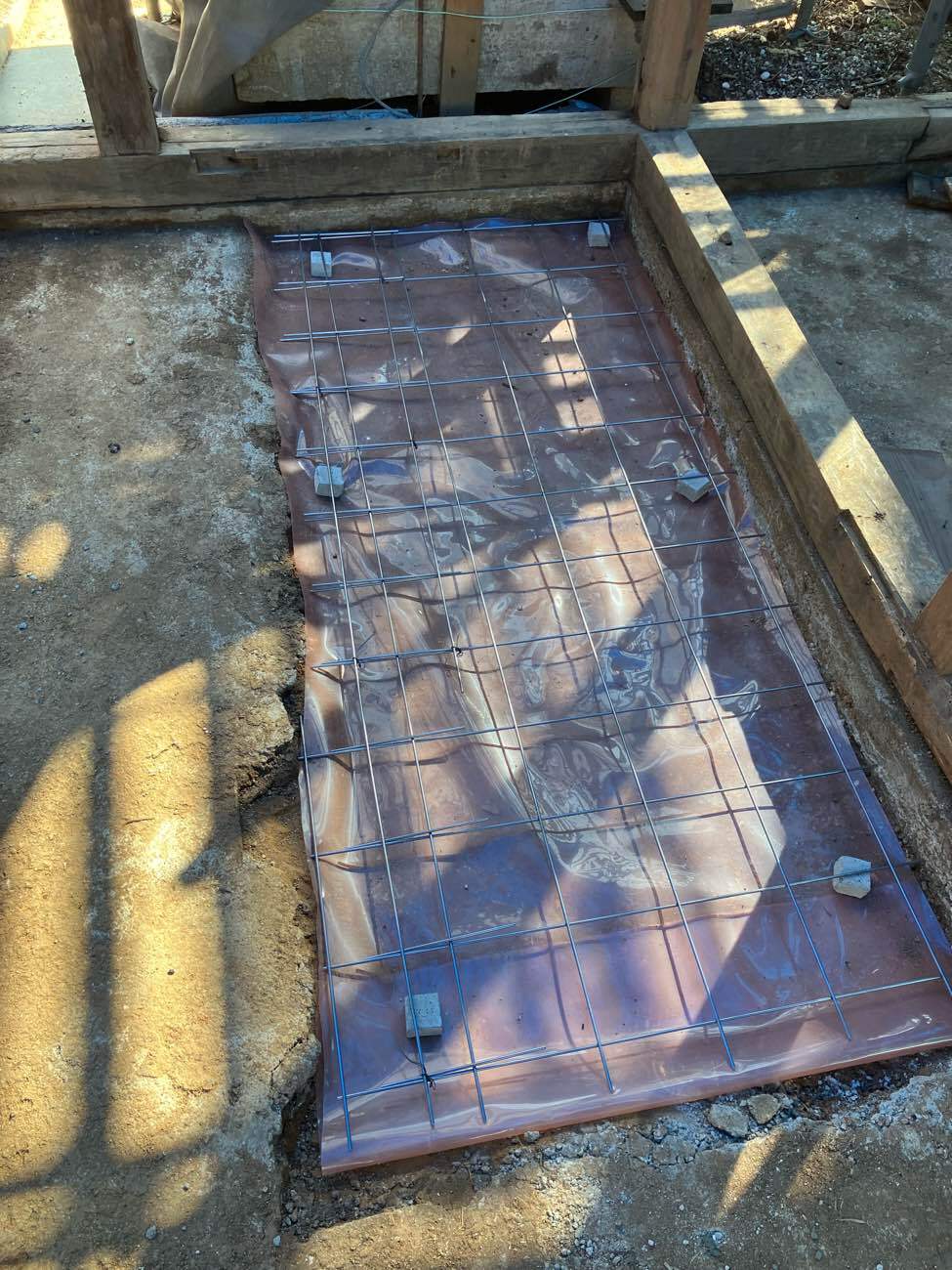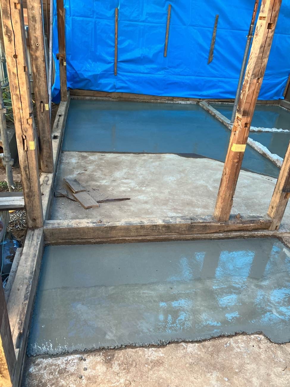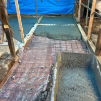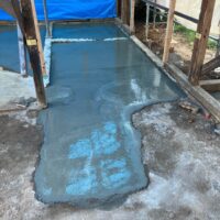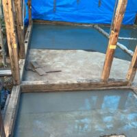 もともと土間であった部分を除いて基礎の下は土のままになっています。湿気や虫などが上がってくるの防ぐために土間コンクリートを打設しました。一部変わった形をしている部分はお父様の話によると昔、かまどがあった部分との事です。