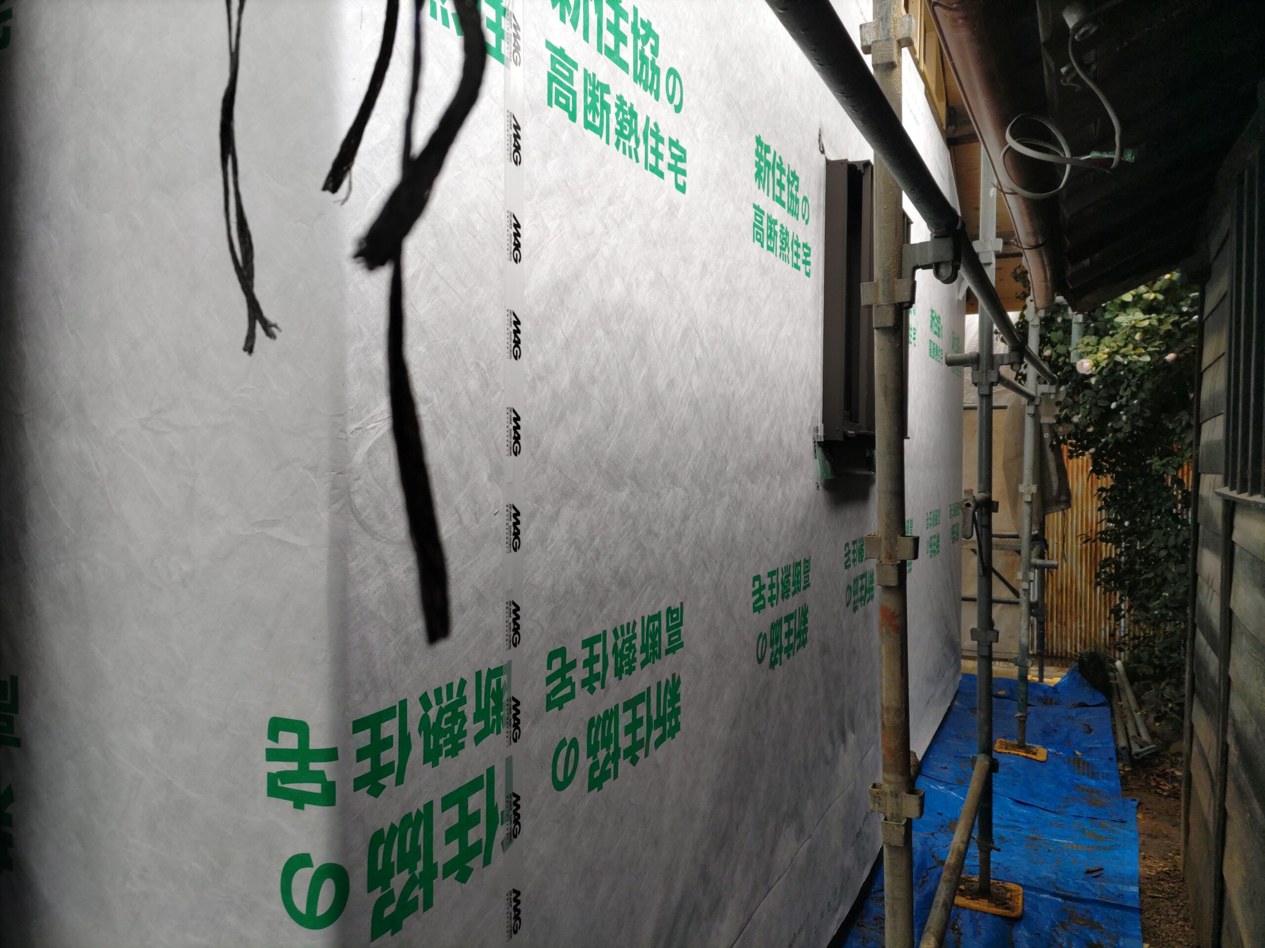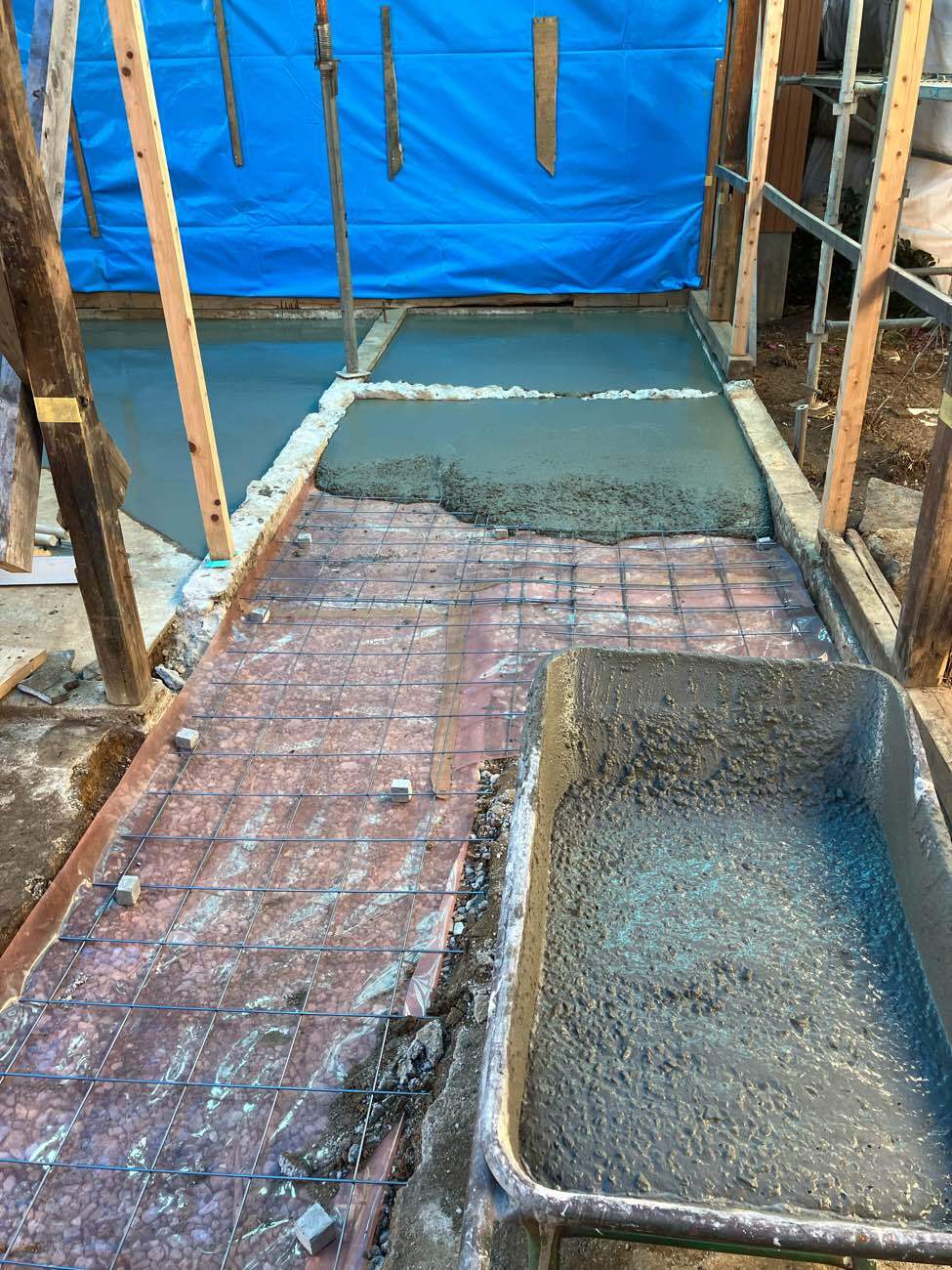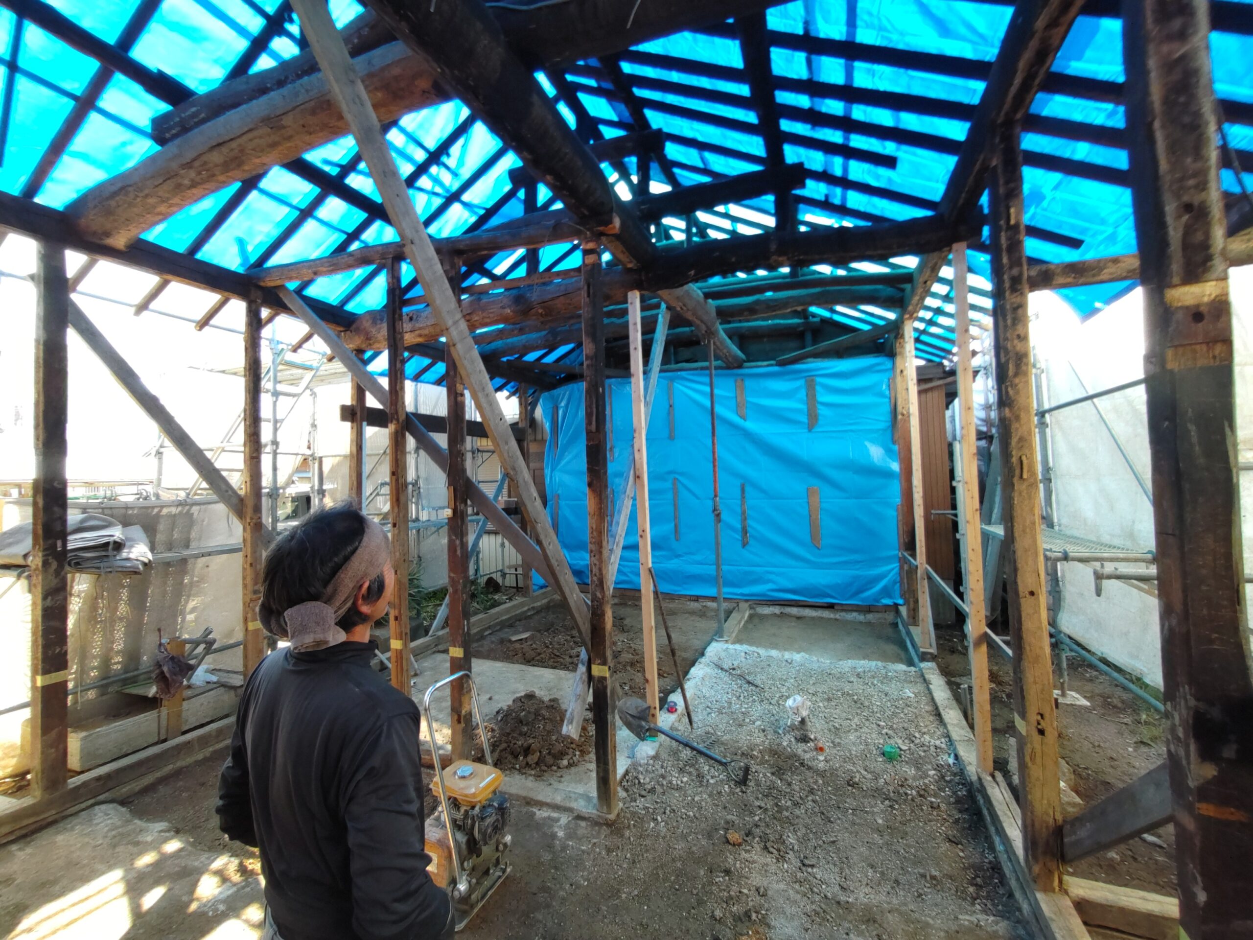 防湿土間コンクリートを打設する下地の工事に入りましたが、今晩は雨の予報。下地が泥だらけにならないように急遽屋根にシート張りを行いました。 同じ豊田市内に建材業者の支店があるのでそこまでひとっ走り押え縁を取りに行き無事にシート張り完了。下から見ると青い光が透けて不思議な光景です。