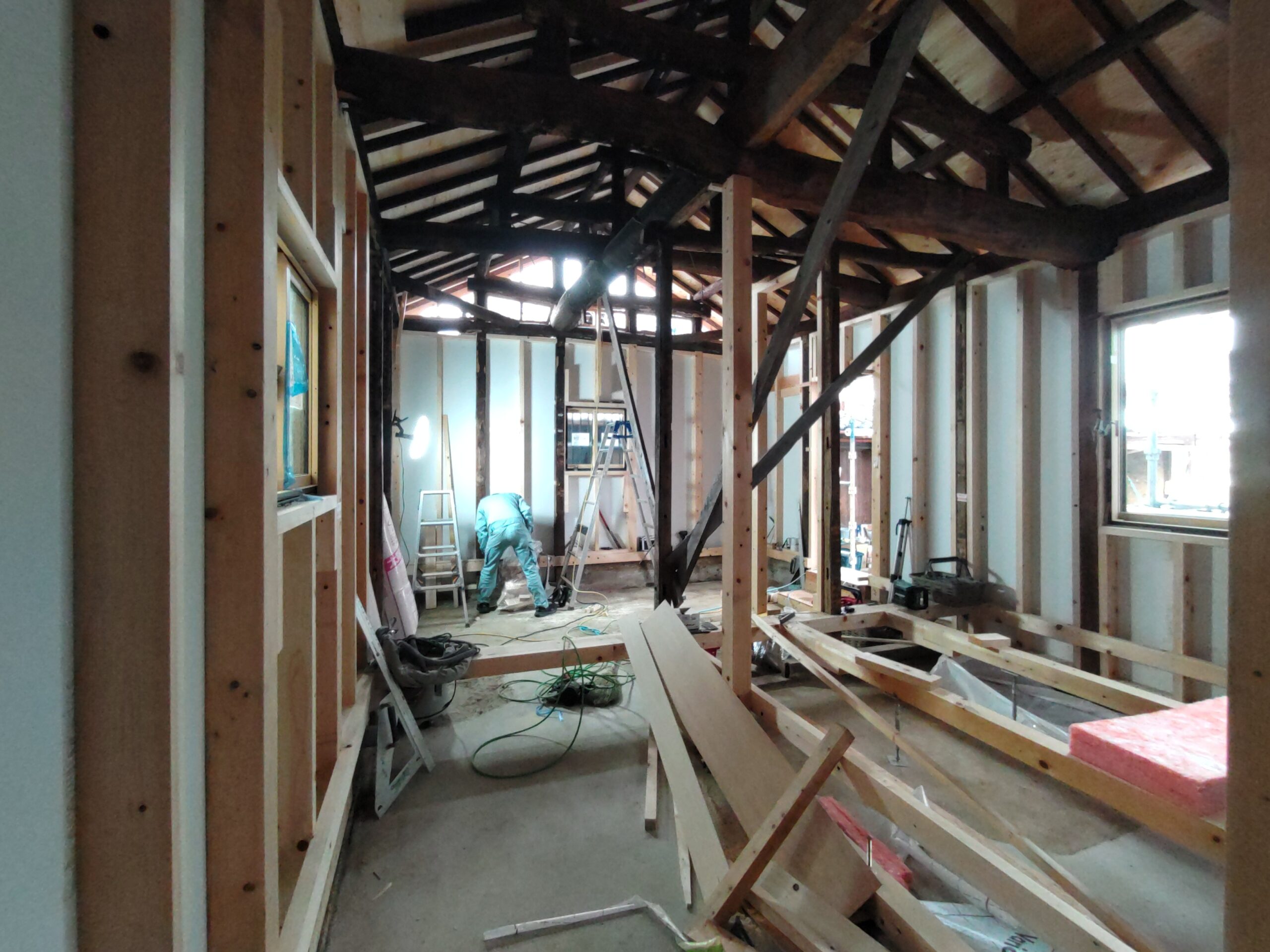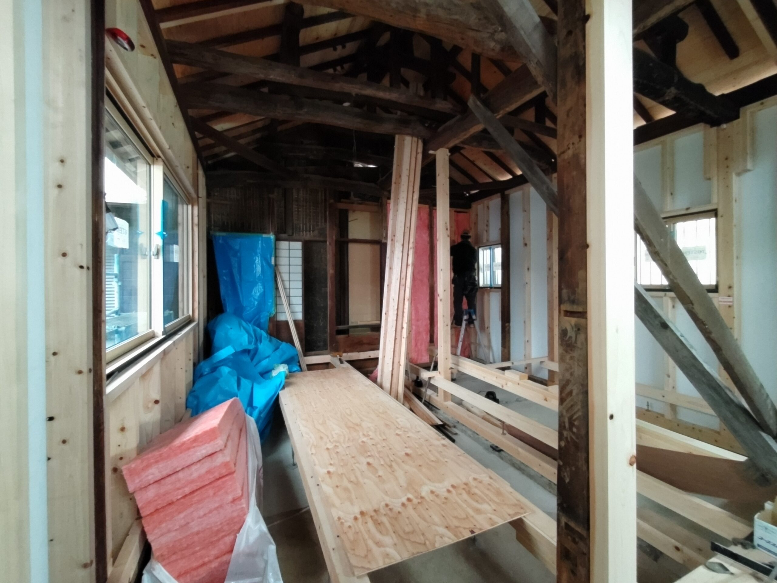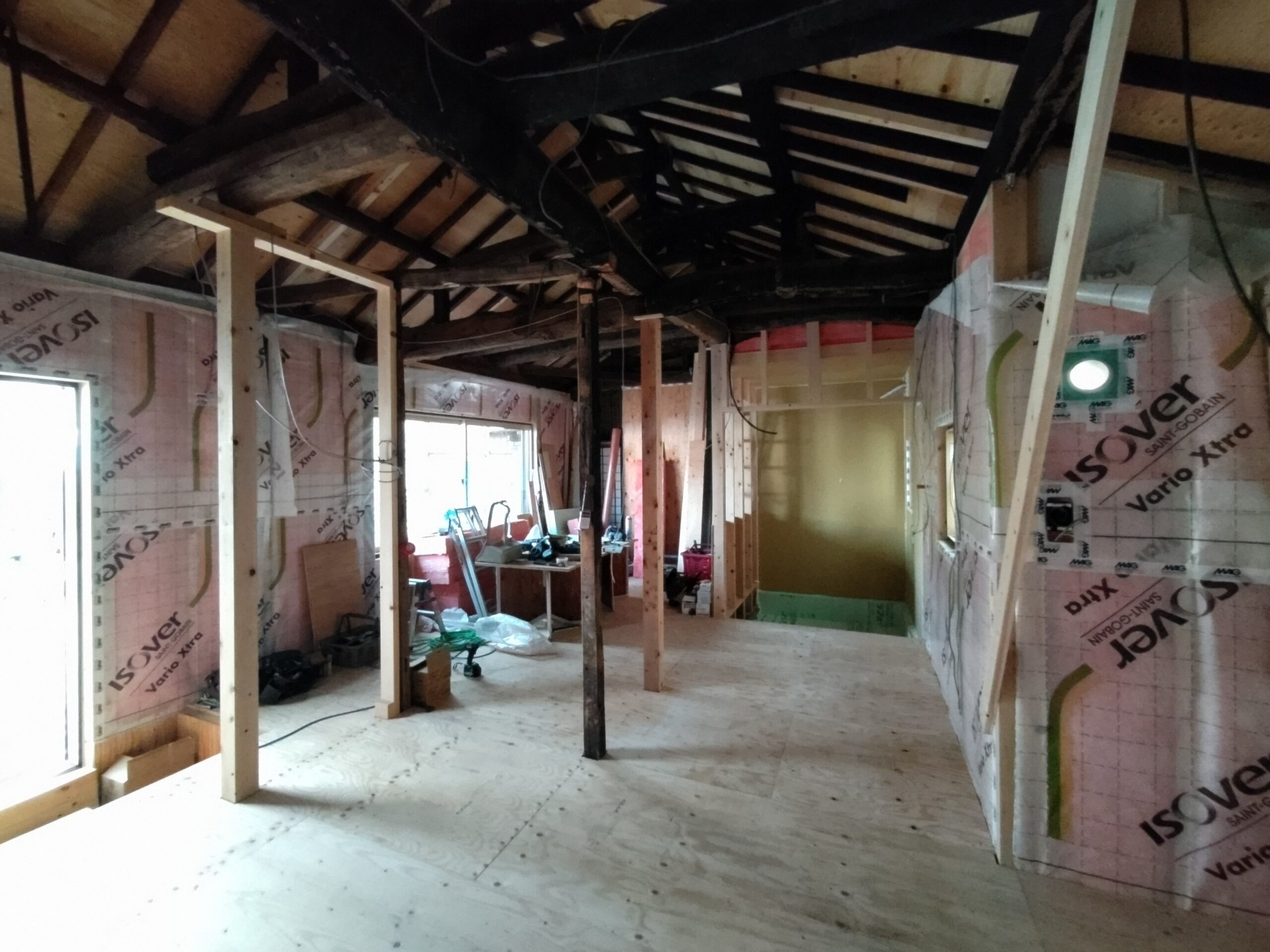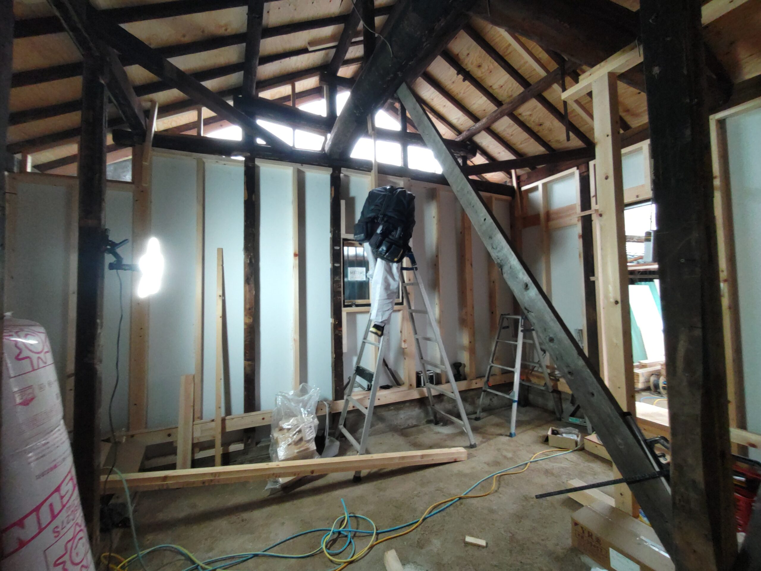 新たな間仕切り下地のために新しい材料を建てていきます。古材の濃い色と新材の明るい色のコントラストが絶妙です。この表情がが内装に活かせれば良いけどなあと思いますが、予算の都合等、内装はいたってシンプルに収める予定です。
