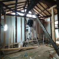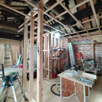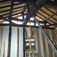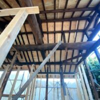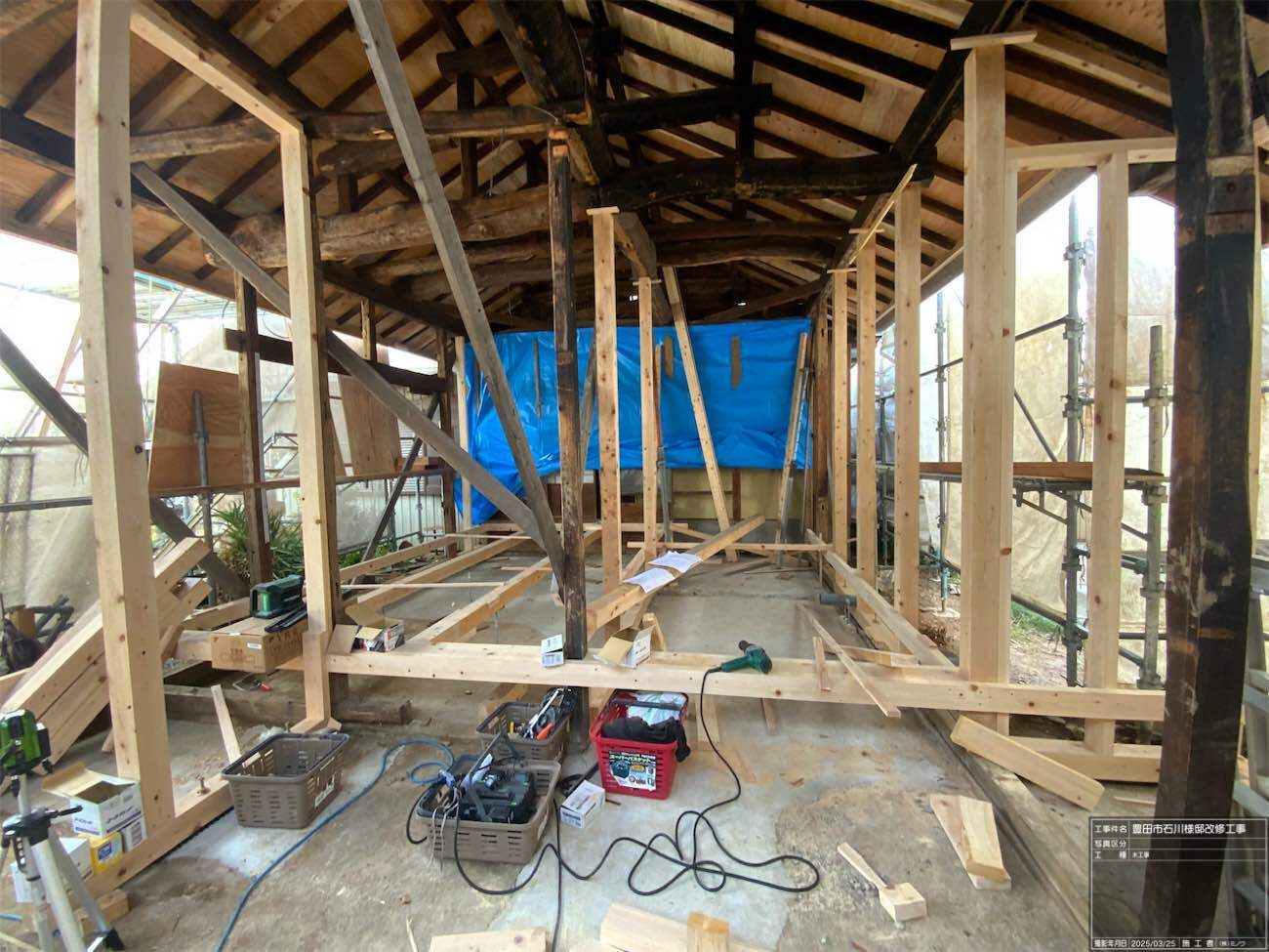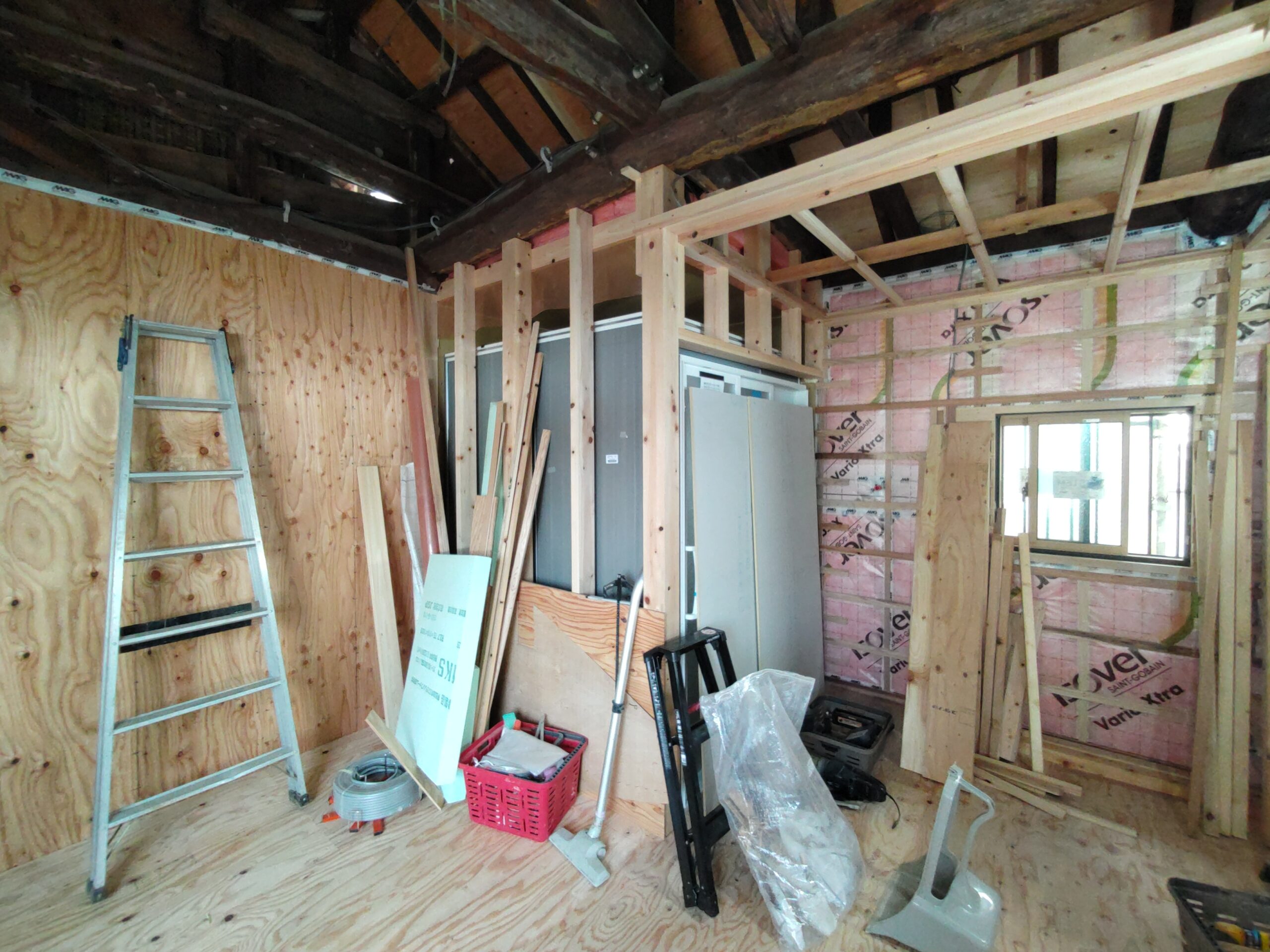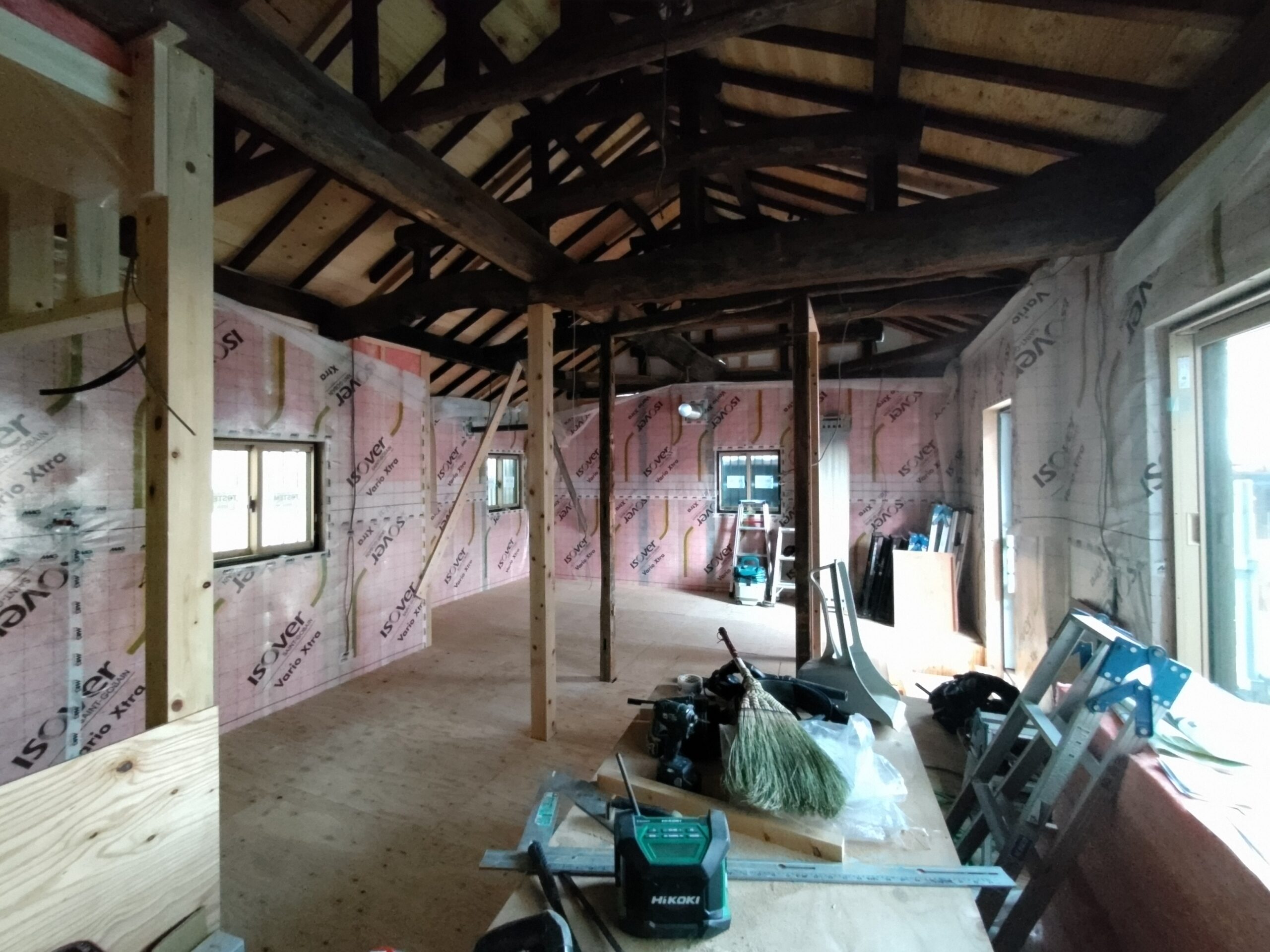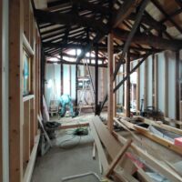 新たな間仕切り下地のために新しい材料を建てていきます。古材の濃い色と新材の明るい色のコントラストが絶妙です。この表情がが内装に活かせれば良いけどなあと思いますが、予算の都合等、内装はいたってシンプルに収める予定です。