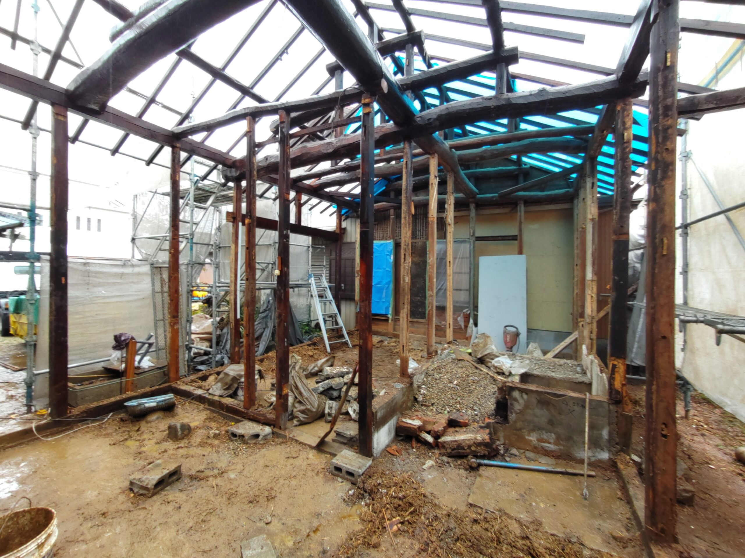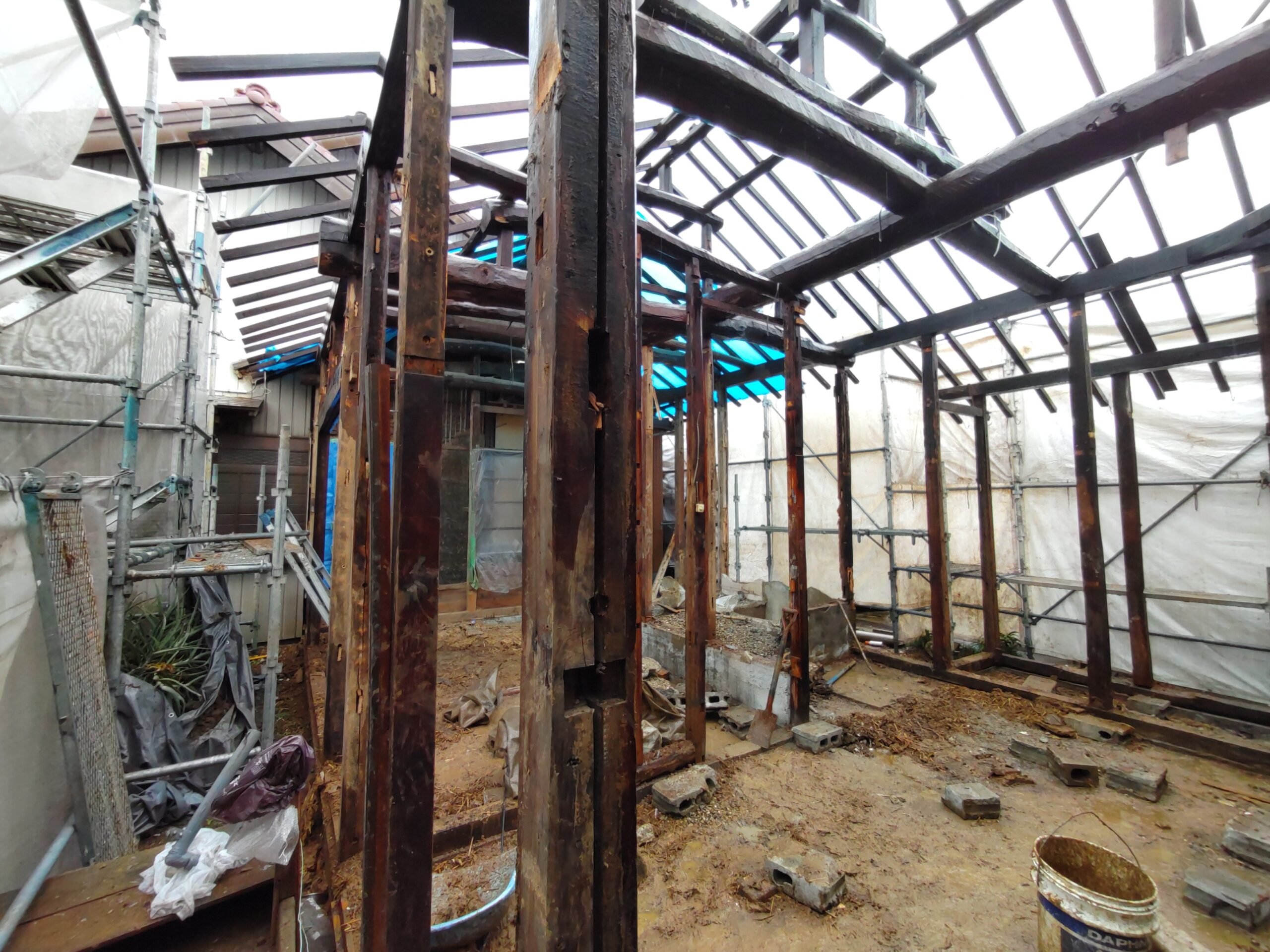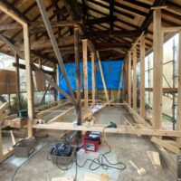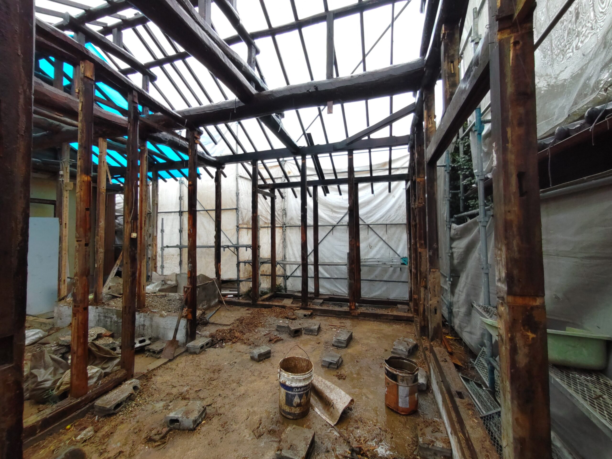 外壁や床も解体され、構造躯体があらわになってきました。丸太の梁で持たせる木造ラーメン構造はこの時代にはよく使われていたと見え、あちこちの旧家で見る事ができます。細かい造作柱で梁を支えるのではなく、ポイントポイントの柱で丸太梁を支え、造作柱は壁を作成するために建てる、現代での間柱のような役割を果たしています。