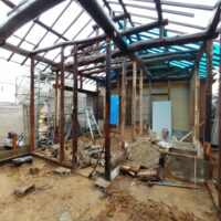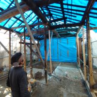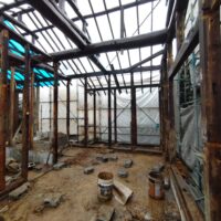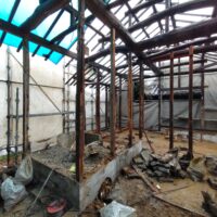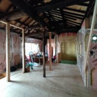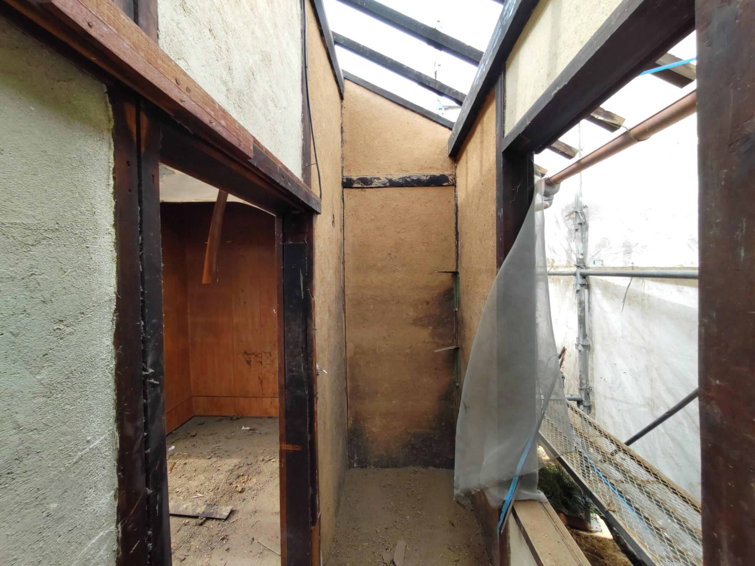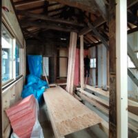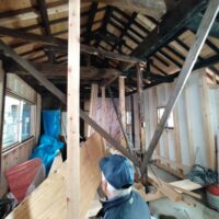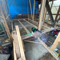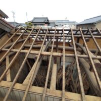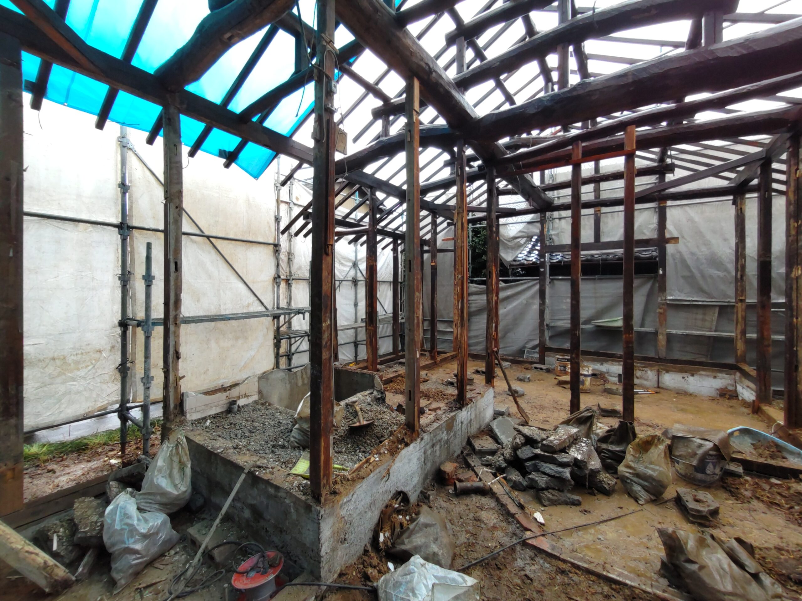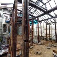 外壁や床も解体され、構造躯体があらわになってきました。丸太の梁で持たせる木造ラーメン構造はこの時代にはよく使われていたと見え、あちこちの旧家で見る事ができます。細かい造作柱で梁を支えるのではなく、ポイントポイントの柱で丸太梁を支え、造作柱は壁を作成するために建てる、現代での間柱のような役割を果たしています。