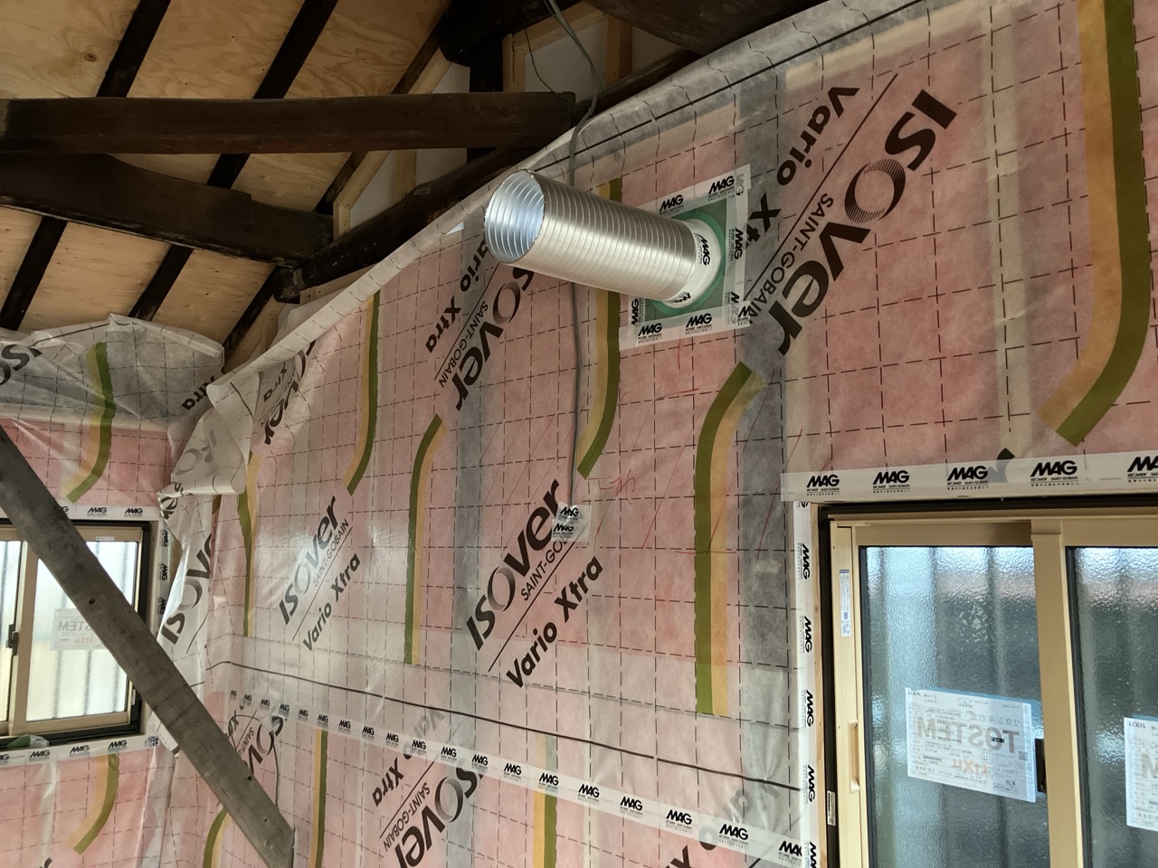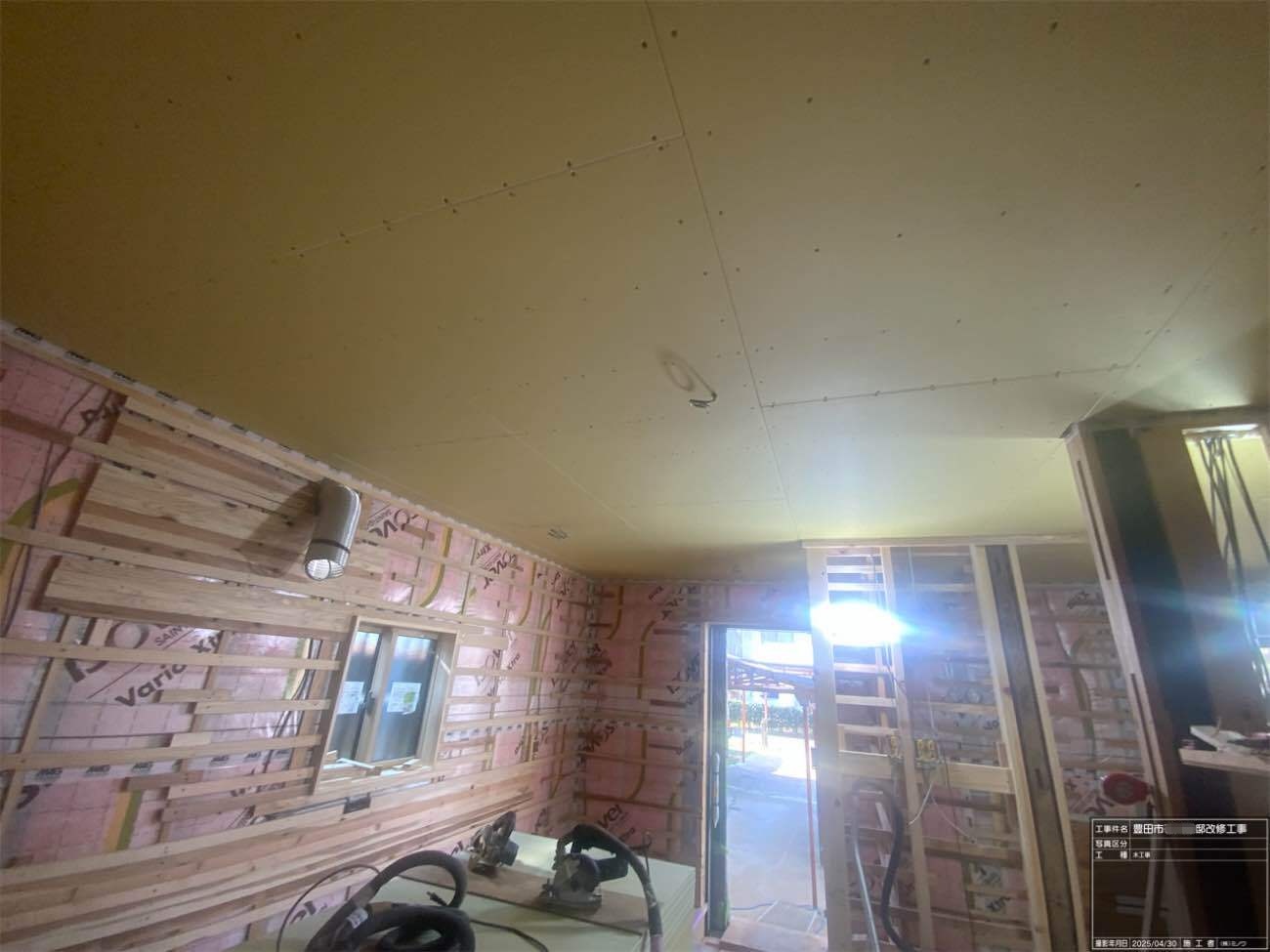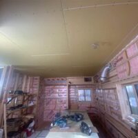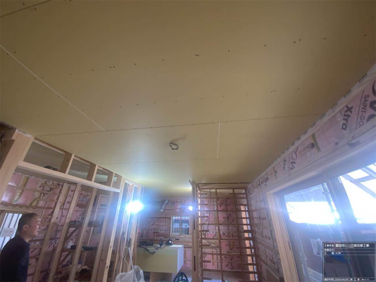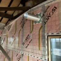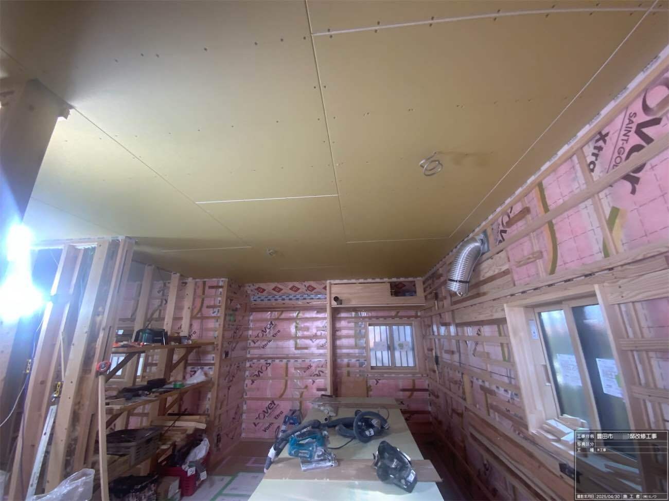 天井の断熱材の施工が進んでいます。離れの建物ほぼワンルームのため施工面積も少なく、作業の進み具合がなかなかに早いです。