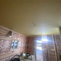 内装下地石膏ボードを張っていきます。天井断熱材敷設の時も思いましたが、立派な丸太の梁組を見えなくしてしまうのもなんだか名残惜しいものです。ご予算の都合上まっすぐ天井を張ってしまった方が合理的との事でこの仕様としています。その分、断熱材は無理なく敷設でき、気積も少ないので省エネで快適な空間で生活していただきたいと思います。