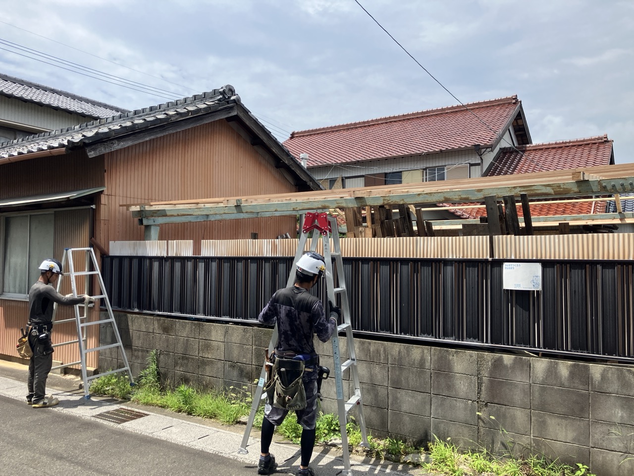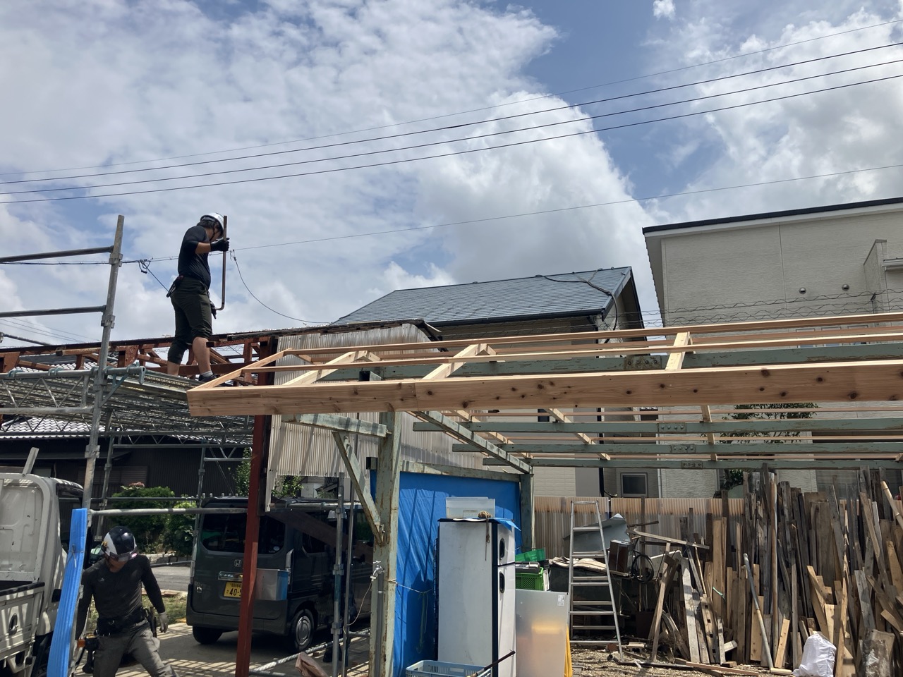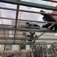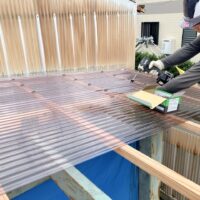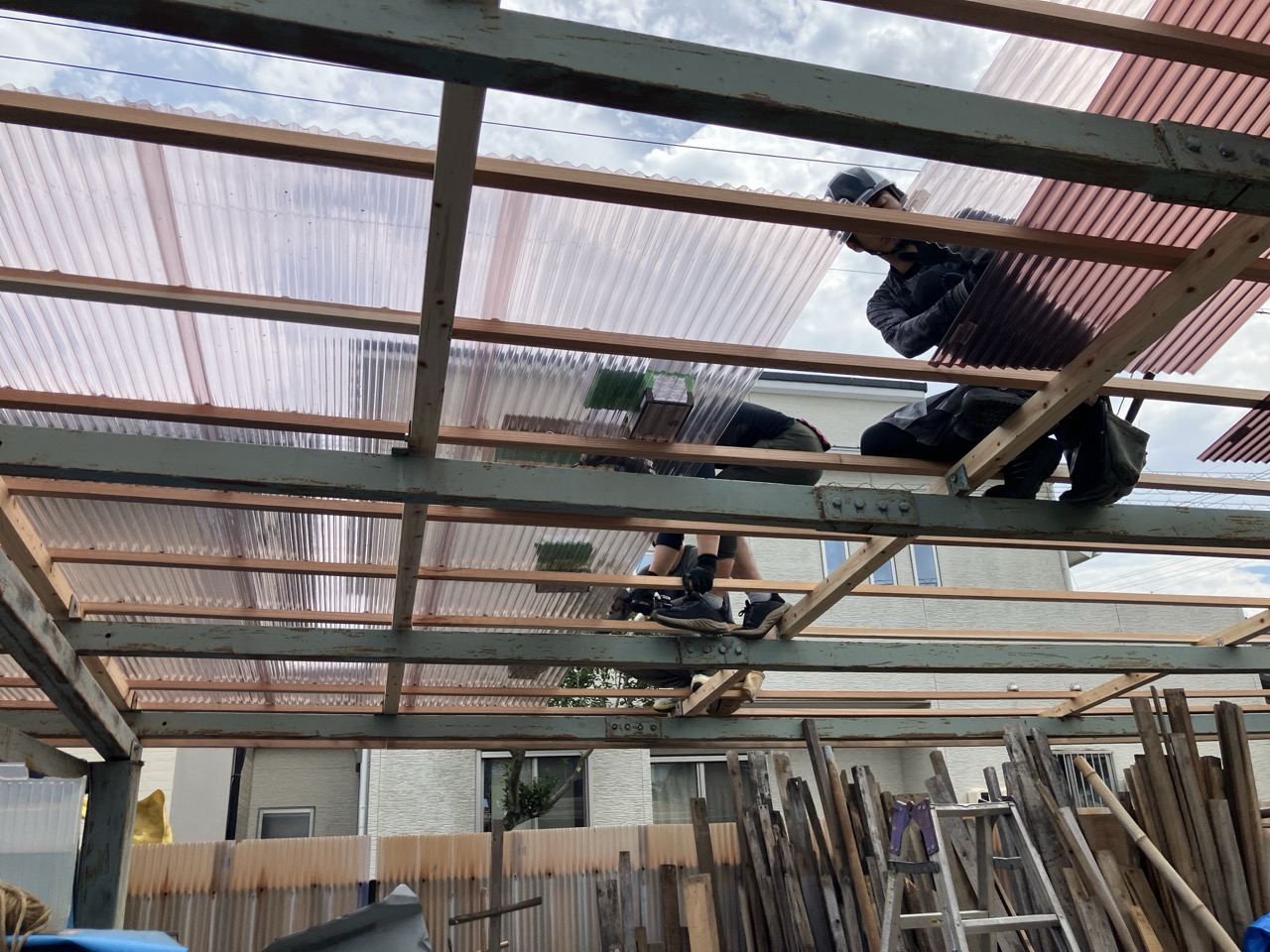 小屋の波板屋根張替工事がスタートしています。本日は日差しが暑いながらも時折涼しい風が吹く、珍しく作業はしやすい日でありました。