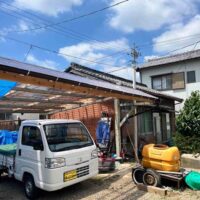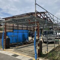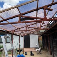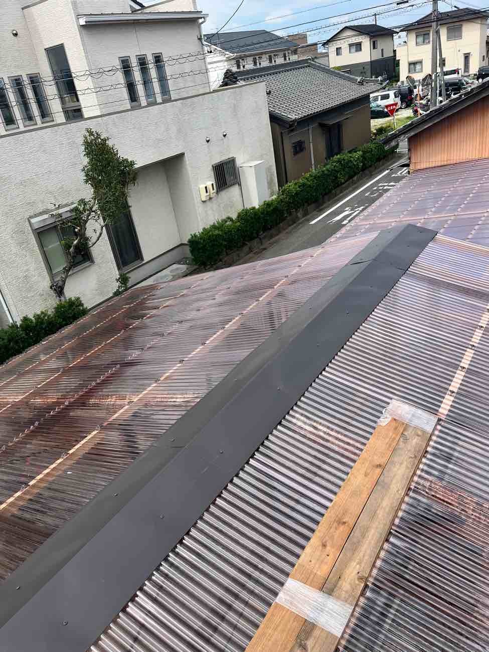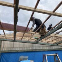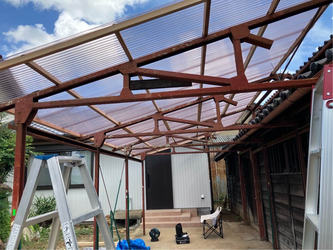 小屋の波板屋根張替工事がスタートしています。本日は日差しが暑いながらも時折涼しい風が吹く、珍しく作業はしやすい日でありました。