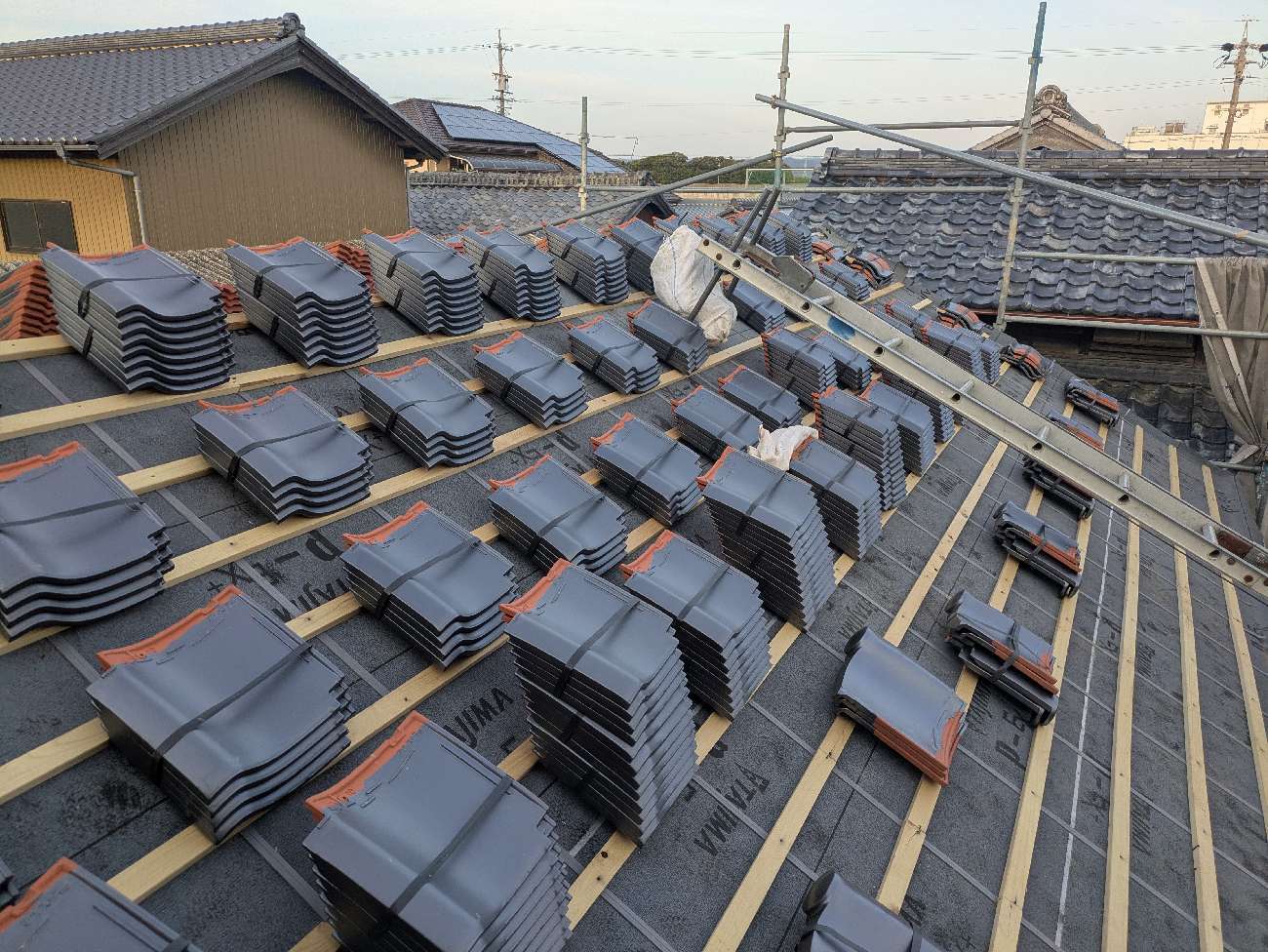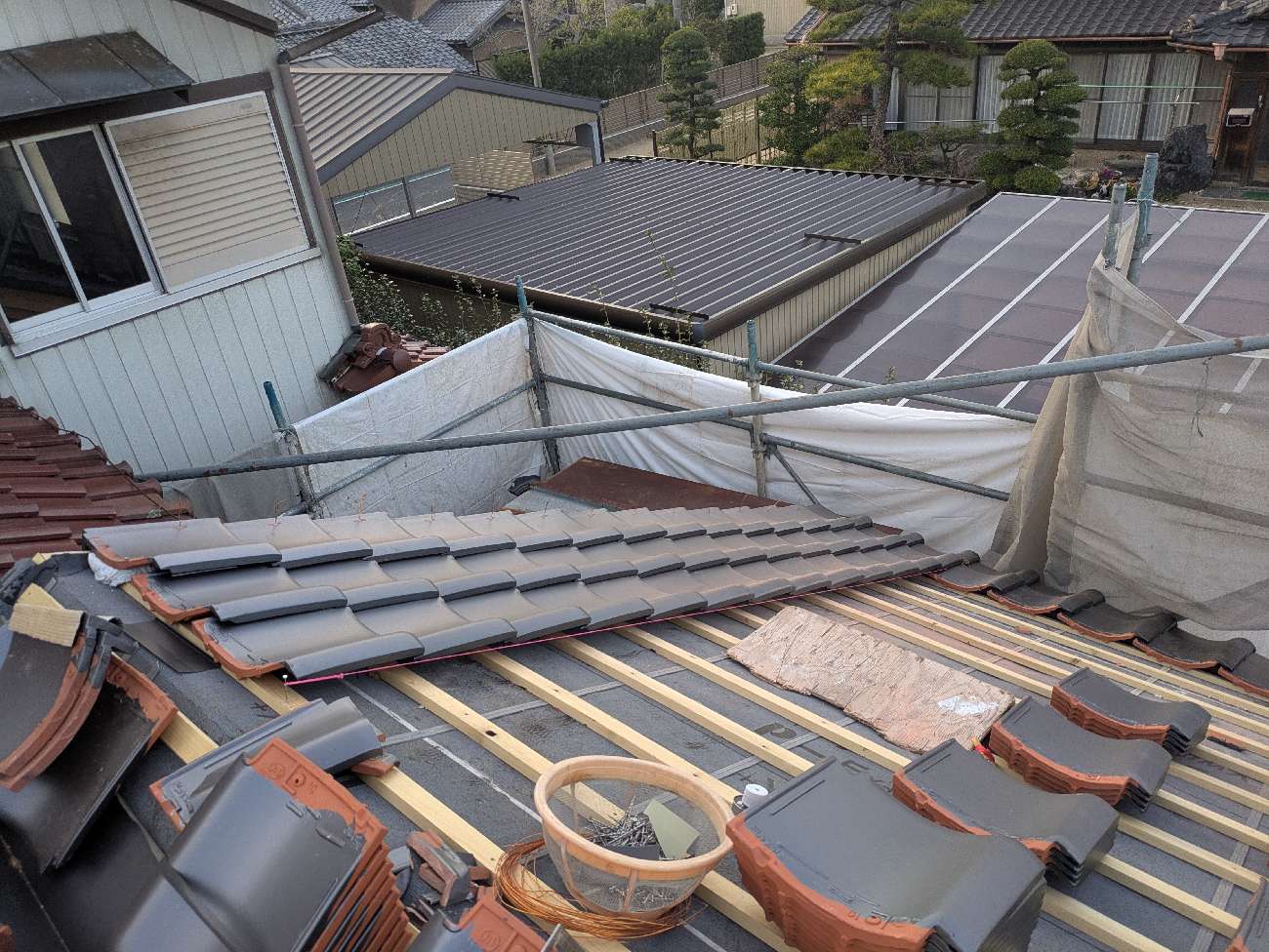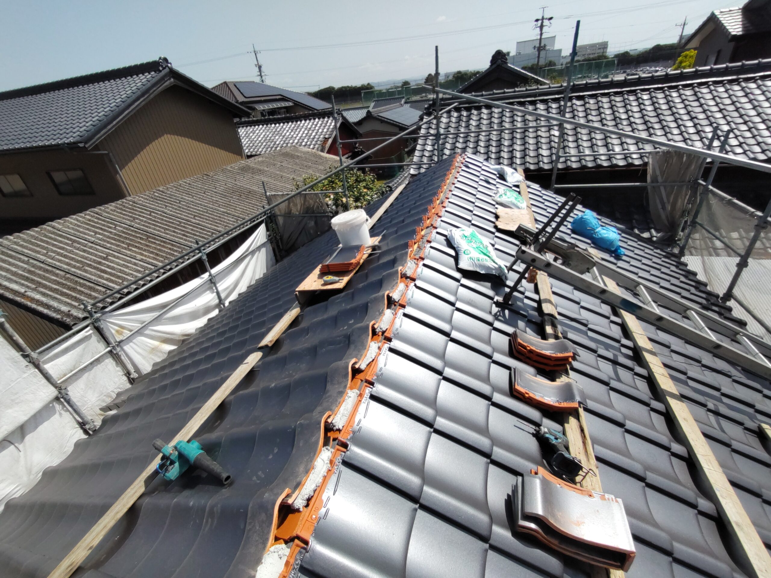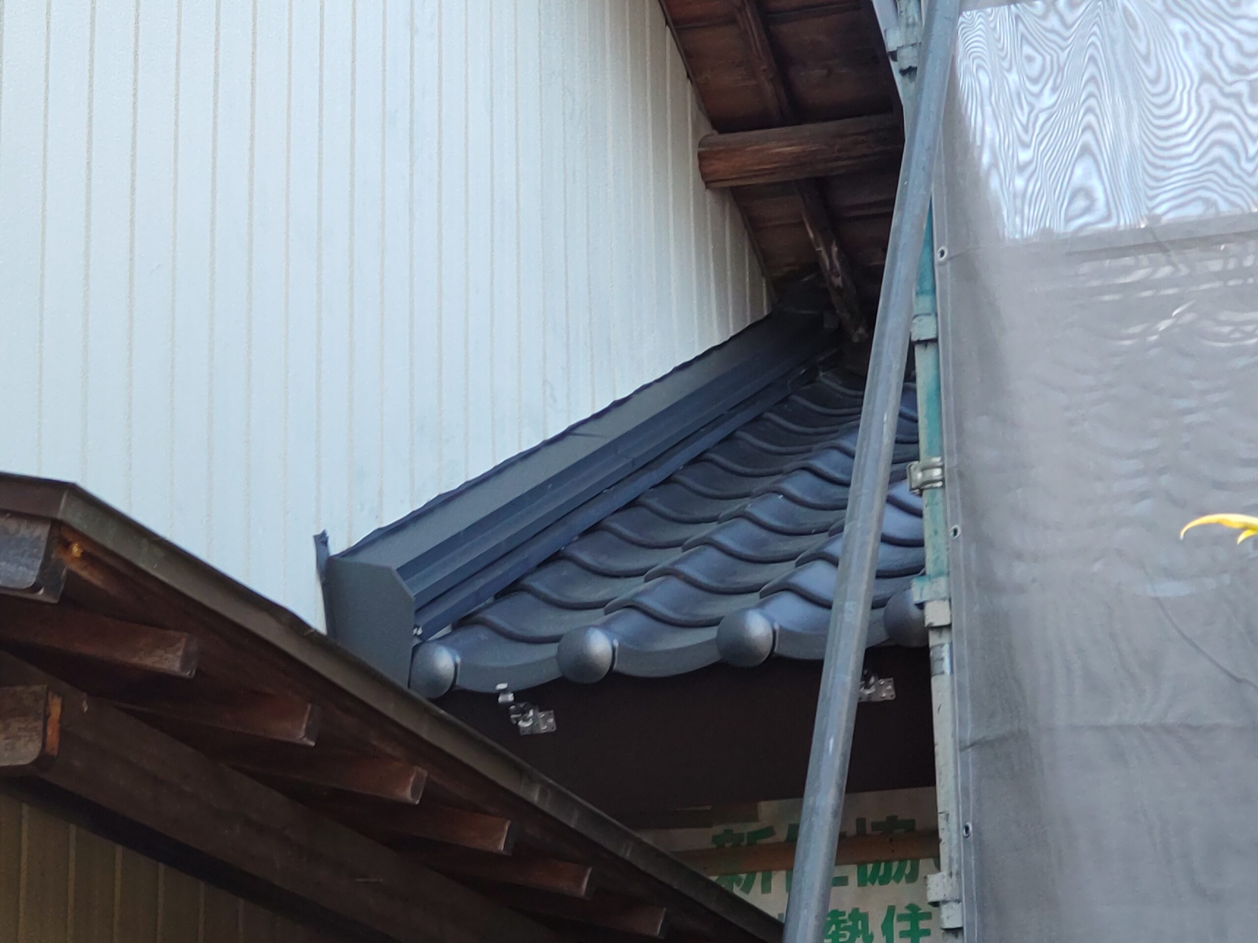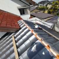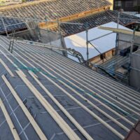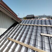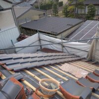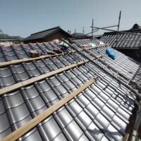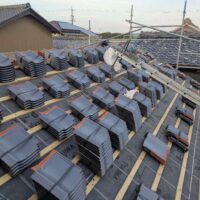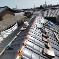 屋根瓦伏せ工事が進んでいます。昨年行った隣の主屋の屋根と同じく、それよりももっと古いこの離れの屋根はもちろん当時の防水紙は敷設されておらず、瓦土のみで設置されていました。逆に今まで数十年良く持った方です。これよりは新しい現代の工法で屋根が伏せられますので安心できると思います。