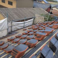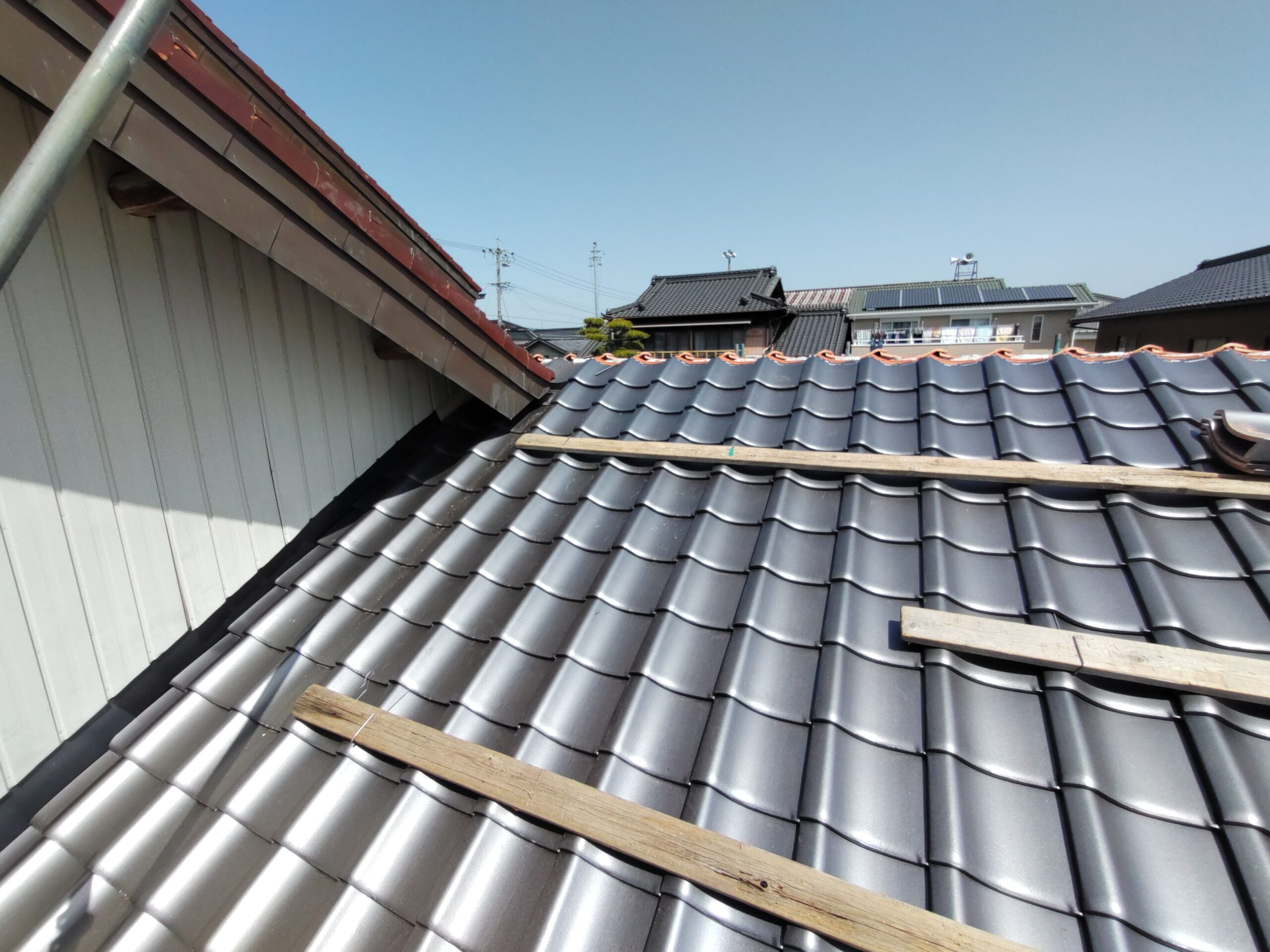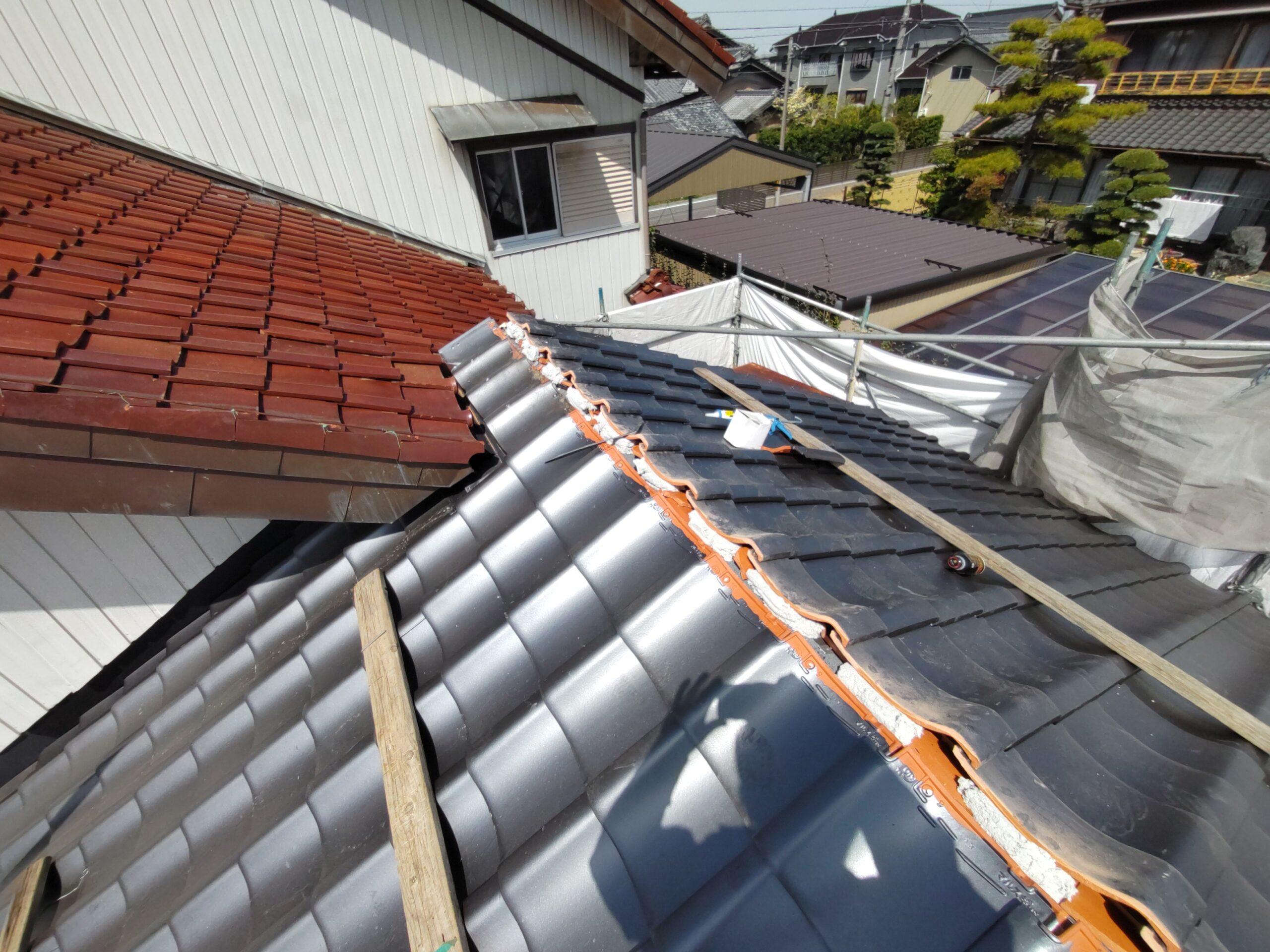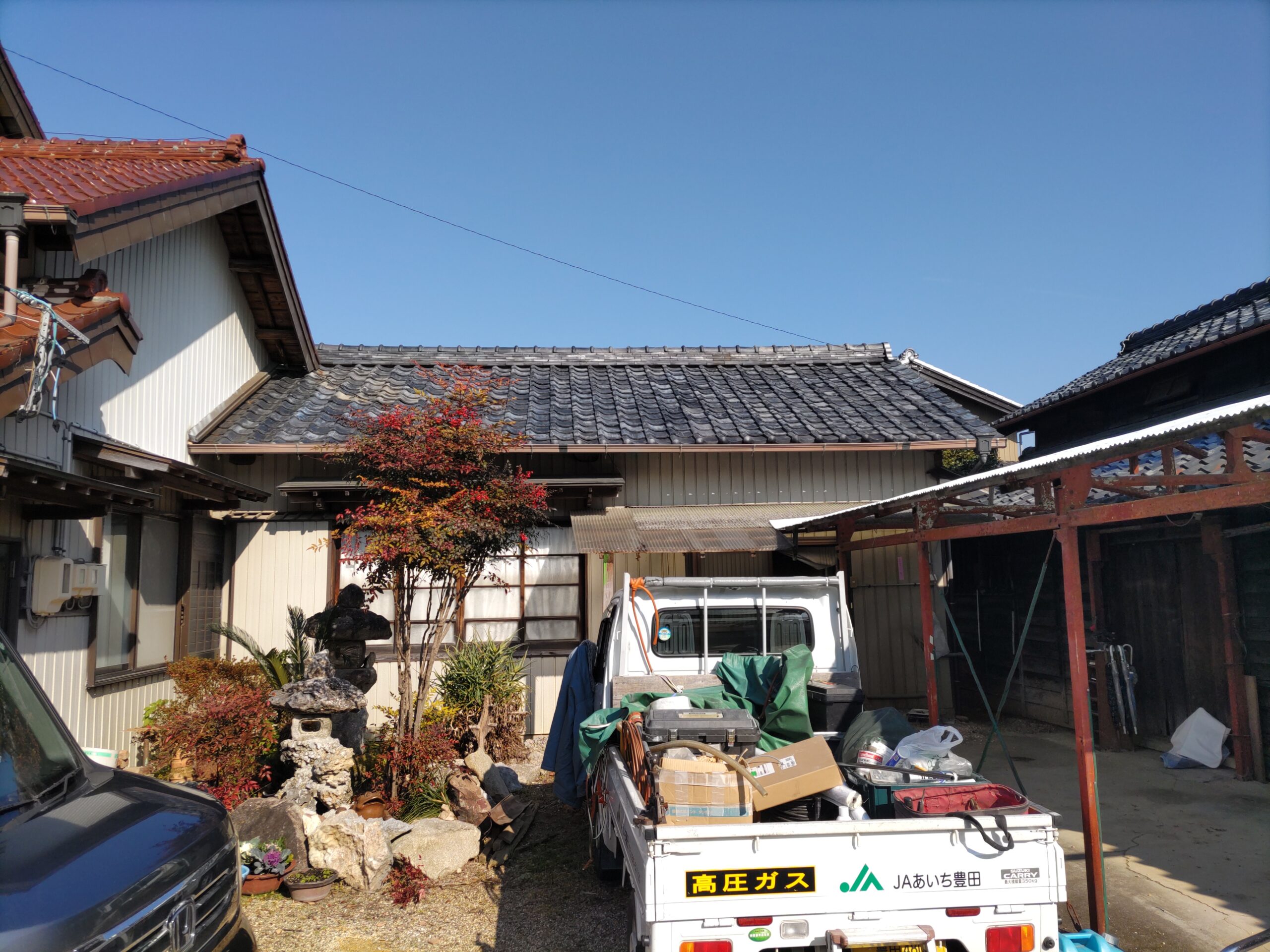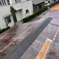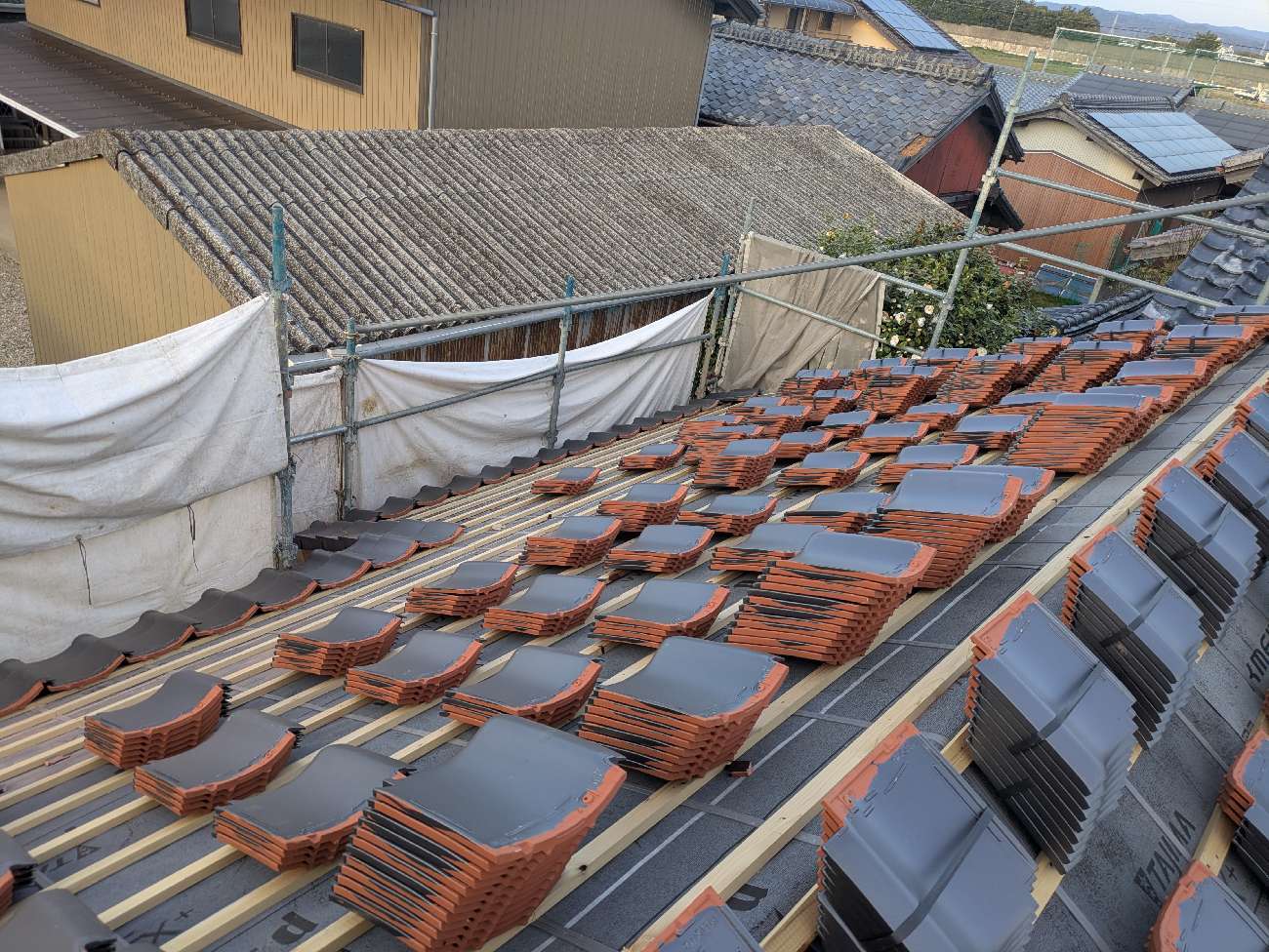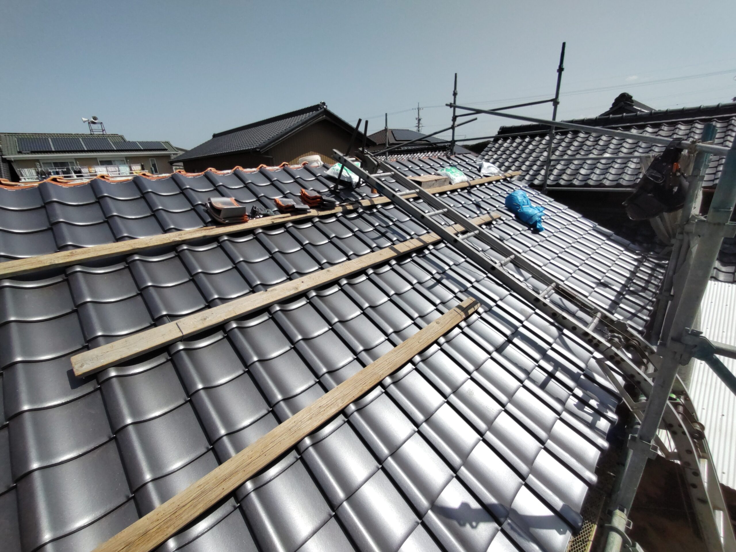 屋根瓦伏せ工事が進んでいます。昨年行った隣の主屋の屋根と同じく、それよりももっと古いこの離れの屋根はもちろん当時の防水紙は敷設されておらず、瓦土のみで設置されていました。逆に今まで数十年良く持った方です。これよりは新しい現代の工法で屋根が伏せられますので安心できると思います。