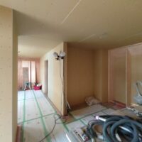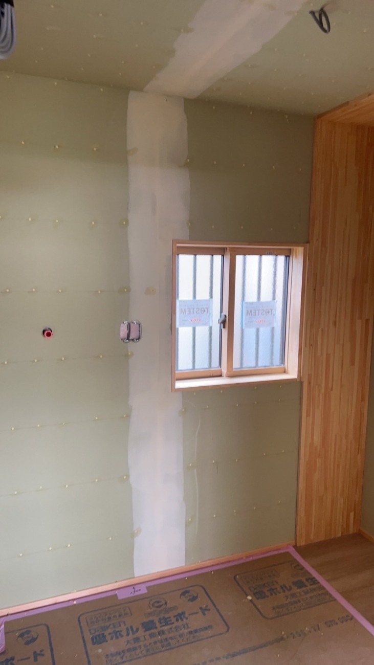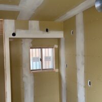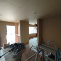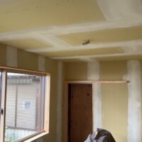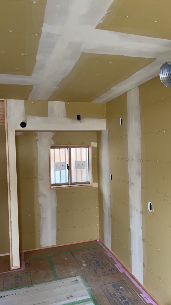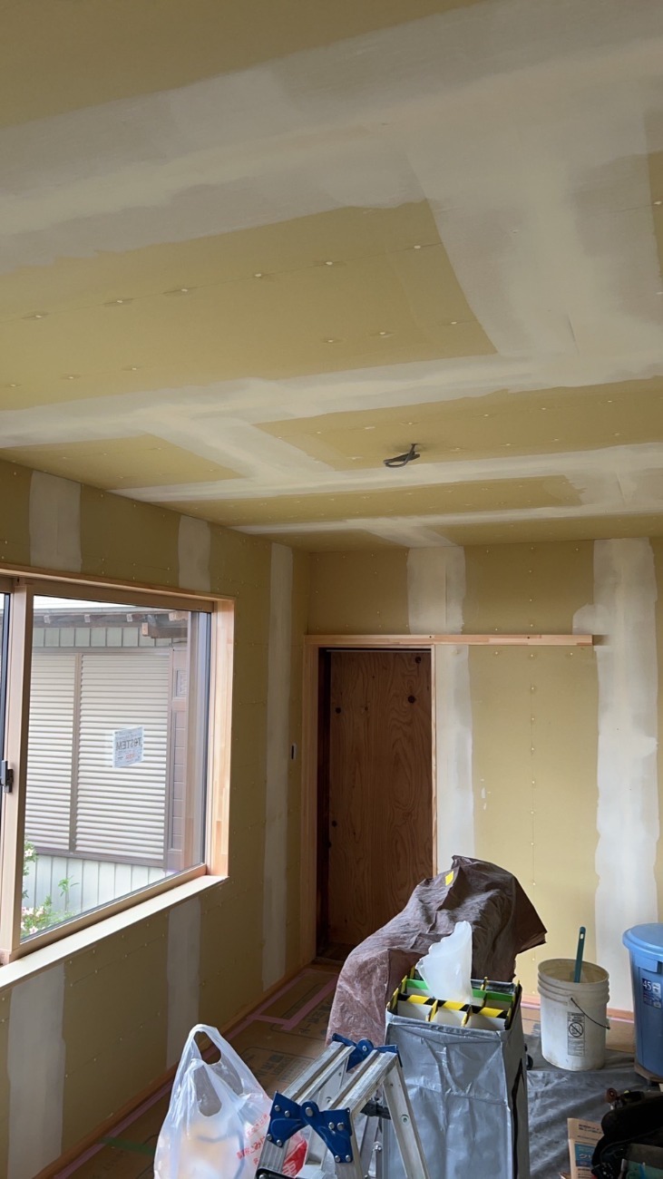 内装工事の下地パテ処理に入っています。下地下地ボード同士の継目の部分にパテを打ち仕上面を平滑にしていきます。