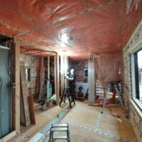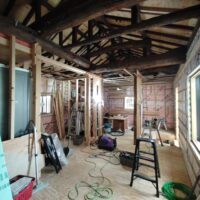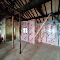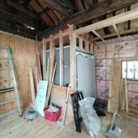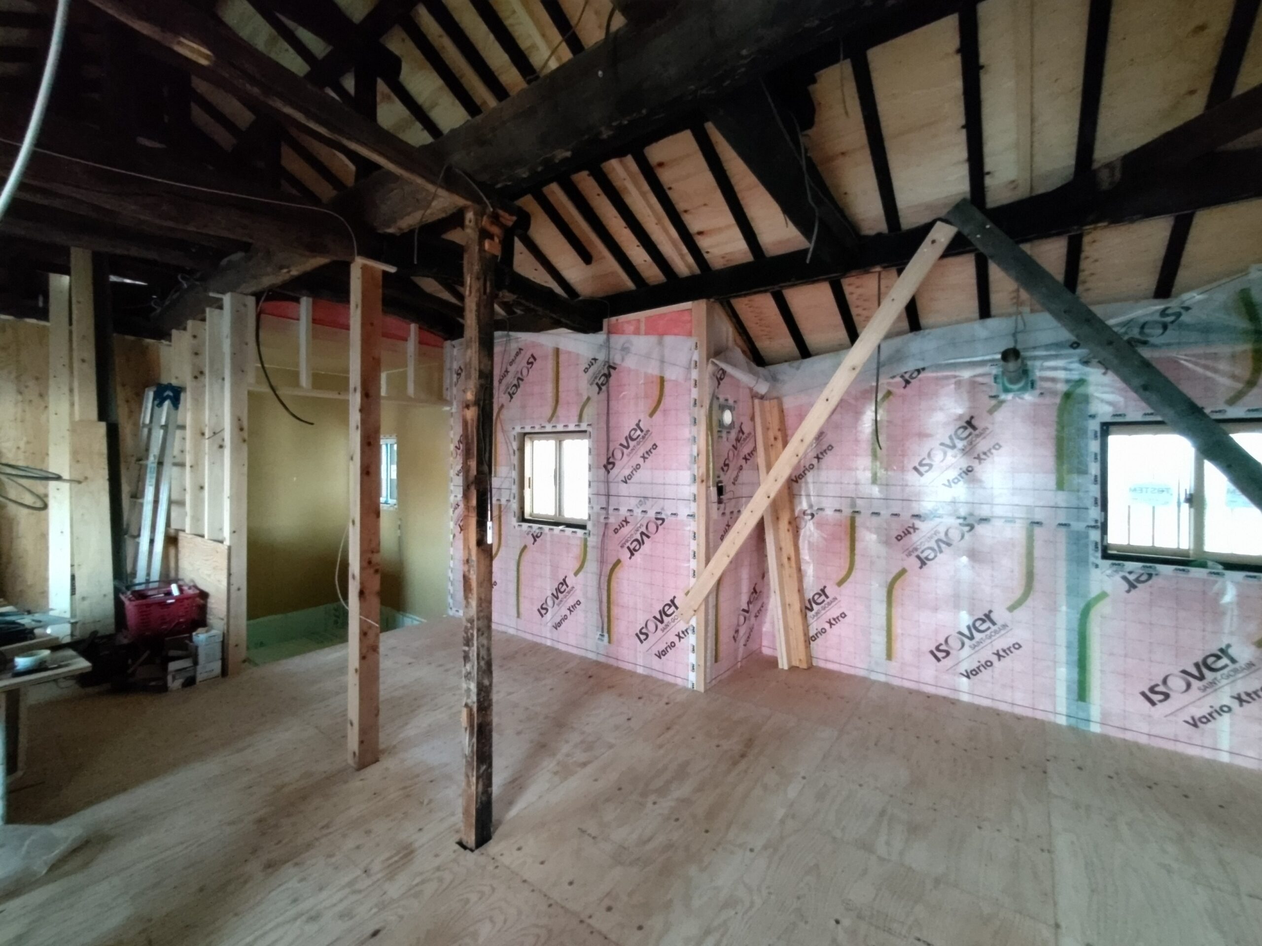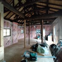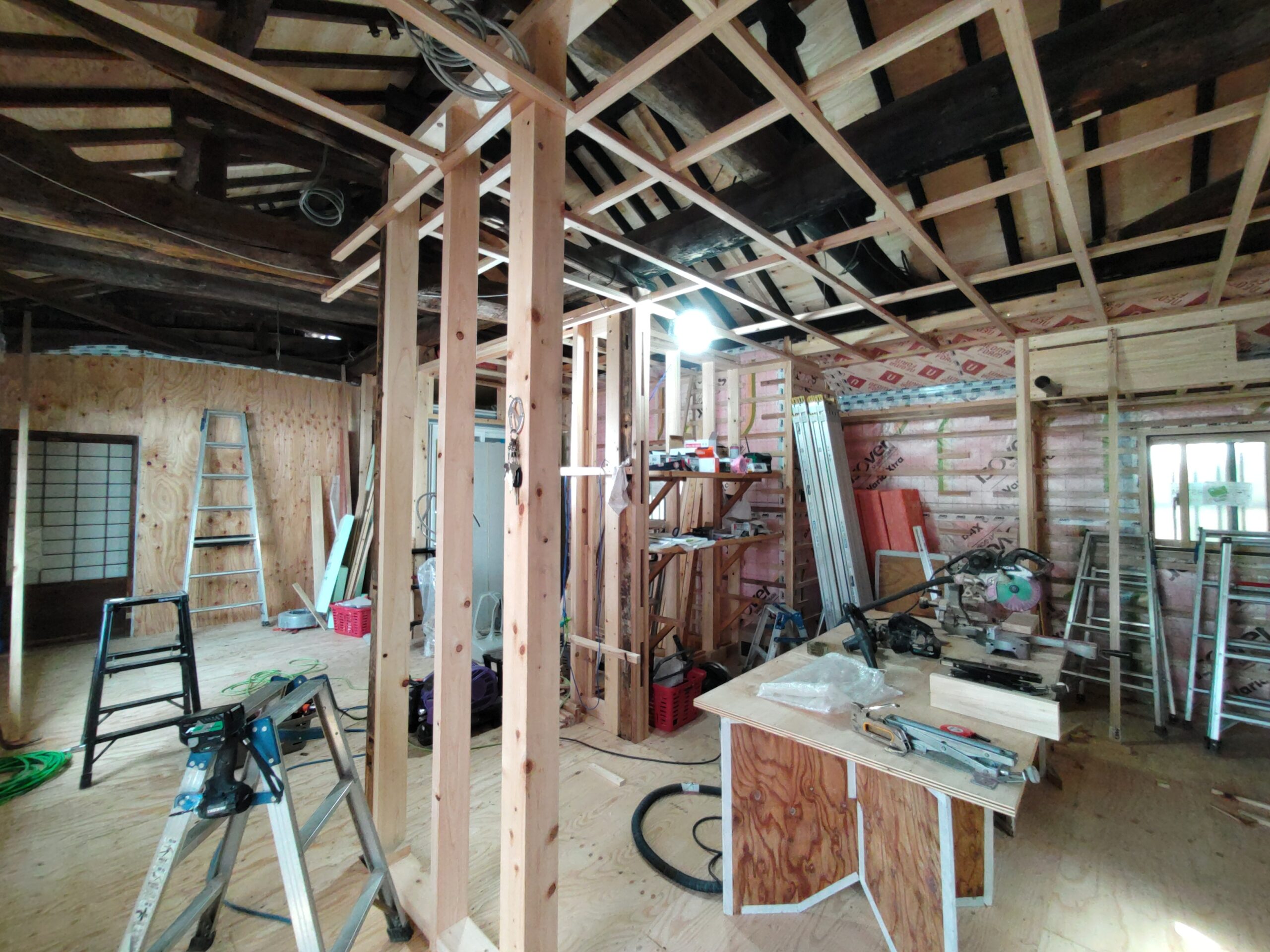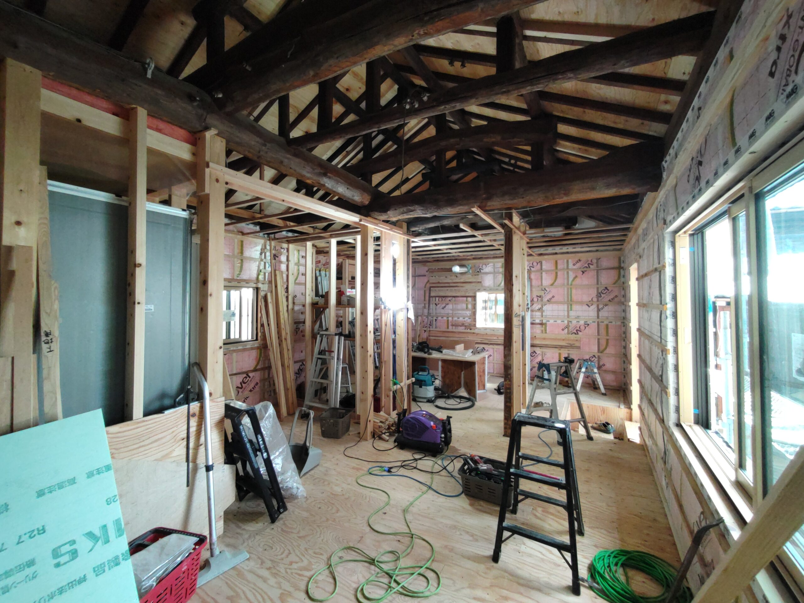 構造、仕上下地、断熱を刷新する工事が進んでいます。新築工事と違い、柱間や梁の寸法が一定ではないので各箇所へ各材料を収めるのにも1カ所ずつ採寸しながらの進行です。特に丸太梁の絡む部分は下地を作るのも一苦労です。
