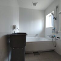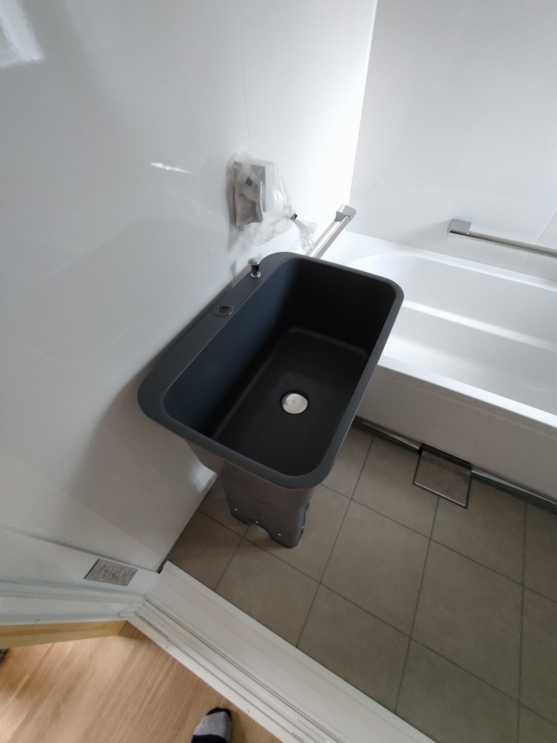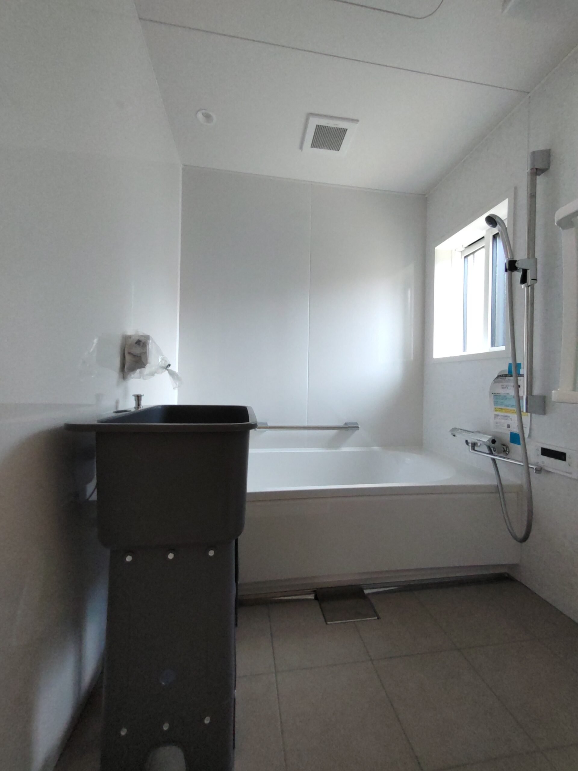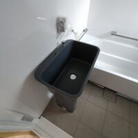 ユニットバス内に現れた樹脂製のシンク台。ア○○ンで購入したものをデンと据え置いています。ⅰ様が飼われている小型犬を浴室内で洗いたい、という事で寸法や使い勝手など何かないものかと探していたらちょうど見つけたものです。本来はガーデンシンクとしての製品ですが、こういった事にも使えるんですね。ネットの力恐るべし。