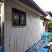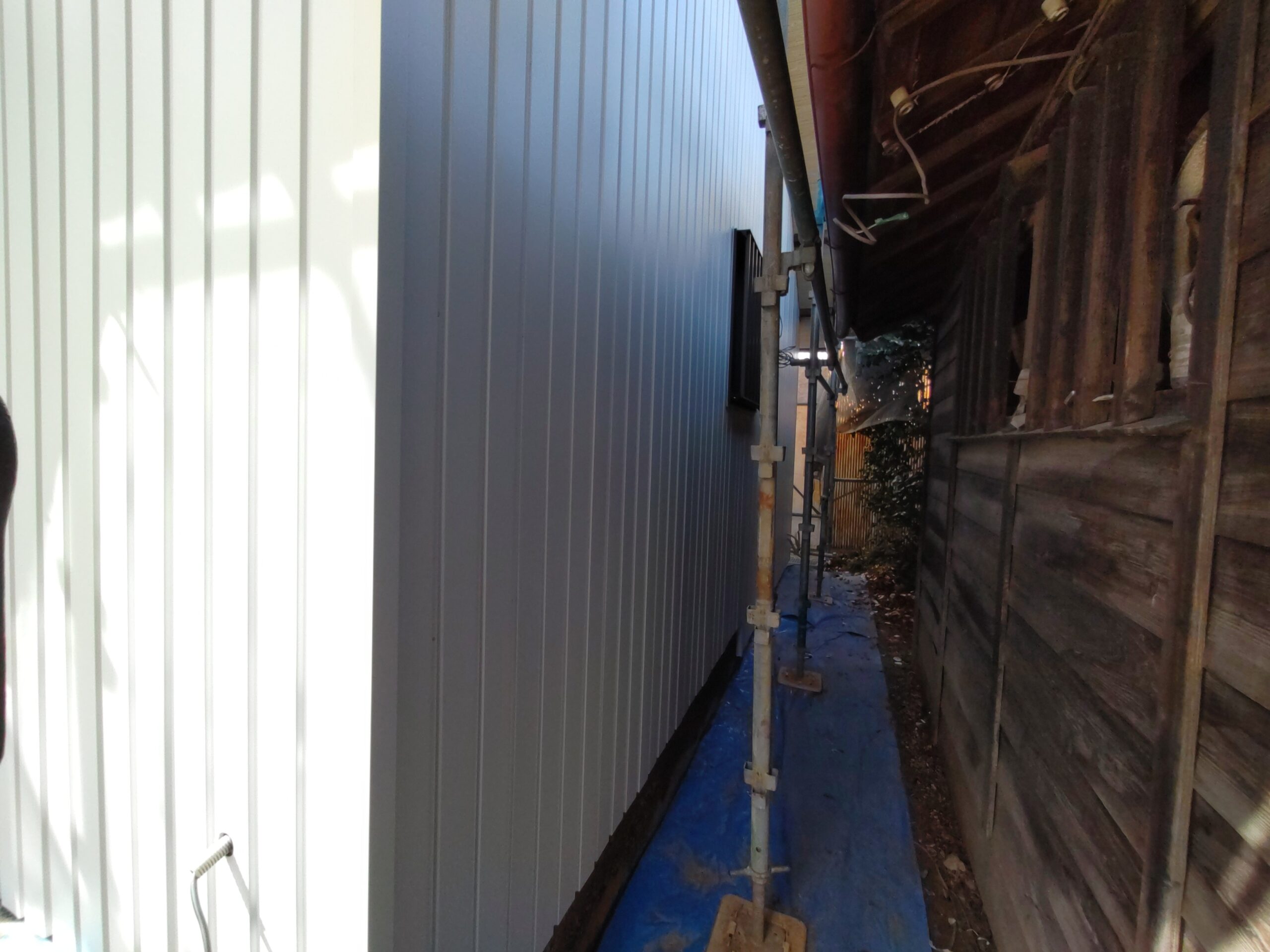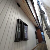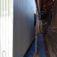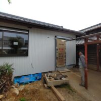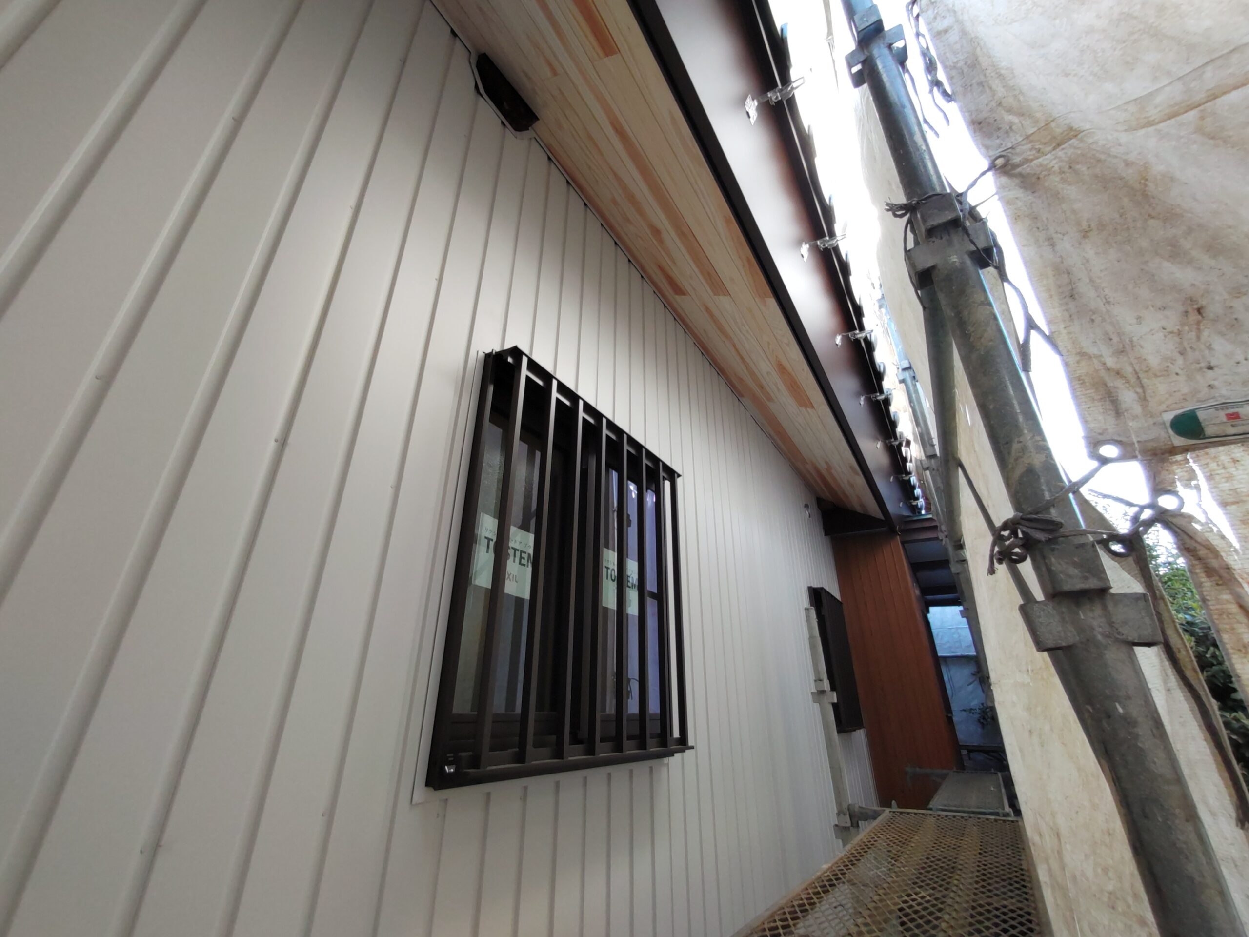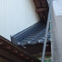 外装仕上げにy江板金さんが現場にやってきています。新築工事と違って、ガルバリウム鋼板を張っていく面がまっすぐとは限らないのがリフォームの難しいところ。軒下から昔の丸太の梁の小口も見えています。下地の中で切り落とすよりは当時の名残として露出させてみました。y江さんは器用に回り込んで張ってくれています。