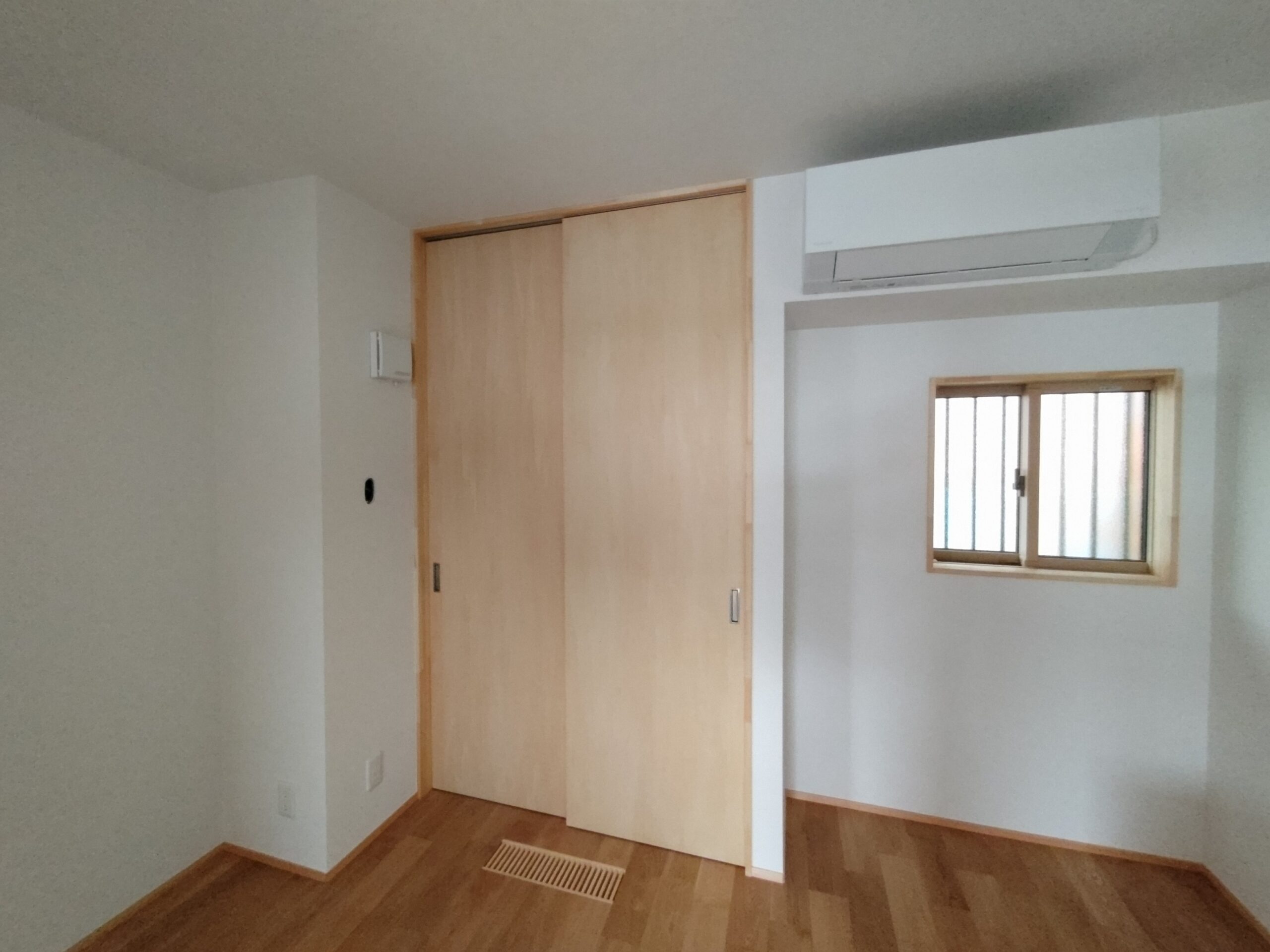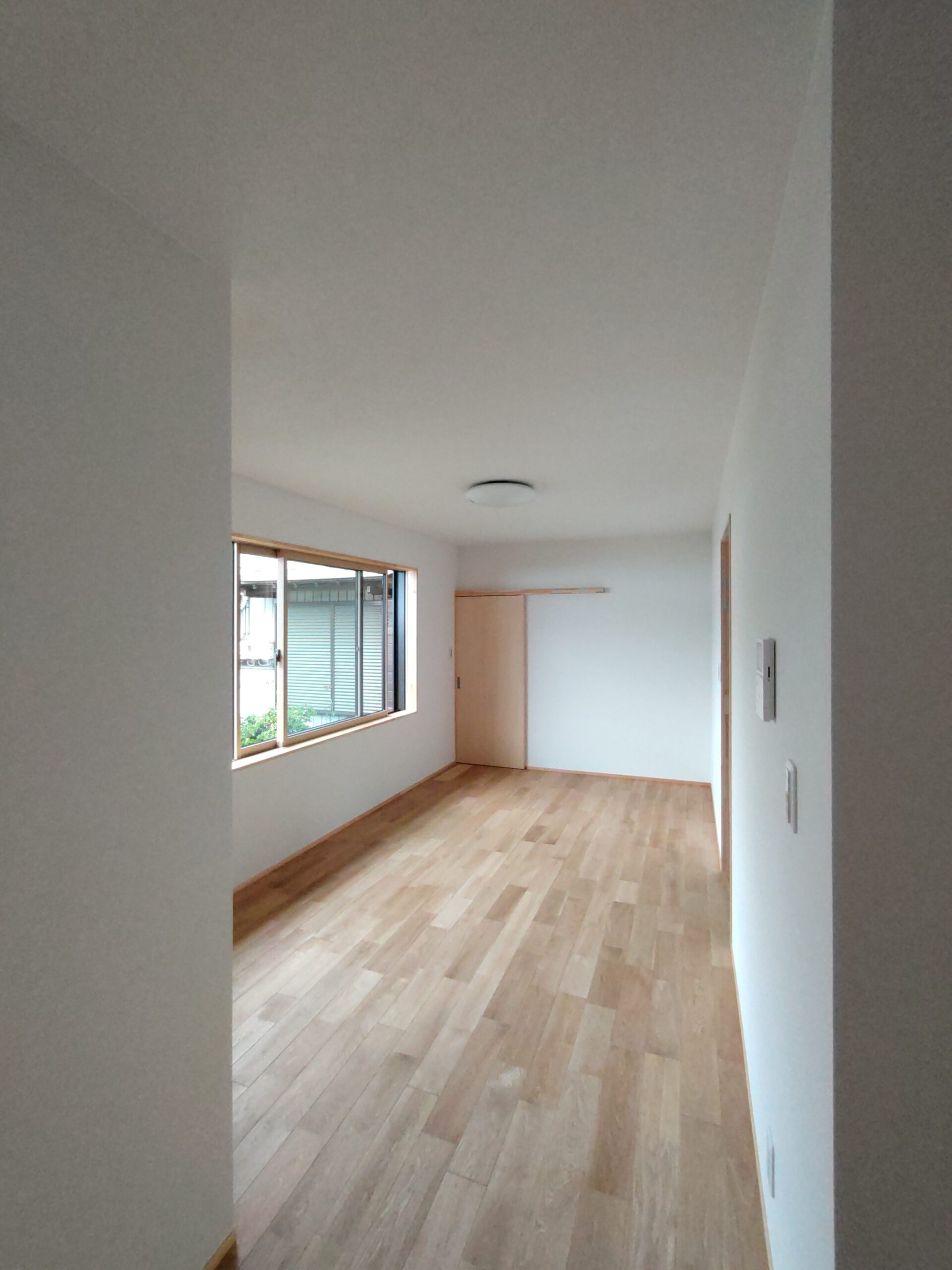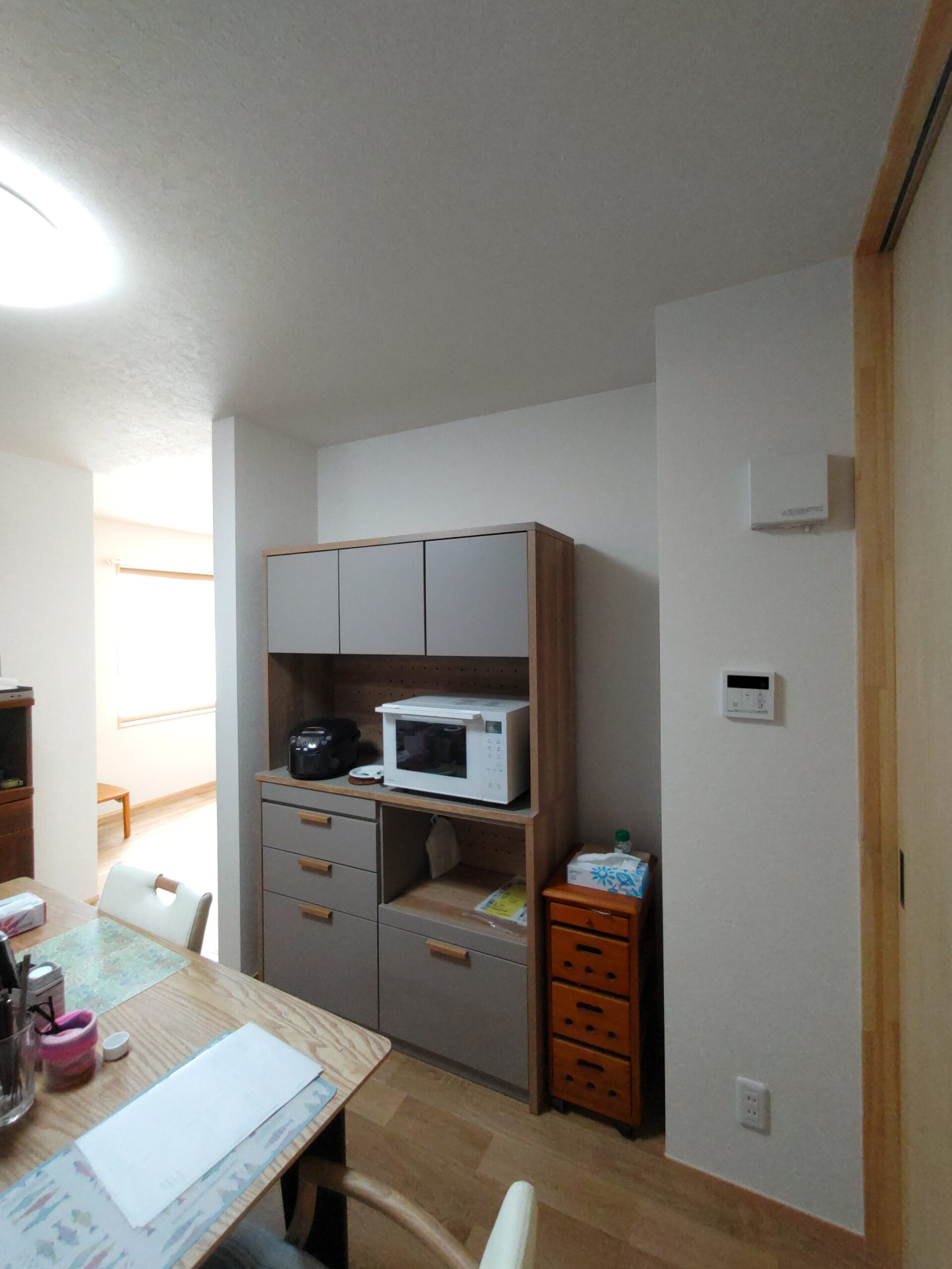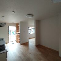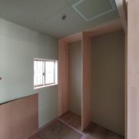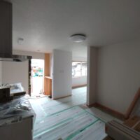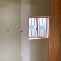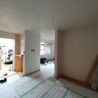 クロス工事が終了しました。貼る面積が少ないことに加え、品番も1種類でしたのでそこまで手間暇はかからなかったようです。本日は水道工事JKSのa野さんや電気工事f電気のh場さんが来場して外部配管や内部スイッチ等の仕上を行っています。
