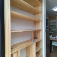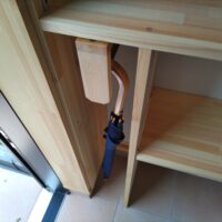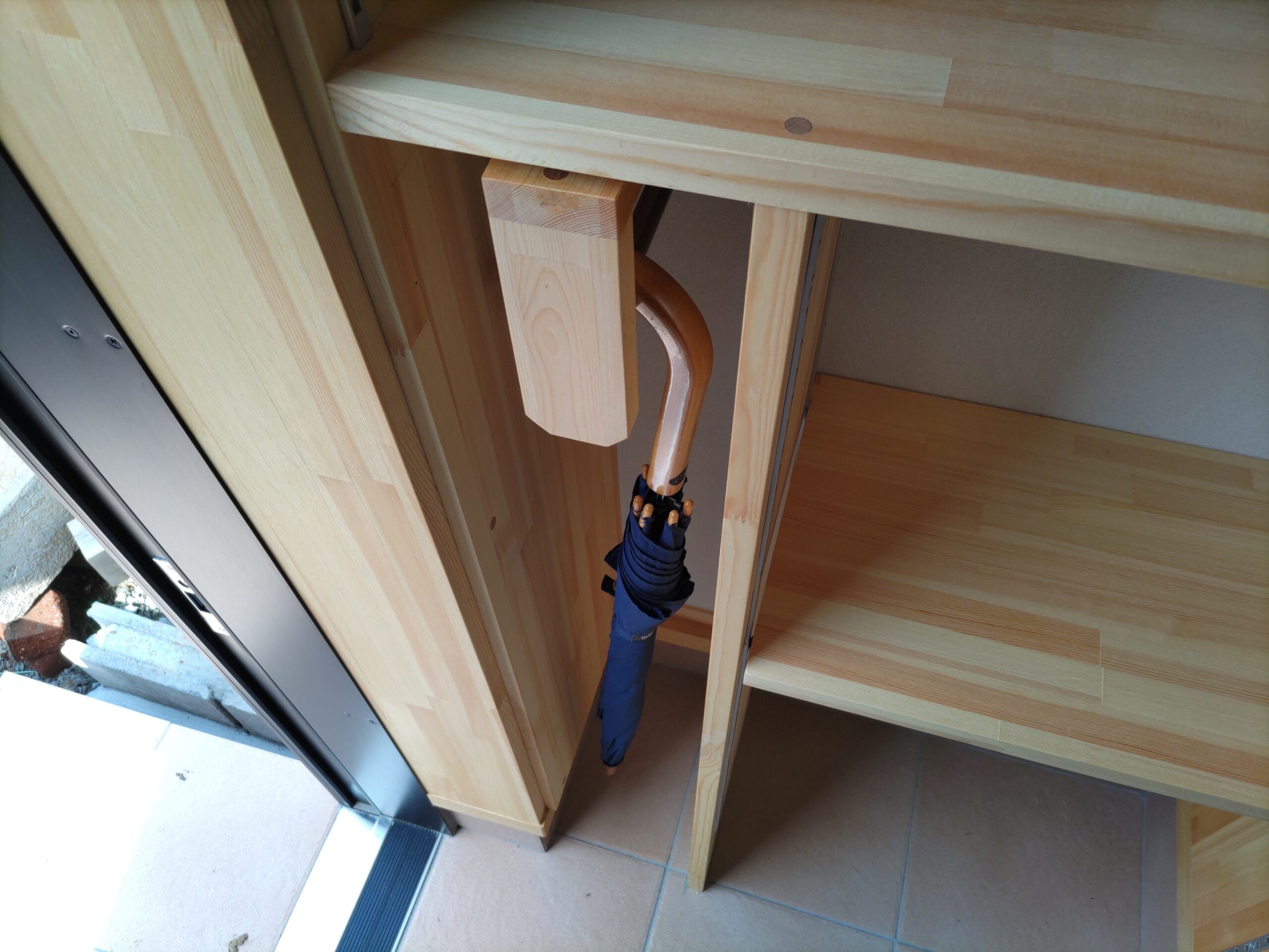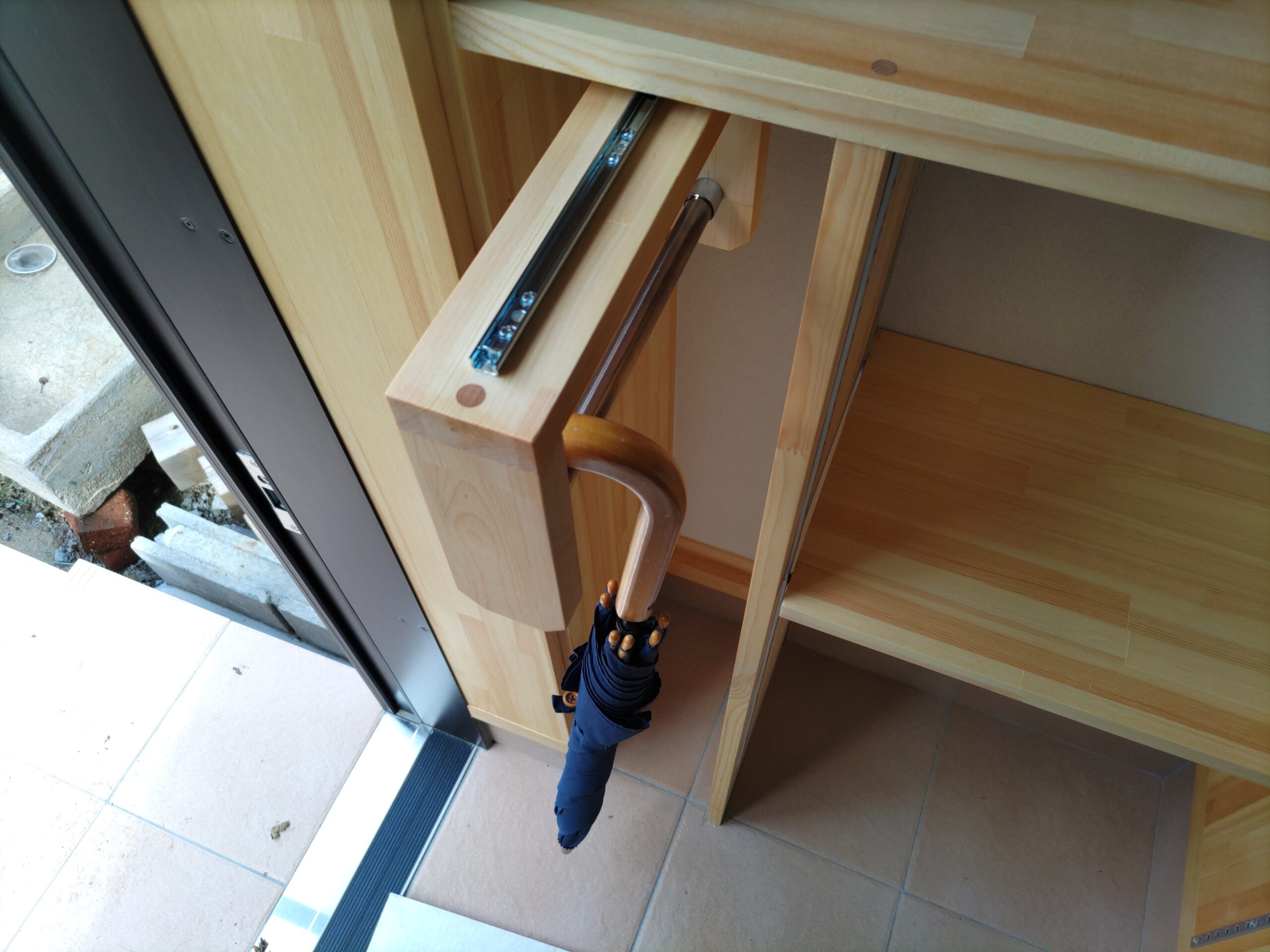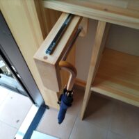 玄関の棚は玄関框の位置と下足の寸法を勘案して縦間仕切の位置を決めますが、少しスペースが余ることもあります。下足を余裕を持たせて置くのも良いですが、筆者は傘置場にする事があります。下足入れの奥行きはだいたい300㎜とることが多いですが、傘はそこまで大きくありませんので奥の寸法が余ることがあります。そこで手前に引き出せるパイプを製作して奥行方向に2~3本多く掛けられるようにしています。