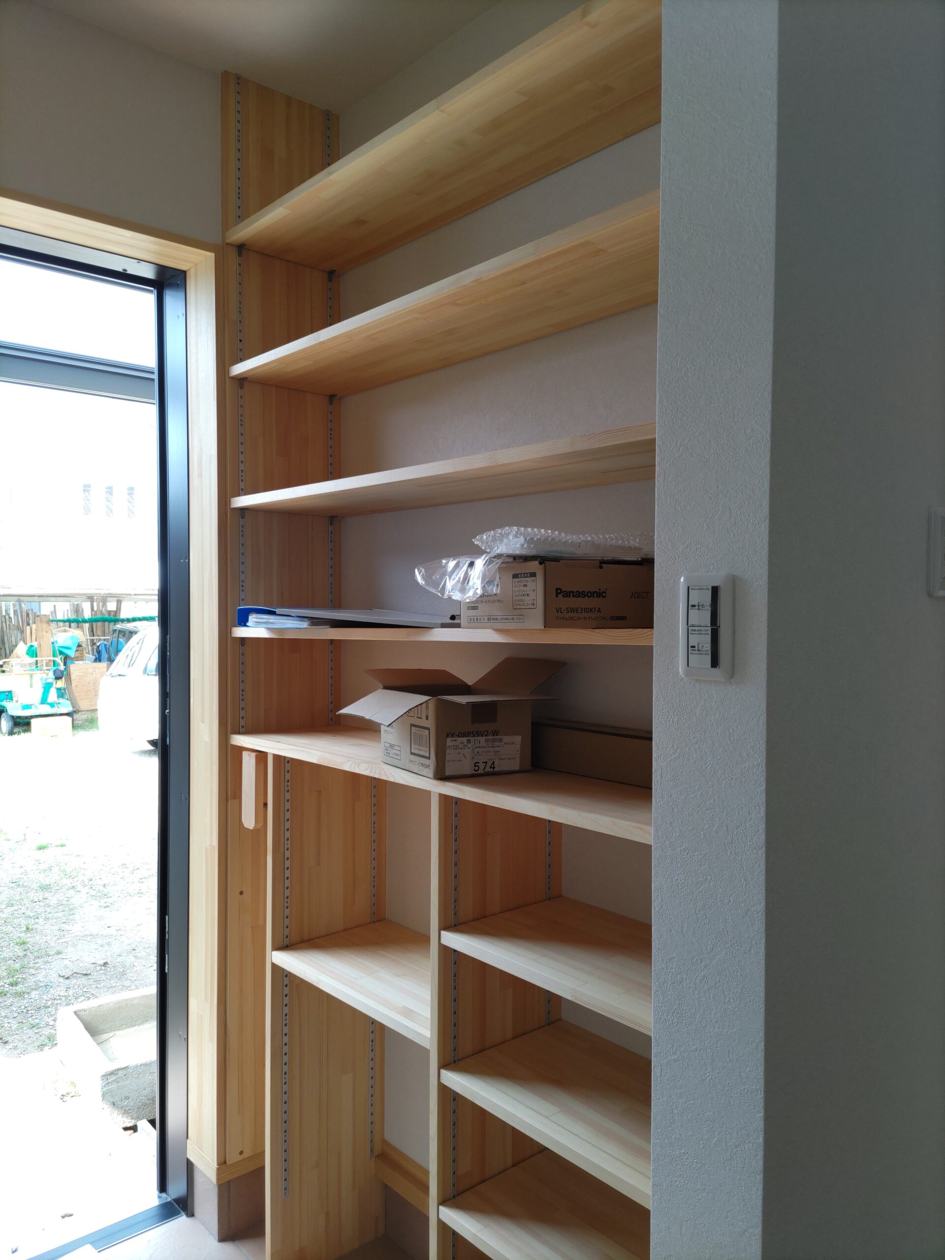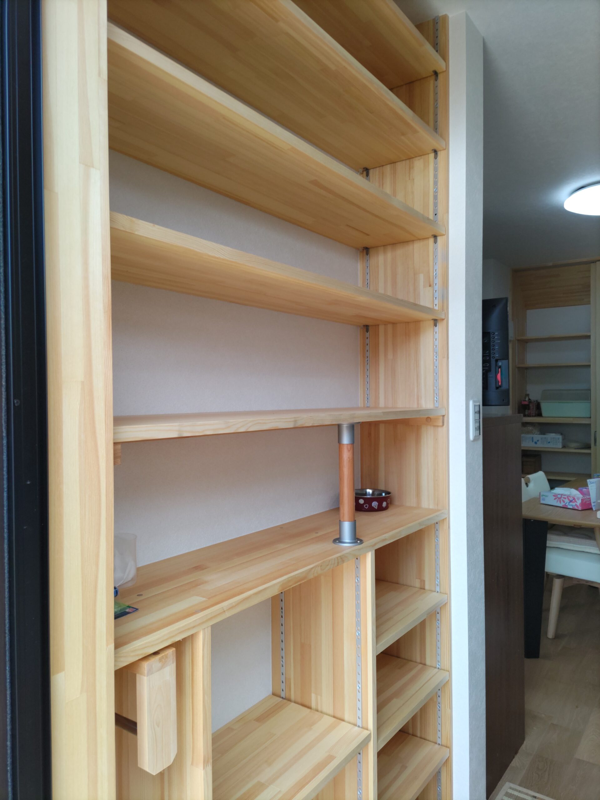 玄関の段差を上り下りする際に手摺が欲しい、しかし壁面には一面の可動棚があり、取り付ける場所がない、という事で思案して手摺を取り付けました。下段は固定棚なのですがその上からは可動棚となり手摺の上端を固定できません。そこで可動棚の1段目を固定棚として加工して手摺上端を固定することにしました。これにより手摺を持って安全に上り下りができます。