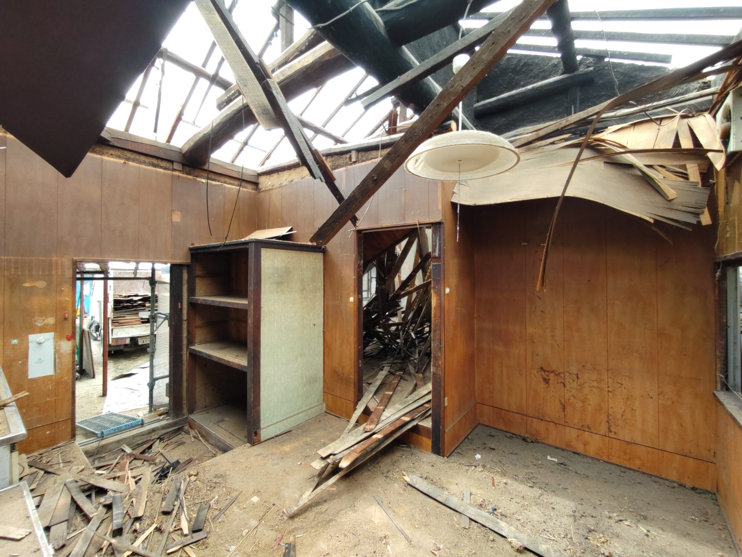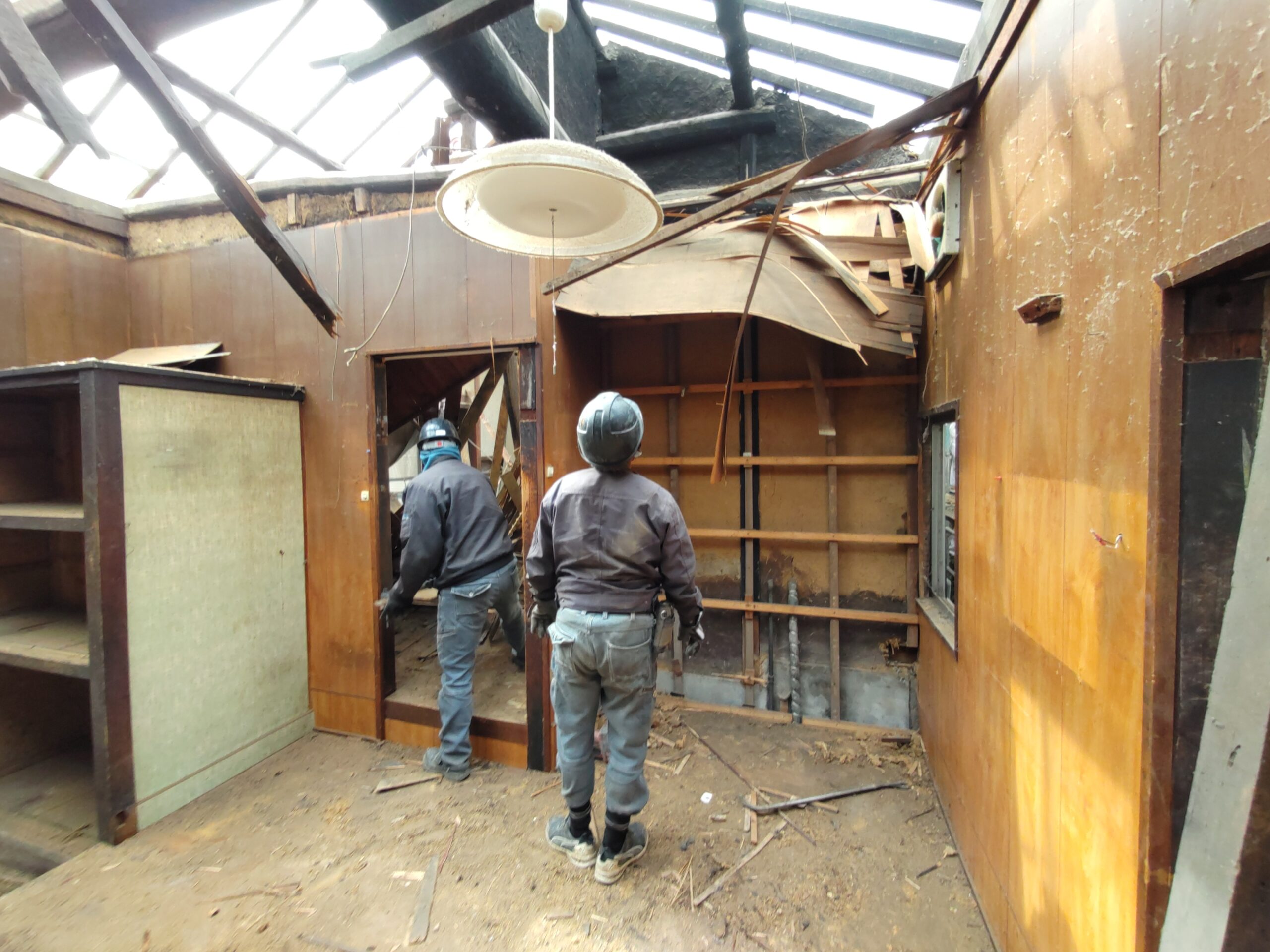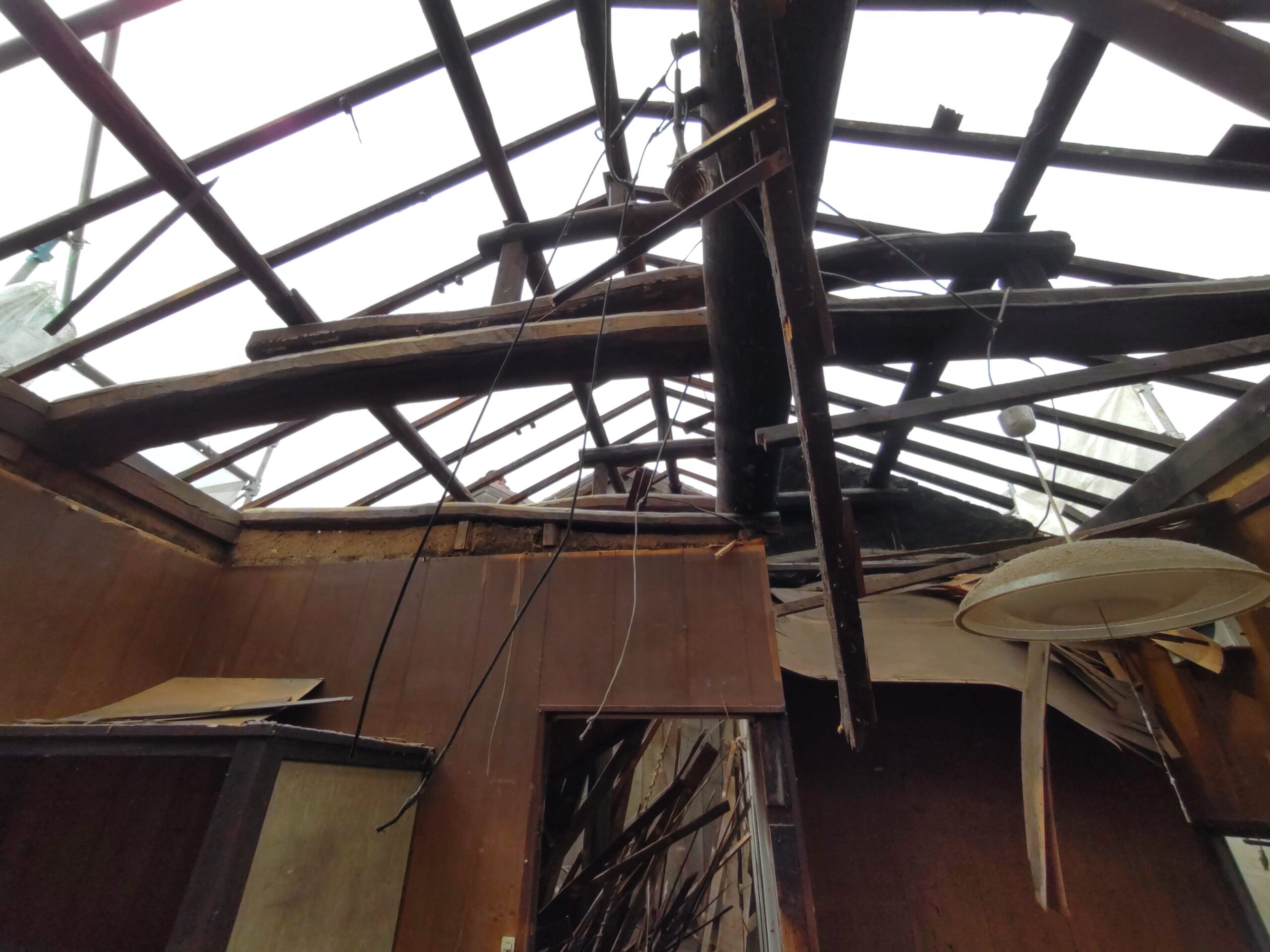 解体工事がスタートしました。屋根瓦、屋根土、野地板を下したので一気に明るくなりました。