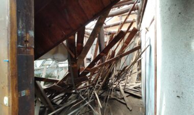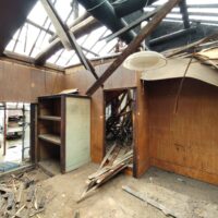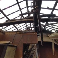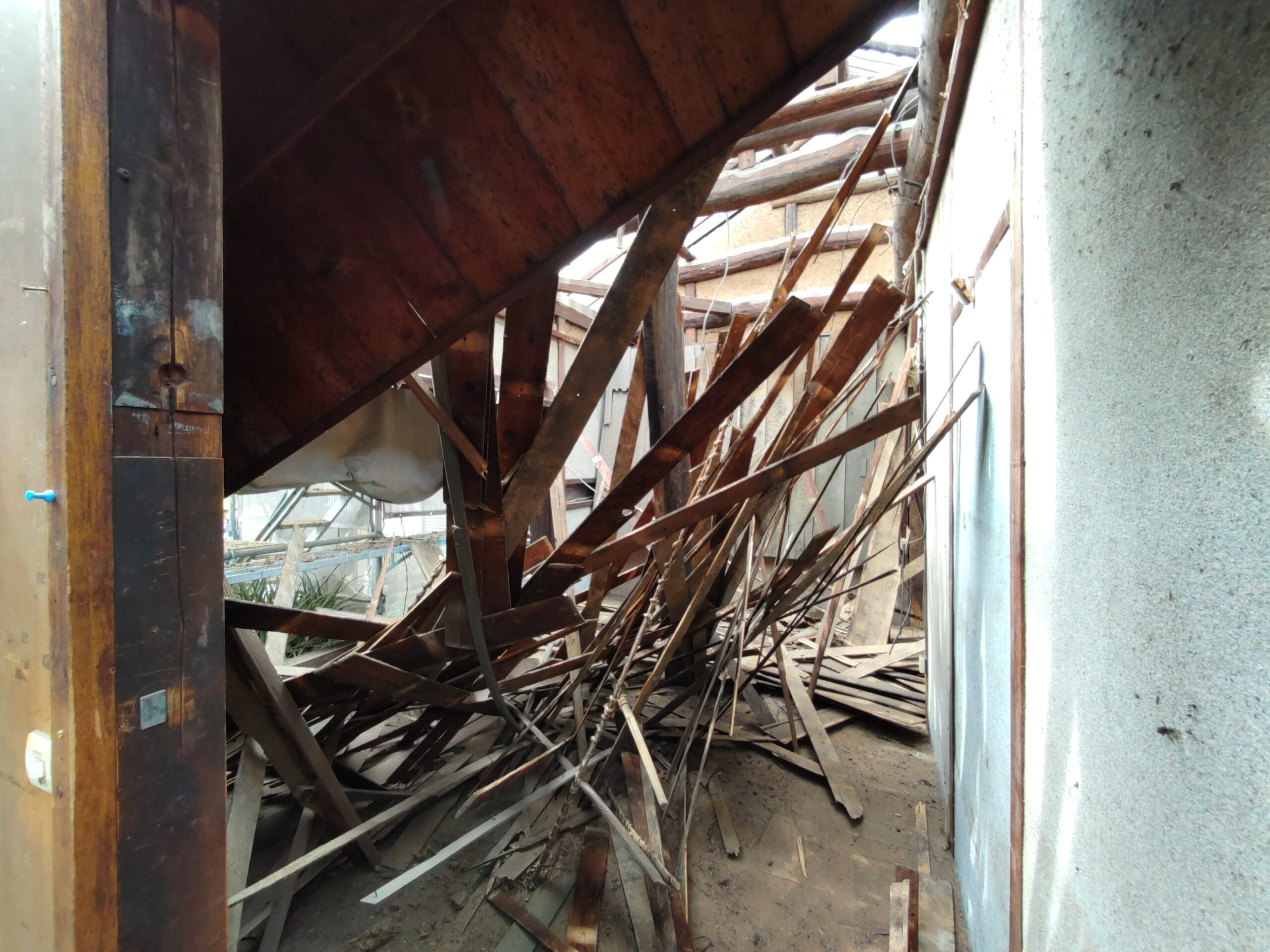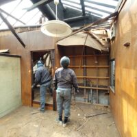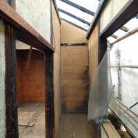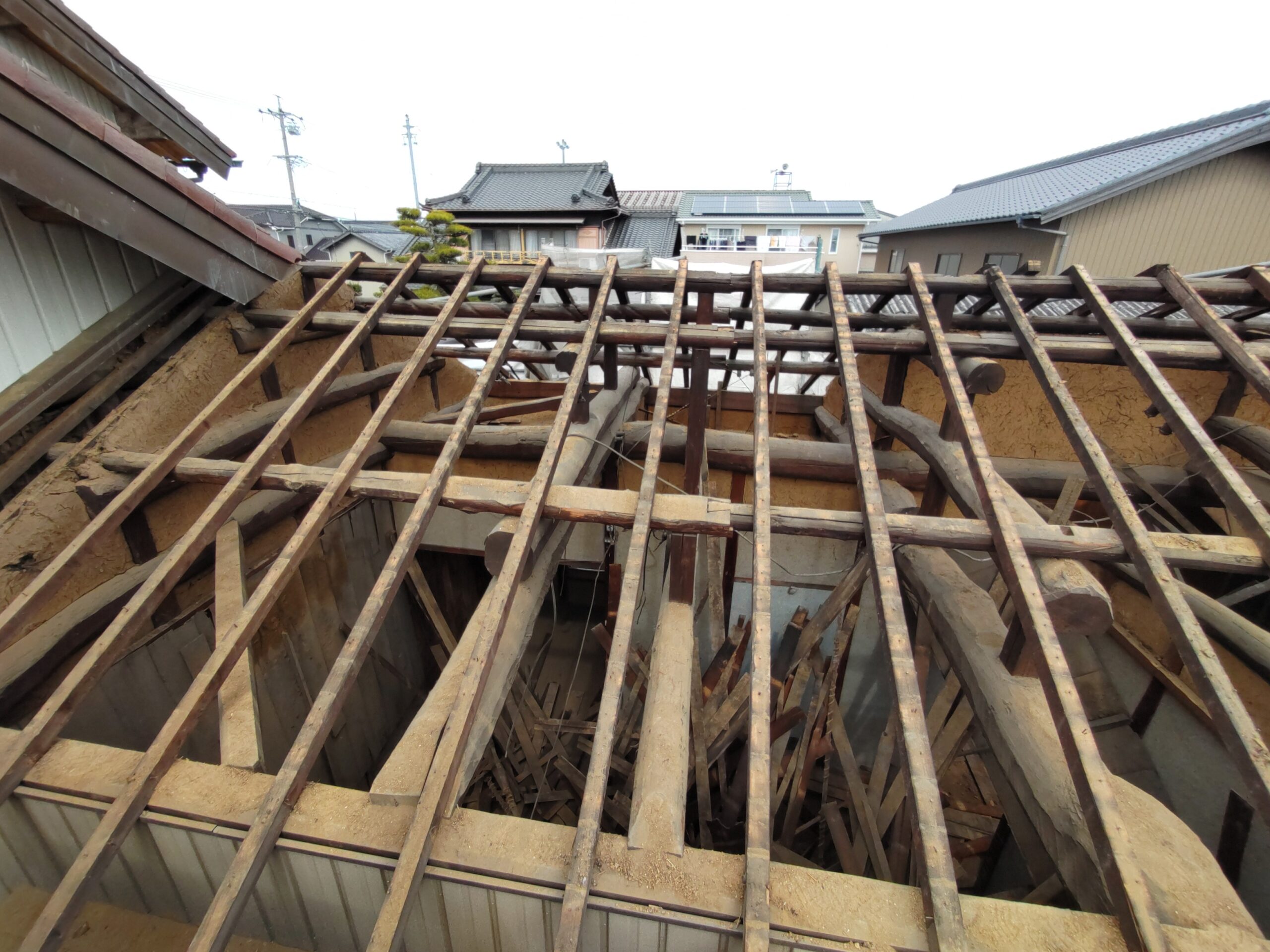 解体工事がスタートしました。屋根瓦、屋根土、野地板を下したので一気に明るくなりました。