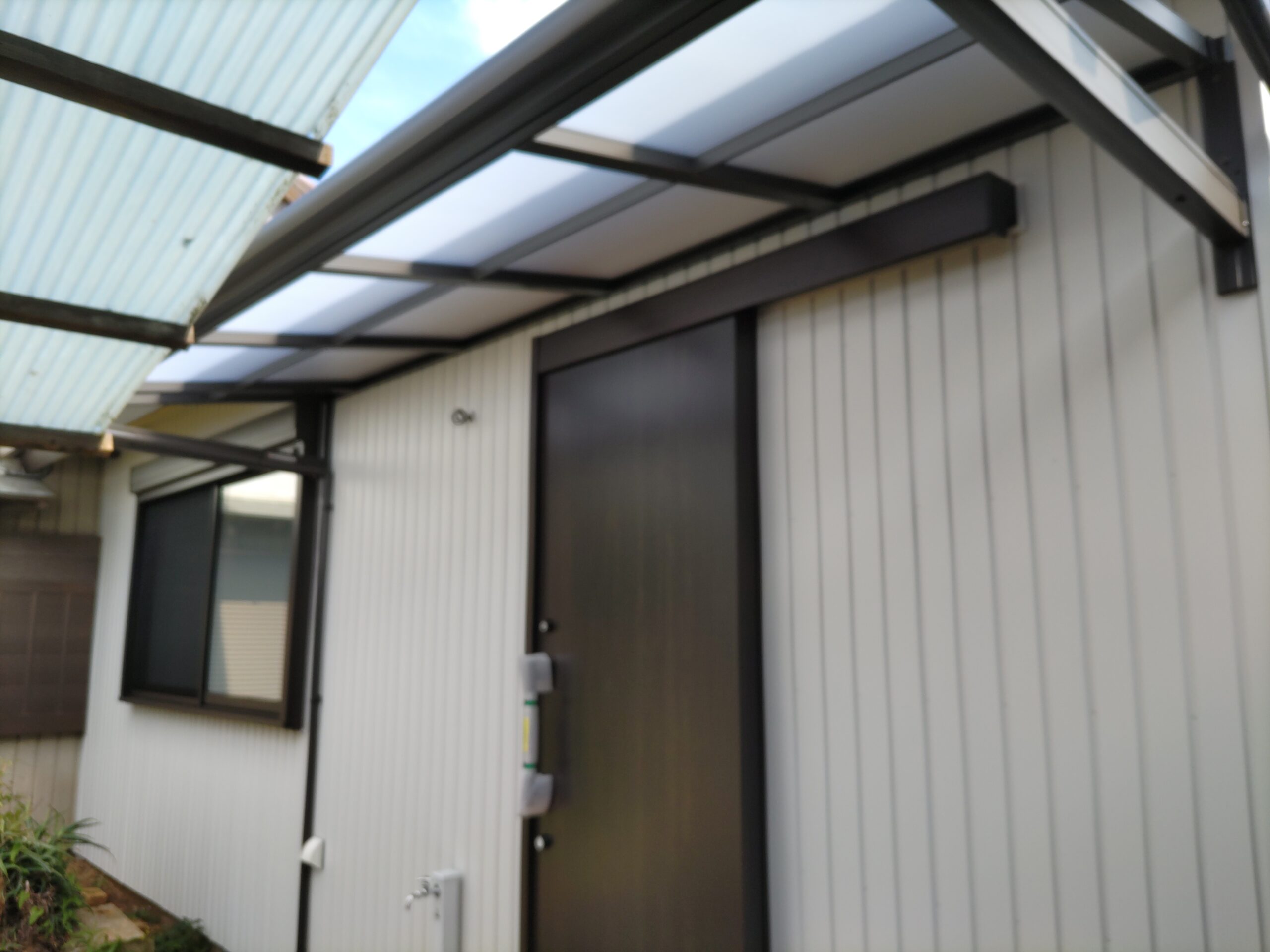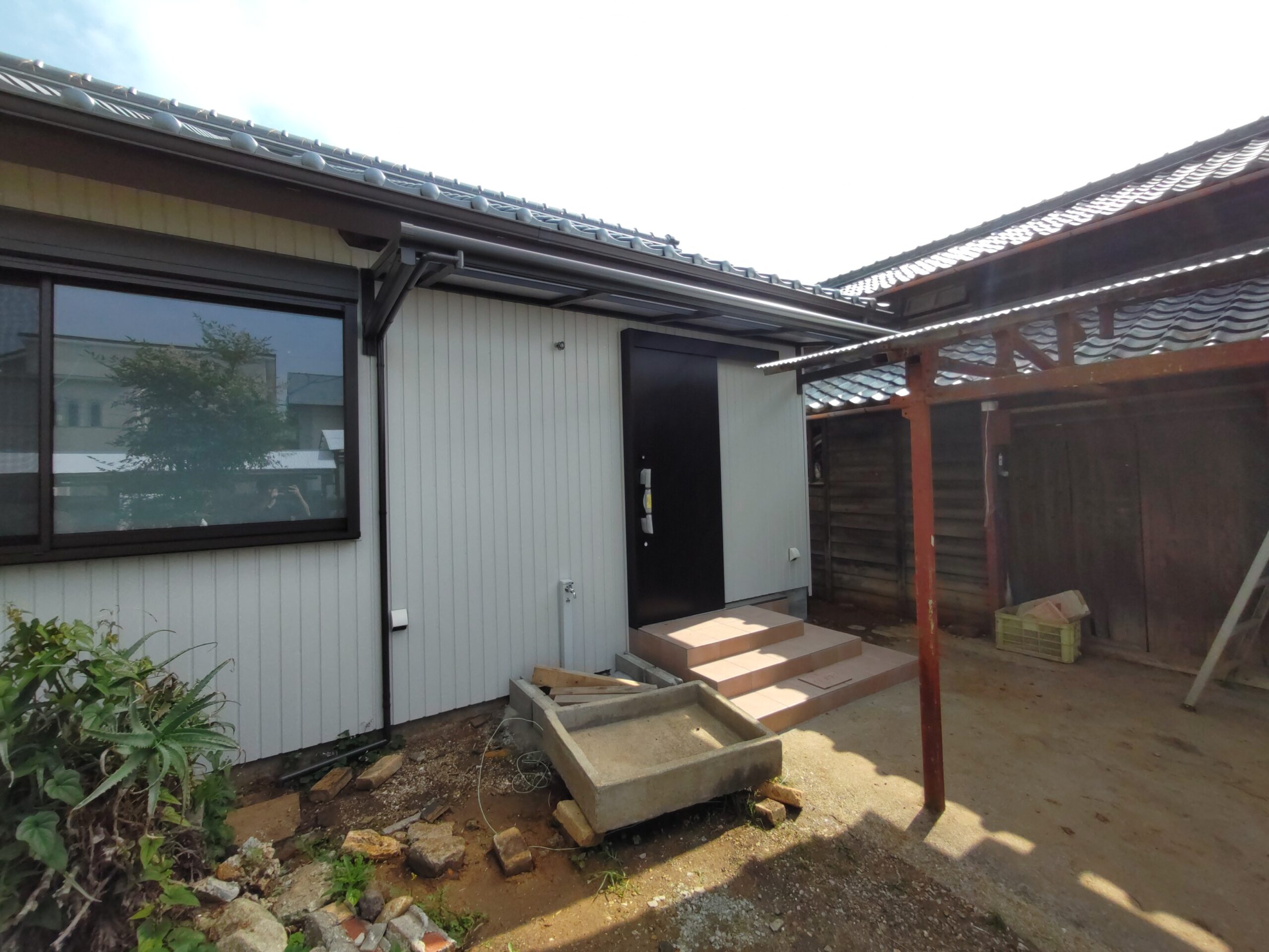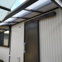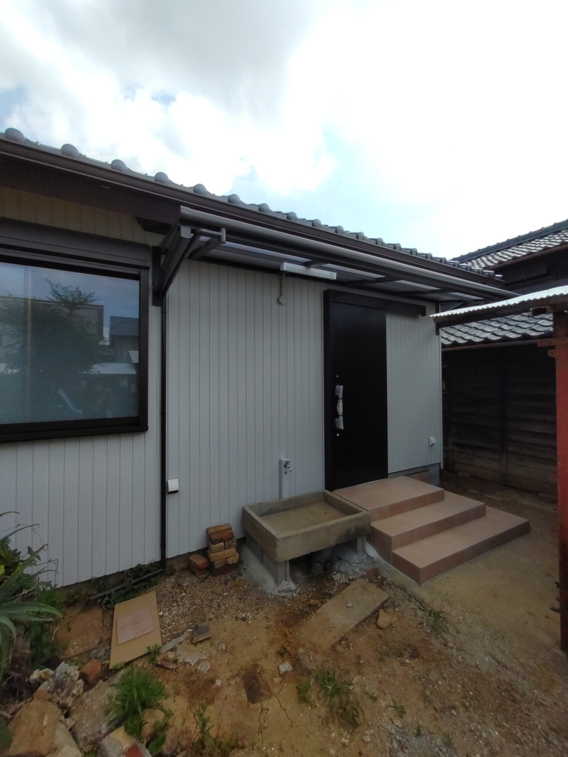 玄関上の軒は少し短く、以前までは手前の車庫の波板が伸びていたので玄関前はカバーできていましたが、リフォームに際し波板を少し縮めたのでポーチ上部にテラス屋根を取り付けられました。一緒に玄関脇に設置するコンクリートの水洗い盤で野菜が洗えるようにとポーチ屋根を少し左側へ伸ばして設置しました。