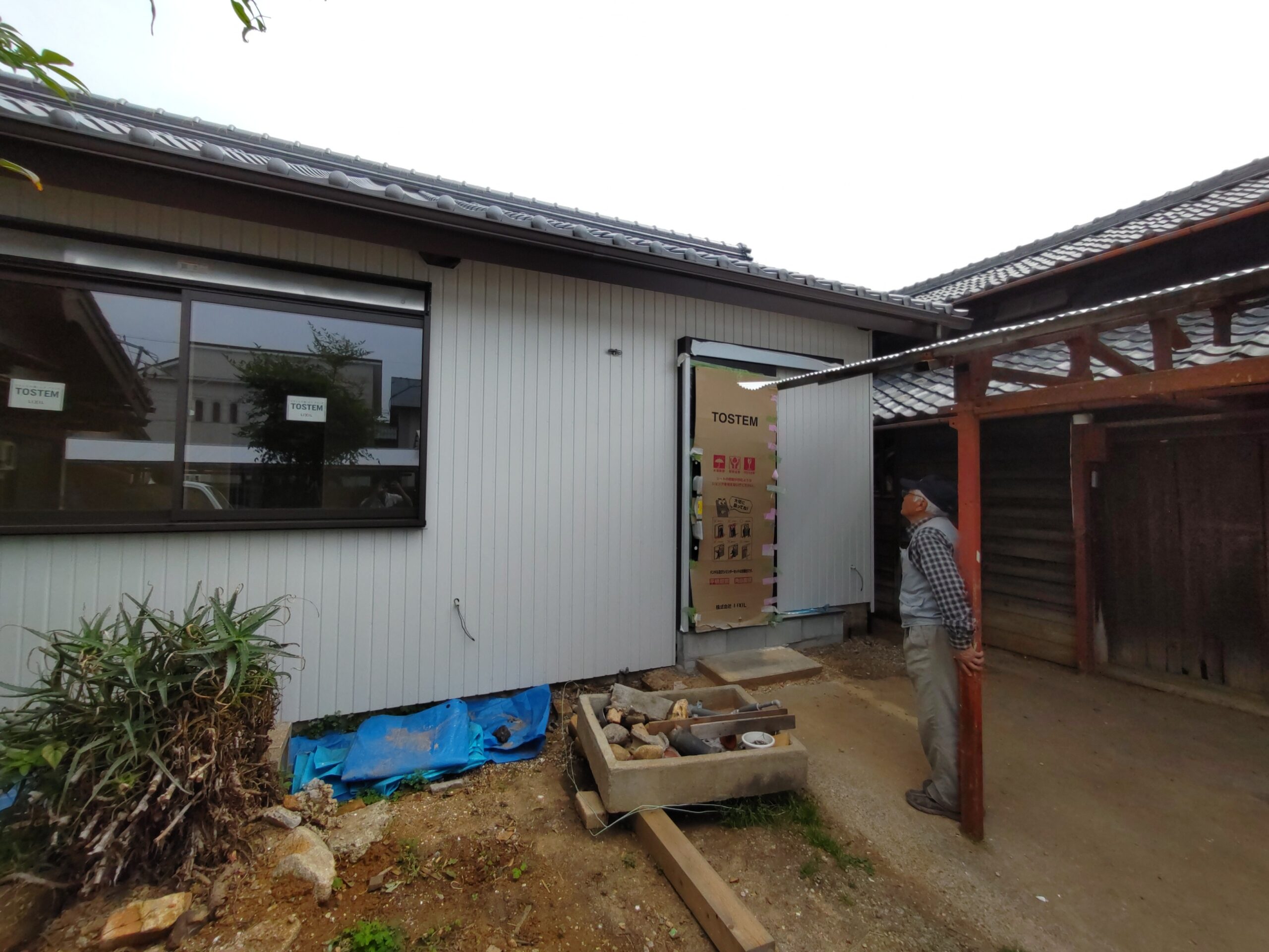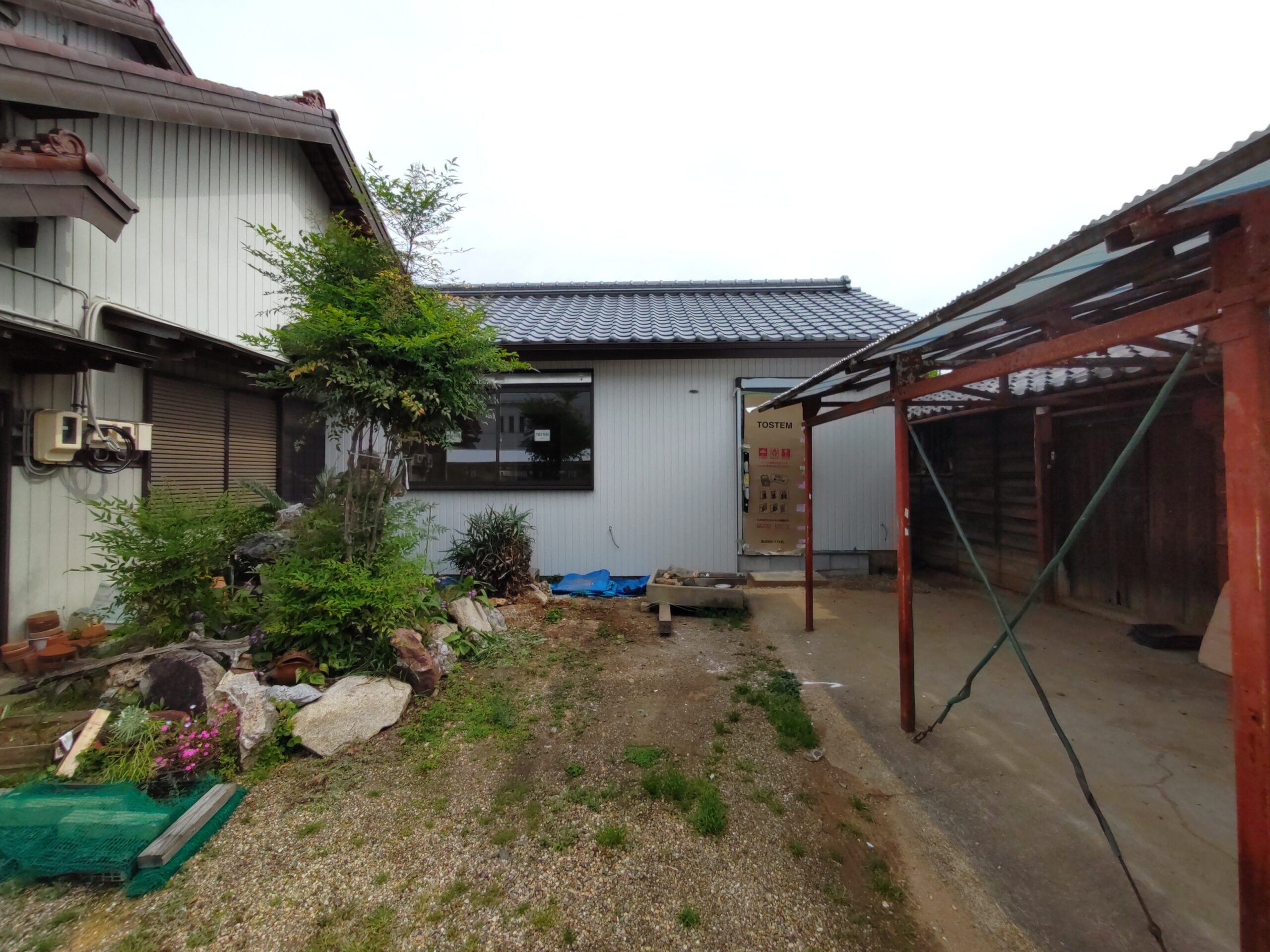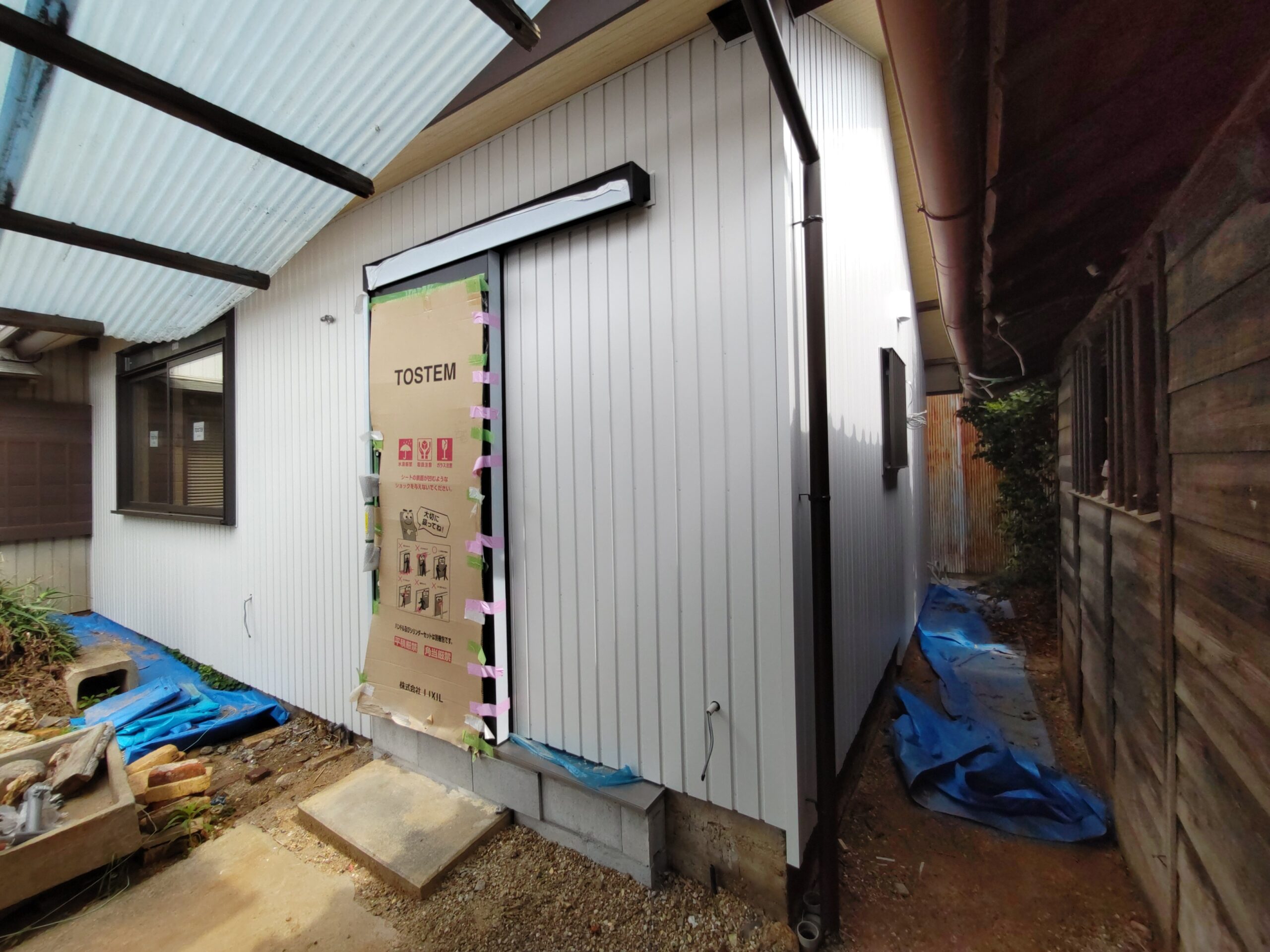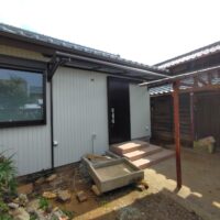 玄関上の軒は少し短く、以前までは手前の車庫の波板が伸びていたので玄関前はカバーできていましたが、リフォームに際し波板を少し縮めたのでポーチ上部にテラス屋根を取り付けられました。一緒に玄関脇に設置するコンクリートの水洗い盤で野菜が洗えるようにとポーチ屋根を少し左側へ伸ばして設置しました。