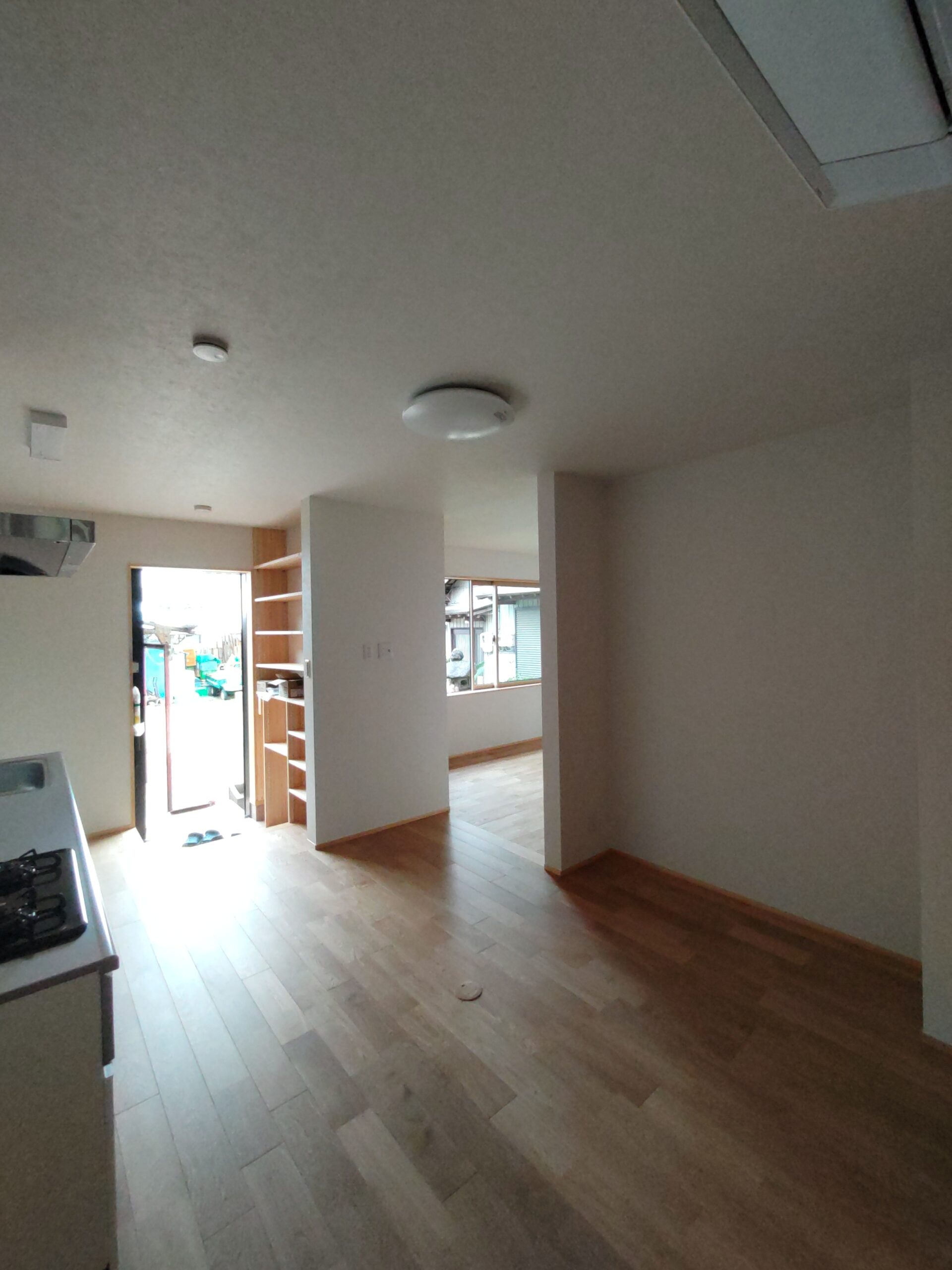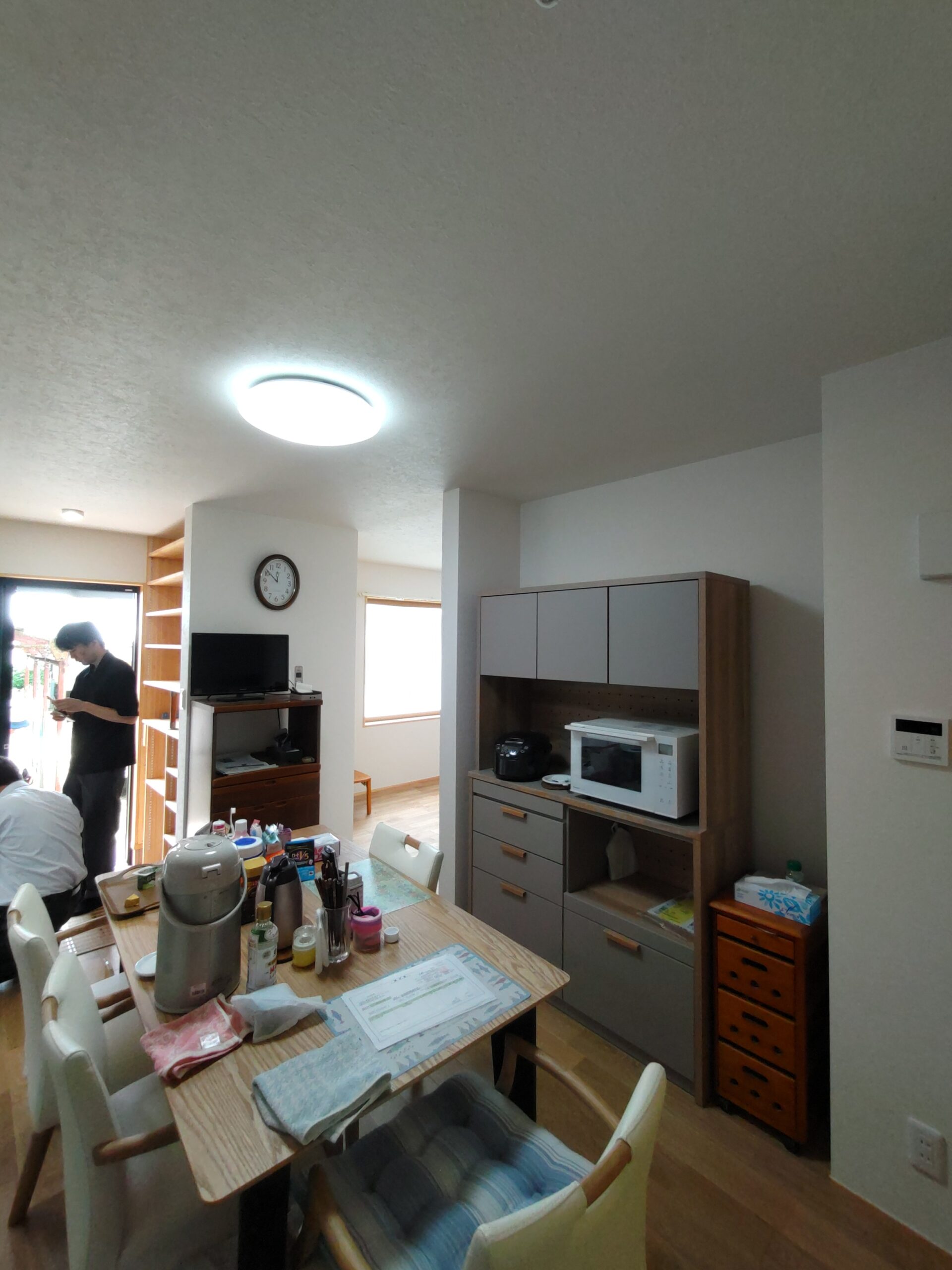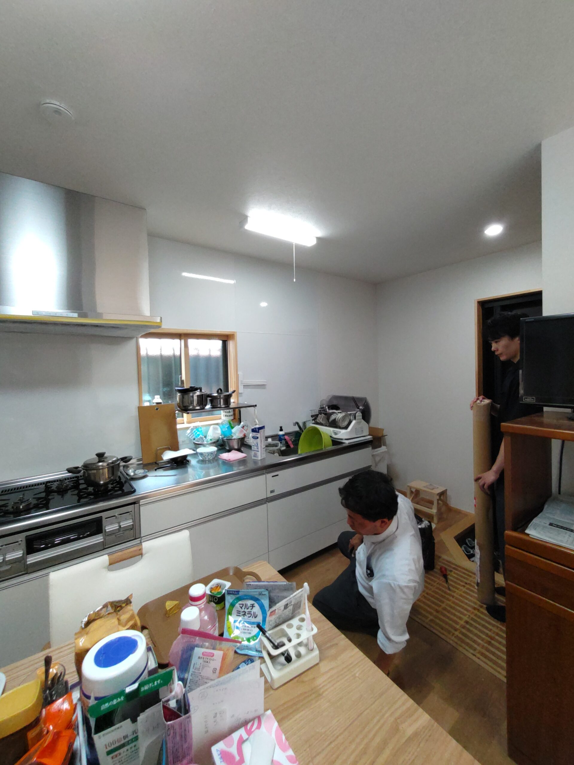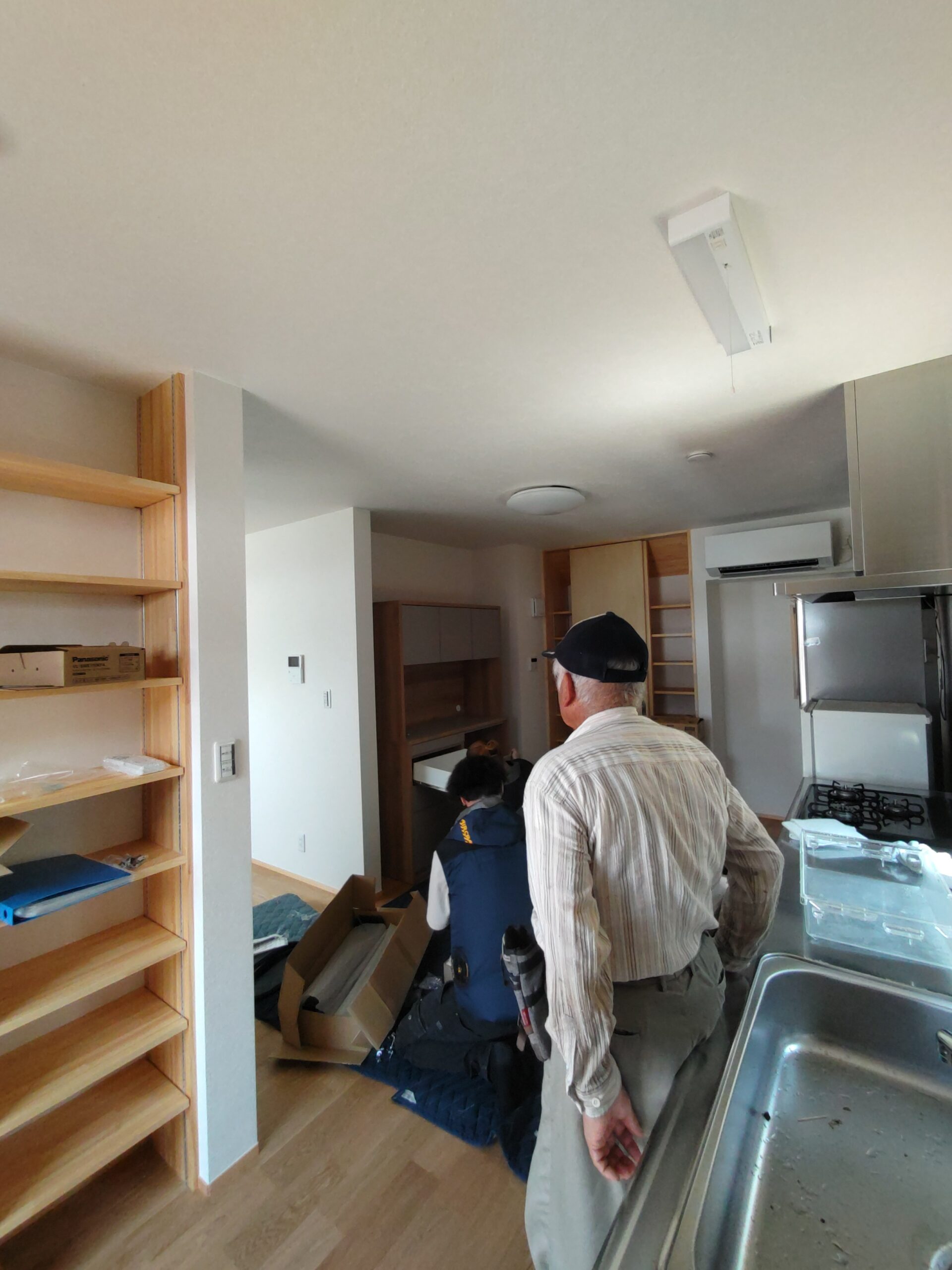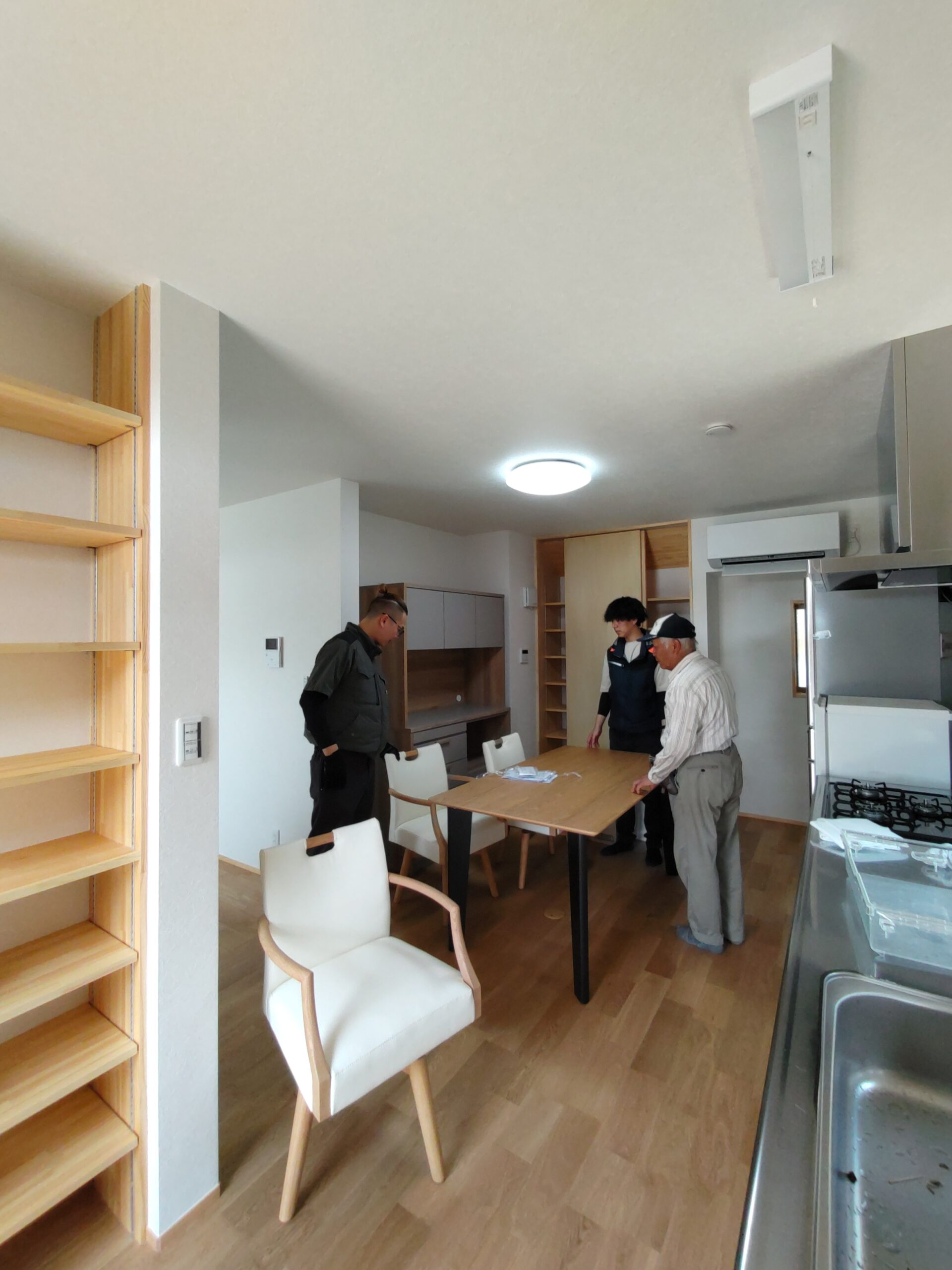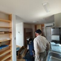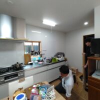 お引き渡し直前、ⅰ様が注文されていた家具調度品が届きました。業者さんによって搬入組み立て作業が行われています。解体前に別棟に仮置きしておいた冷蔵庫なども搬入し、だんだんと生活感が出てきています。