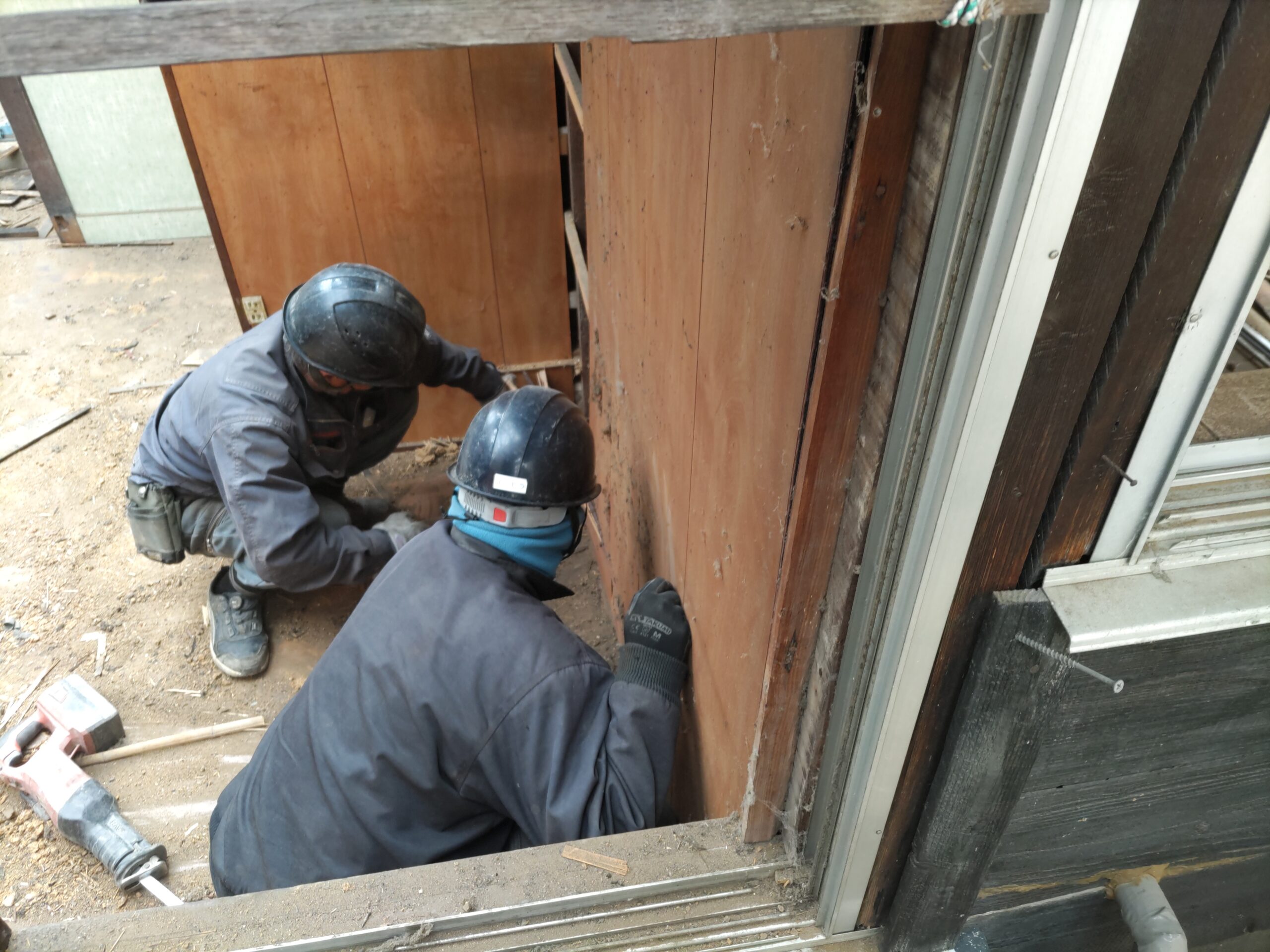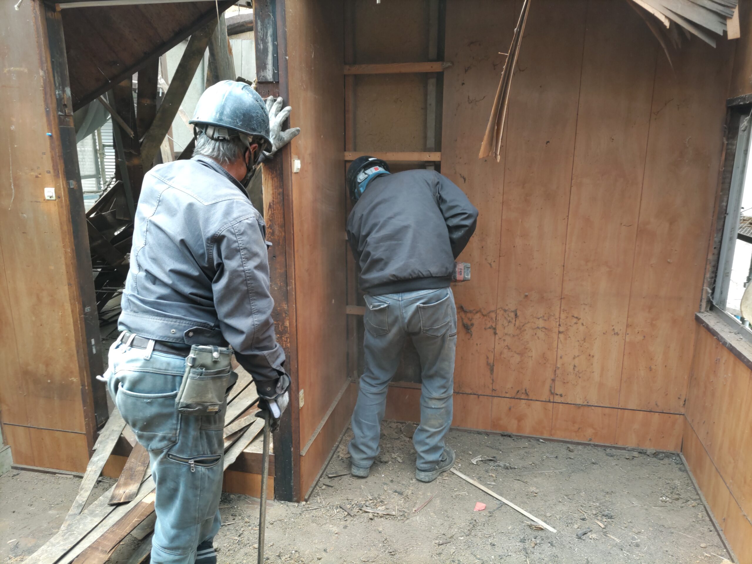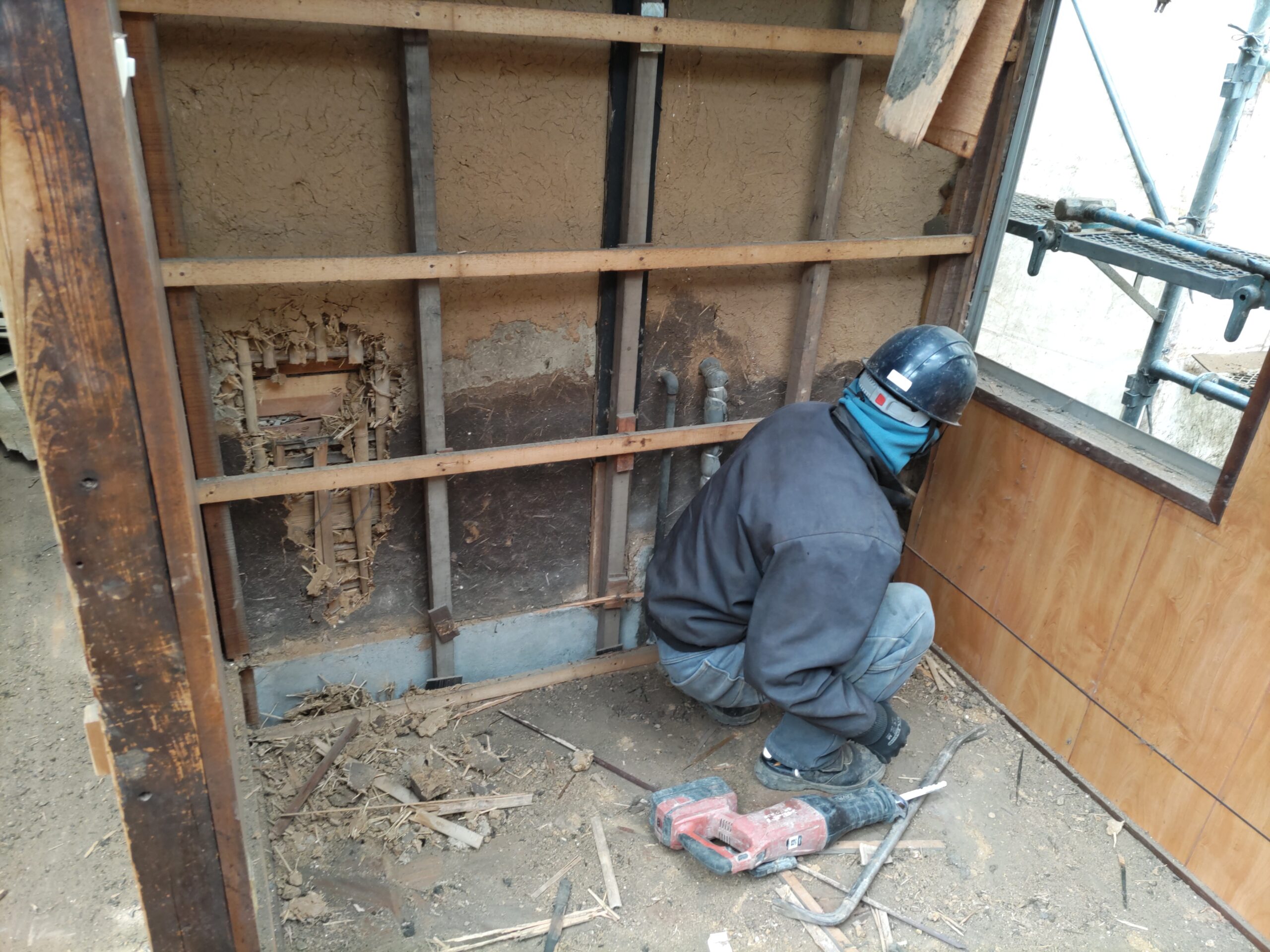 浴室裏の基礎の状況を調べたいので職人さんに壁仕上を引っぺがしてもらいました。何とか旧いコンクリートも解体できそうです。