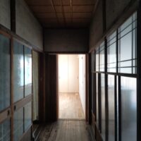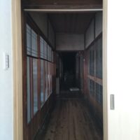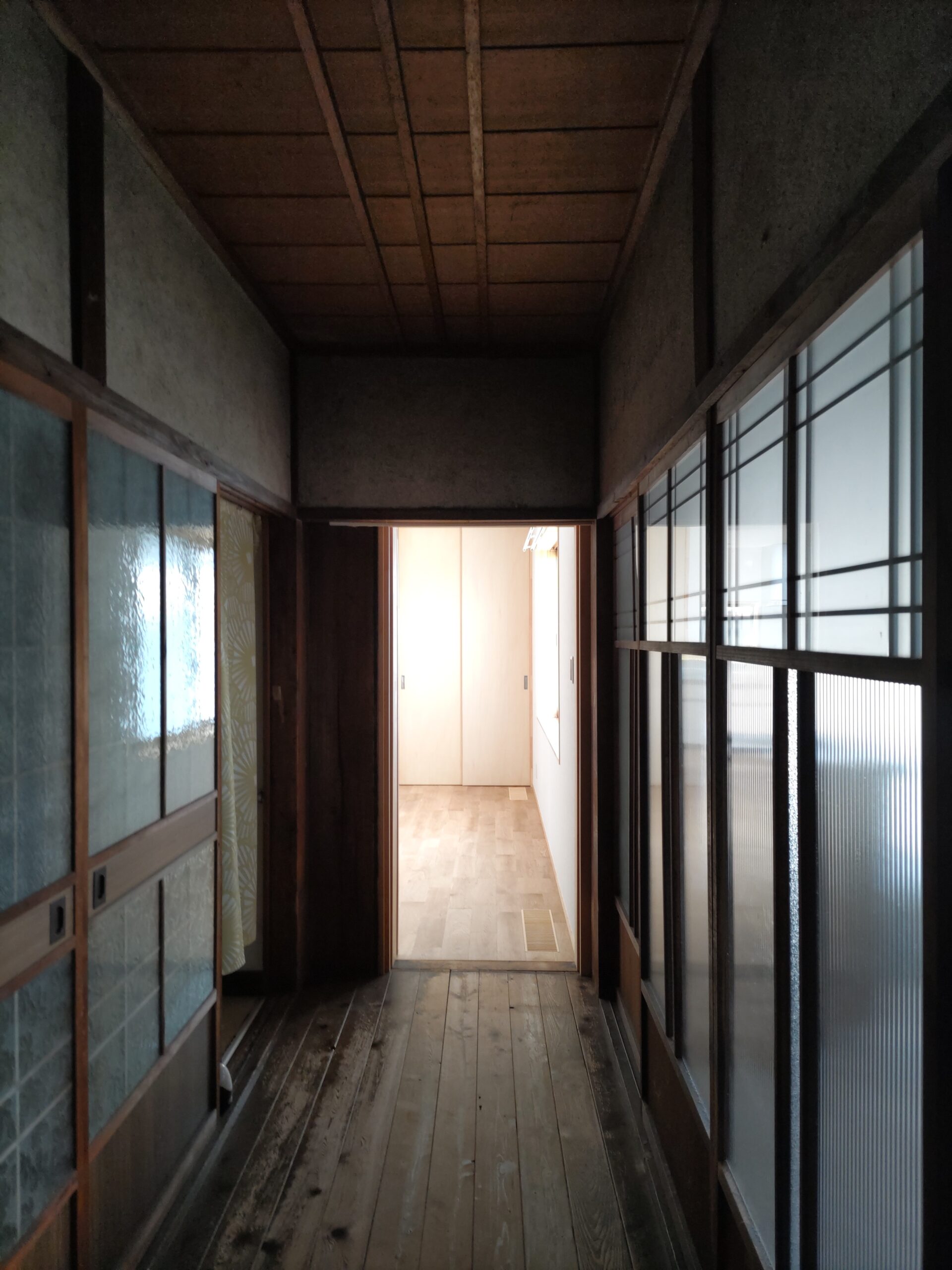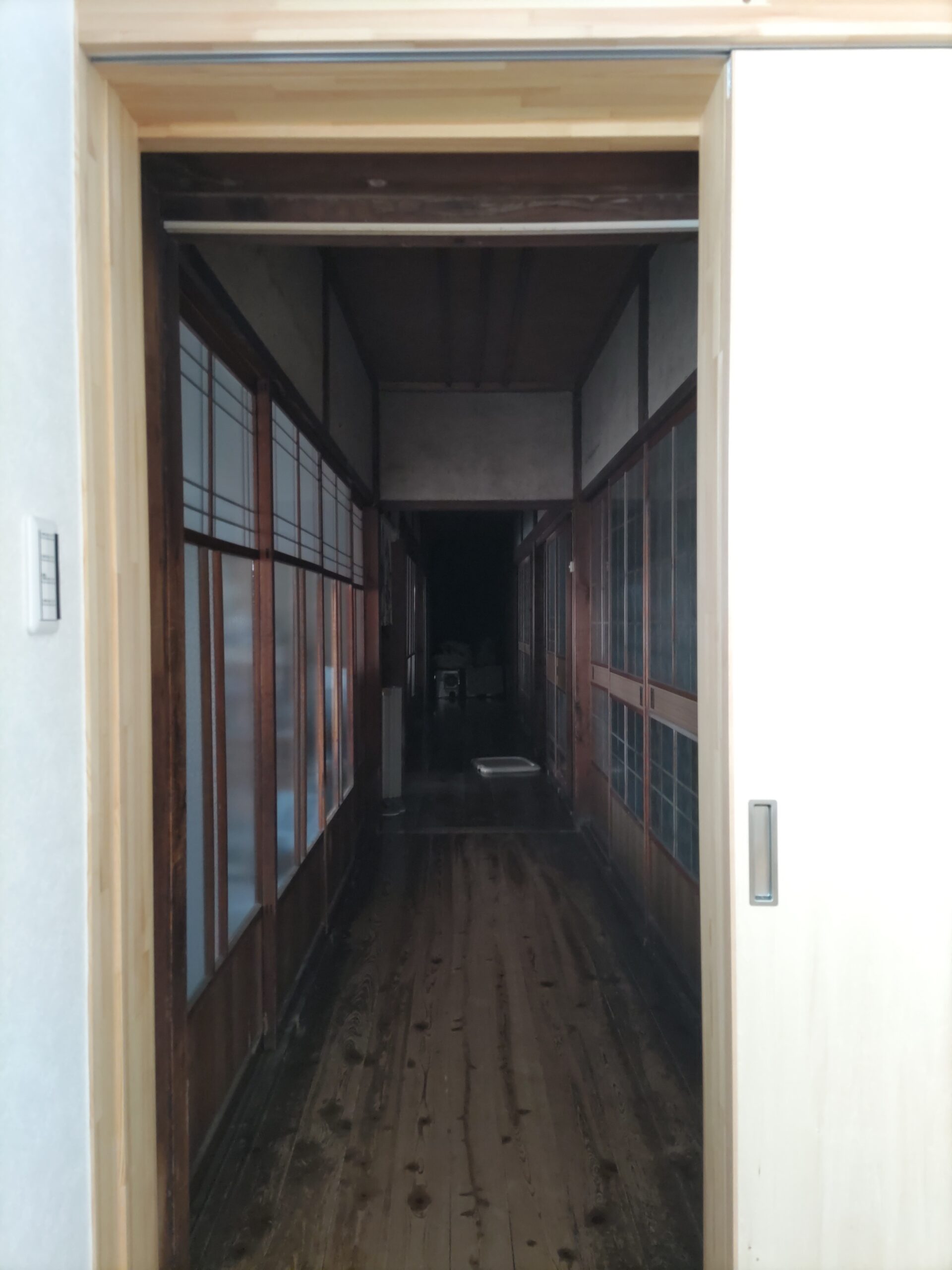 主屋との廊下接続部分、新旧の素材が劇的に切り替わる空間です。