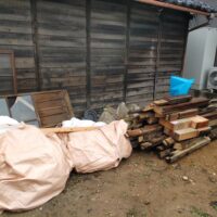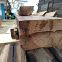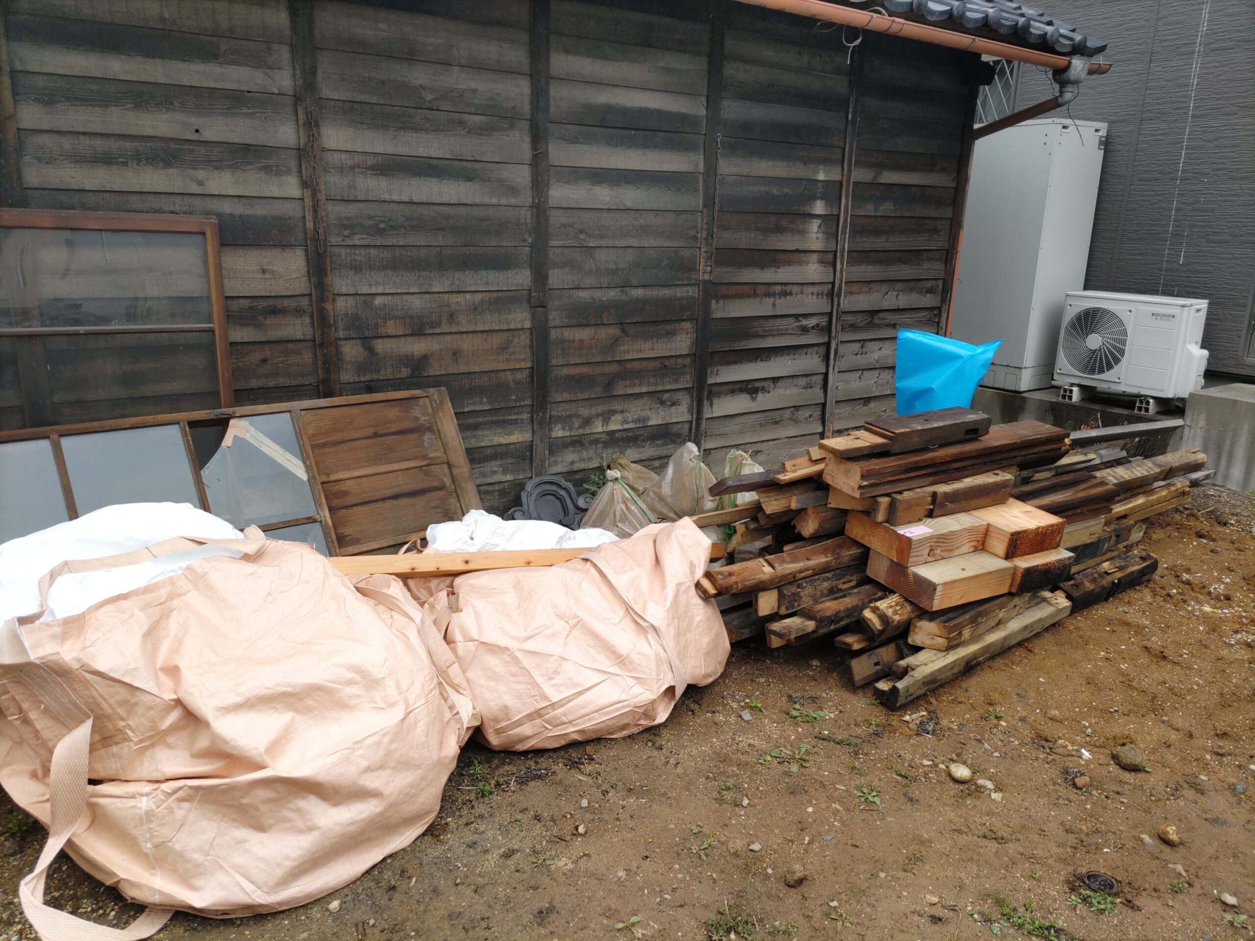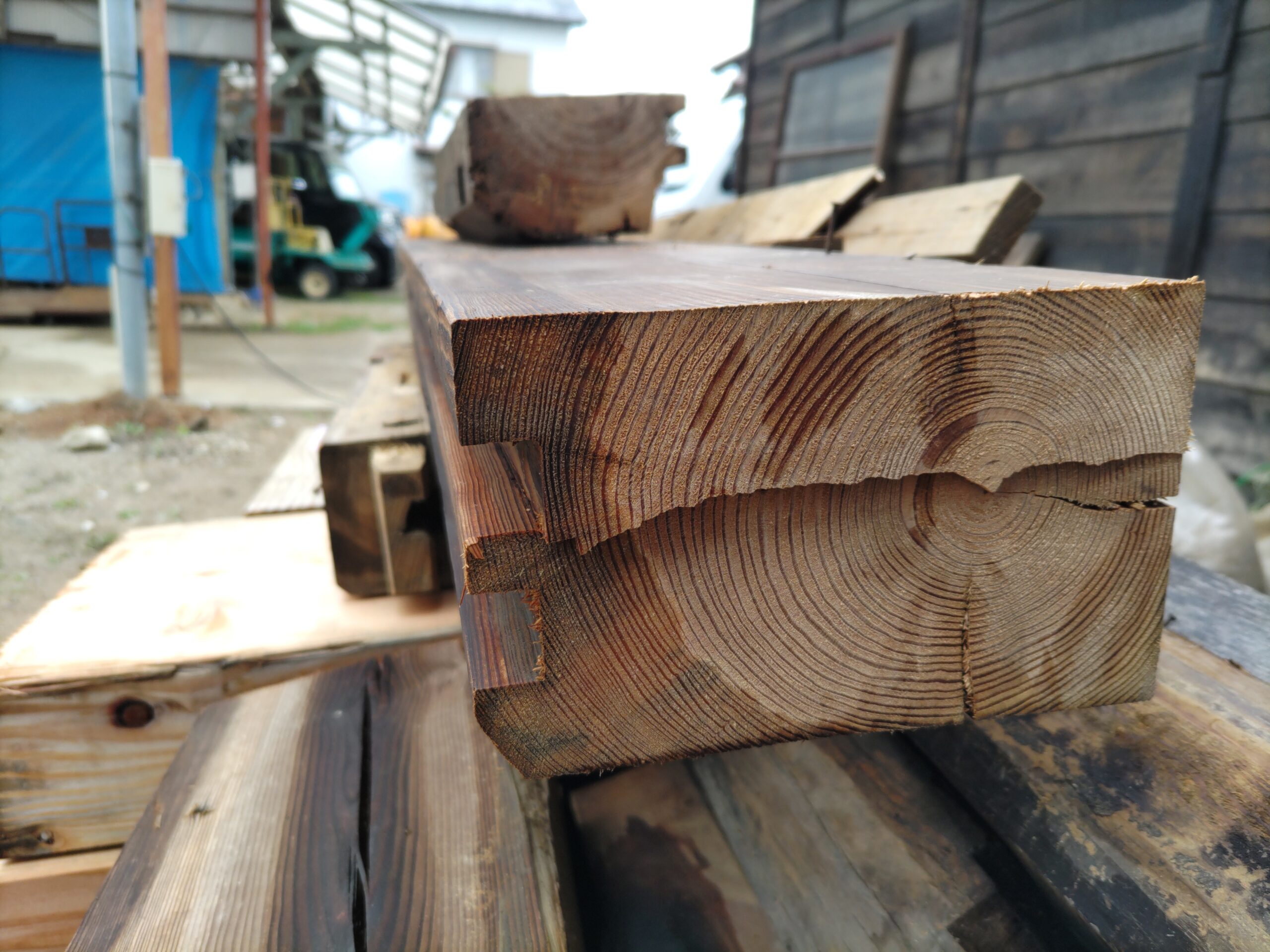 これまでこの住宅を支えてきた古材の数々。なんとも寂寥感にかられる光景ですが、丸鋸の切断面をみるとまだまだ新しい材料であることもわかります。